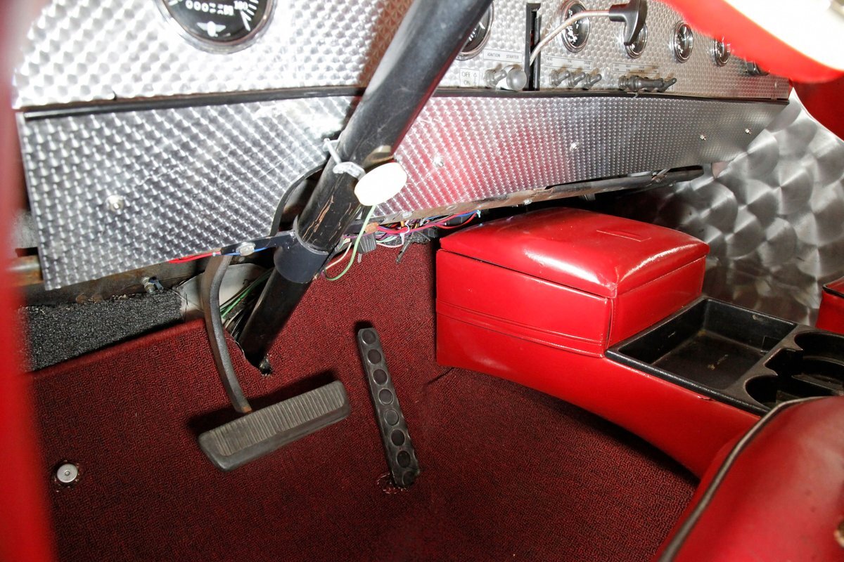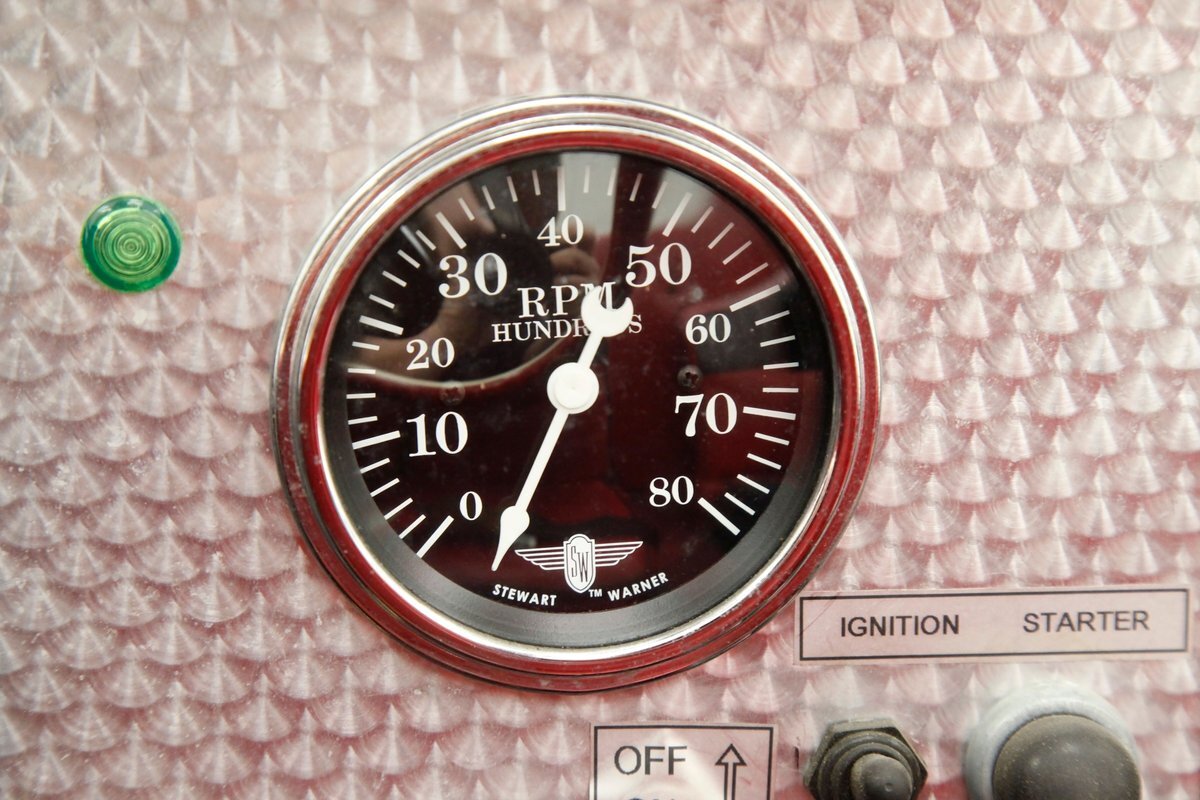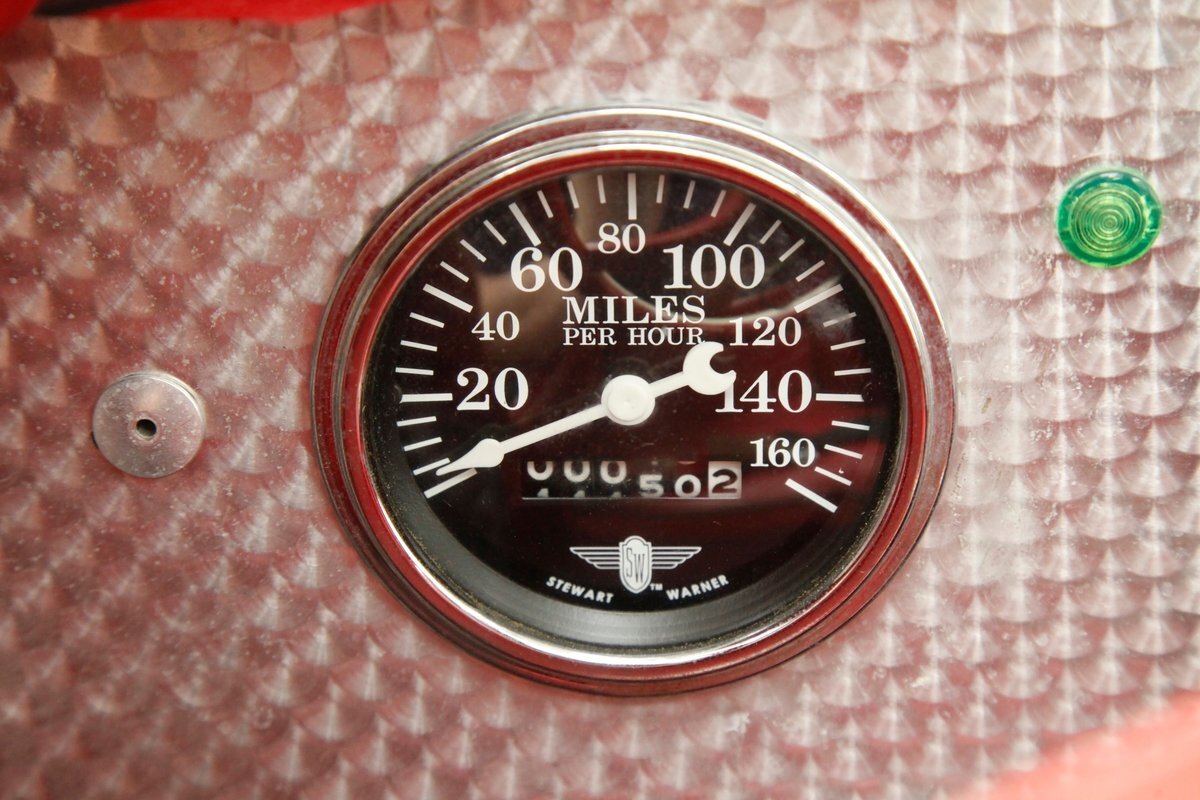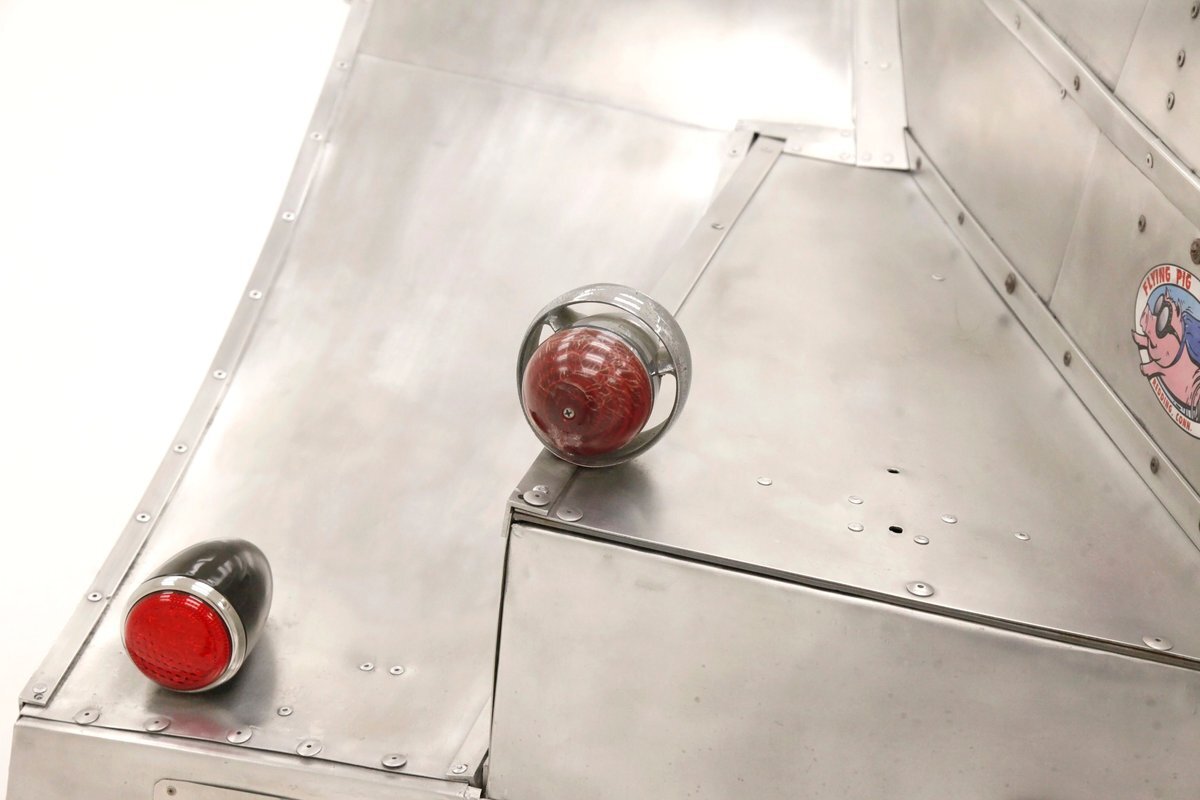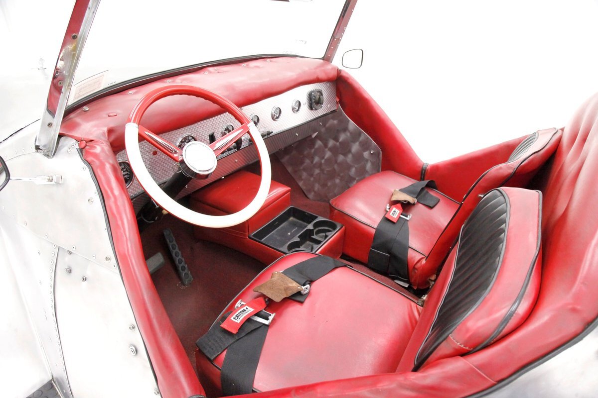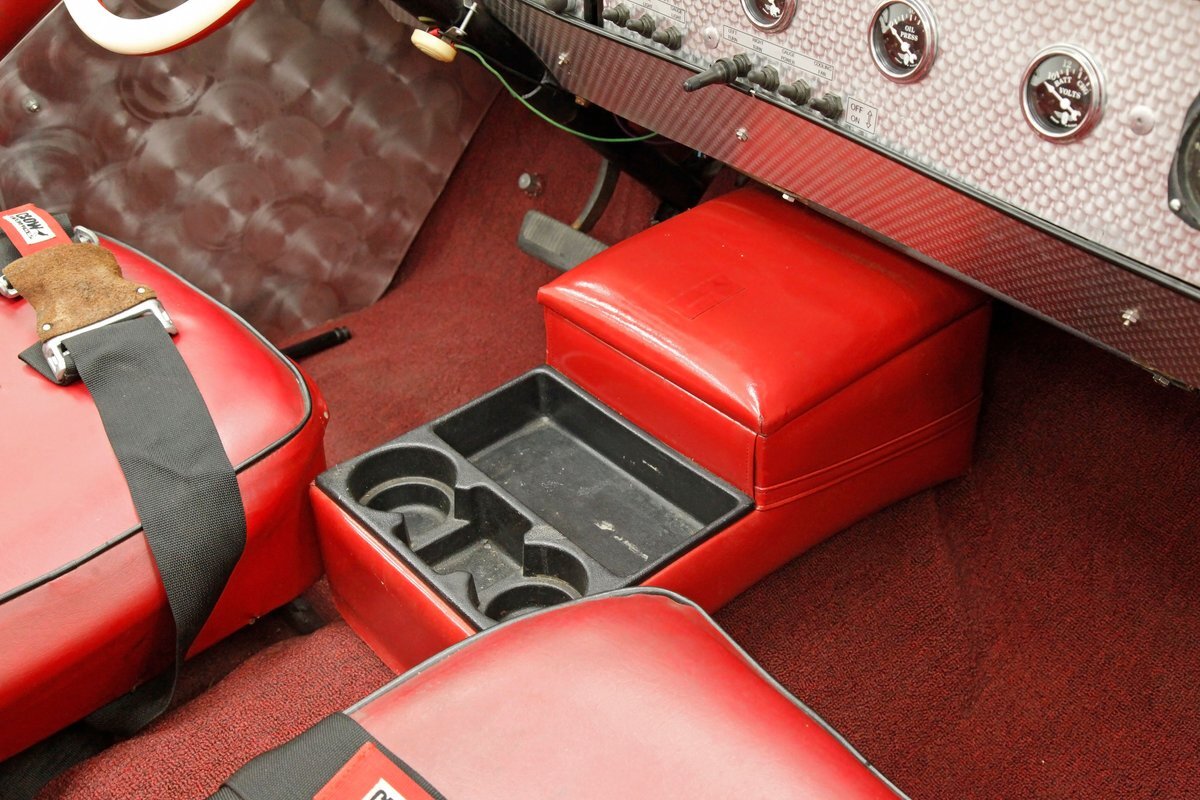 Taking a ride in this creation subjects you to the elements as there is no top. Just aircraft style seating with dual cockpits reminiscent of the Stearman biplanes of yore. Low back bomber style buckets, (fitting!), are in front facing the custom aluminum spun pattern dash. These chairs feature uppers with black tuck and roll and smooth red vinyl lowers. A large center console with a storage tray and cupholders is between the buckets. Padding covered in red vinyl lines the edges off the swooping down edged cockpit. That dash has blackface Stewart Warner black faced gauges with vintage looking pointers. A few additional knobs and toggles as well as some lights are inserted here as well. Fronting the dash is a vintage 50's styled steering wheel in white and red with a central chevron center. Red carpeting covers the floors. In the back, we can climb into a private full rounded back bench also in red vinyl with black tuck and roll toppers. The sides are also padded red vinyl but with no doors, it's a climb.