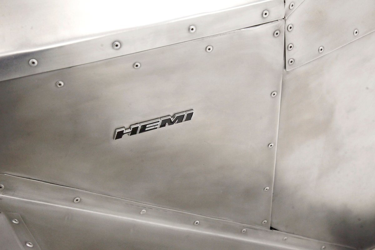 A flip of the standard hood reveals a 331ci Hemi V8. It sports a single Holley 4-barrel carburetor and a 2 speed Powerflite transmission on back. Seen wayyyyy in the back is an 8-3/4 inch rear axle. All is looking good and has industrial gray and silver surfaces for this mill.