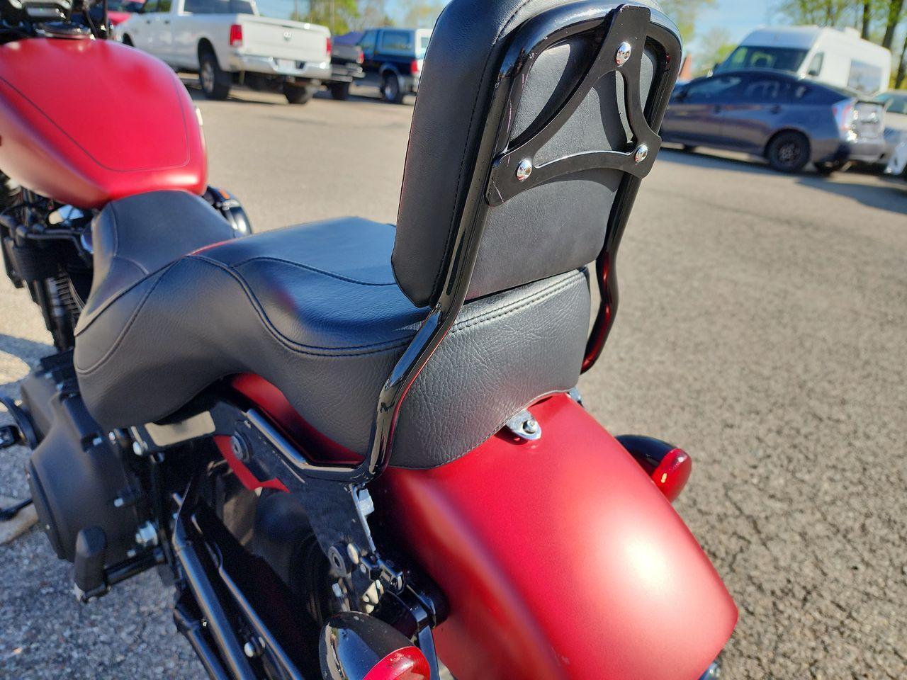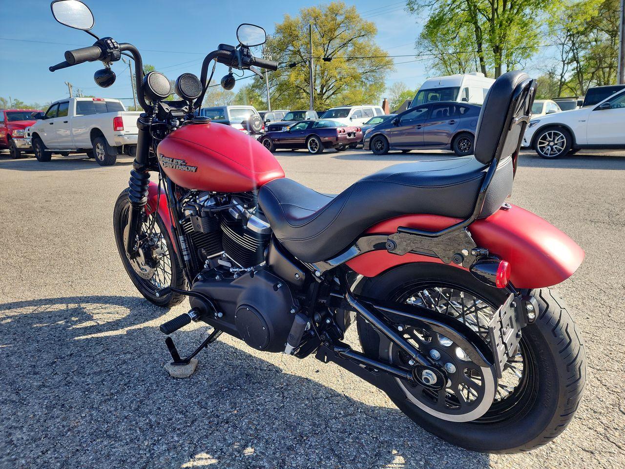 Super clean FXBB Street Bob Softail finished in Wicked Red Denim with the big 107" Milwaukee Eight engine and loaded with factory options and upgrades including: ABS brakes, Security system, Black laced wheels, Upgraded HD 2 up comfort seat, detachable gloss black passenger backrest, and Bluetooth sound system. Super clean bike with only 6K original miles, in stock and available for IMMEDIATE delivery!!