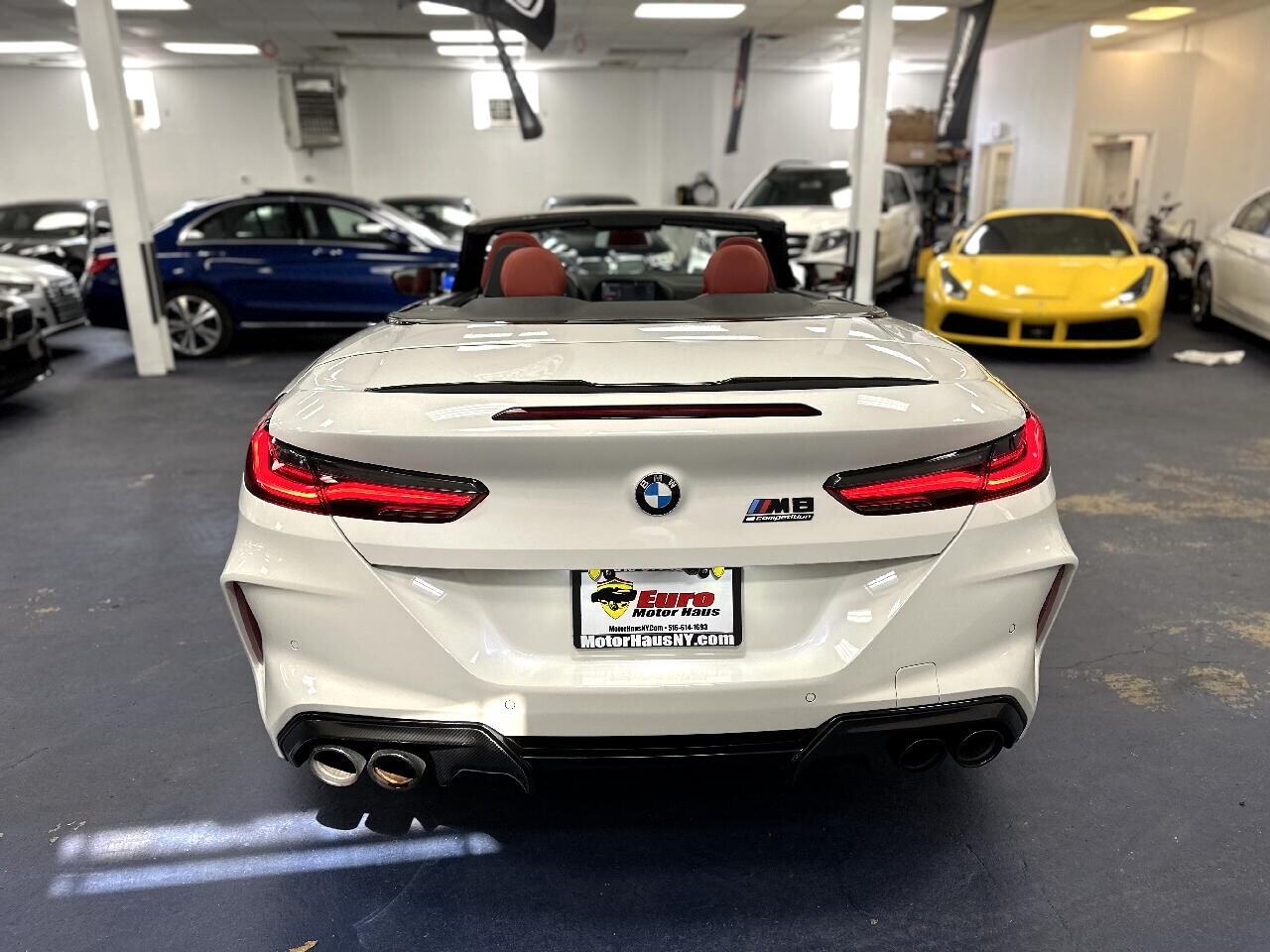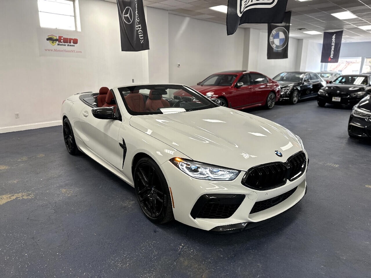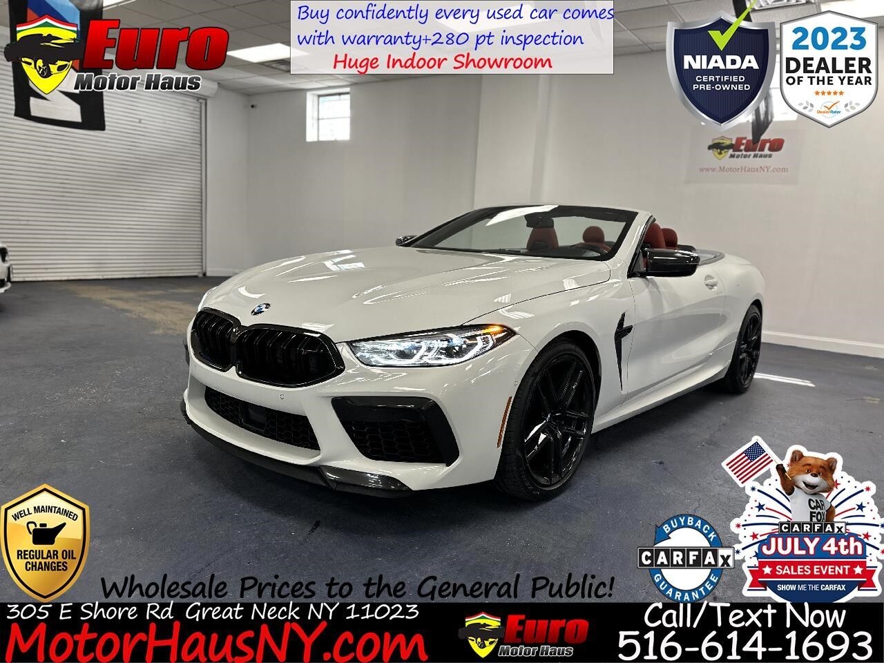 Introducing the extraordinary 2020 BMW M8 Competition Convertible, a one-owner lease return with 32,486 miles and every possible option, making it one of the most sought-after vehicles on the market. This stunning car features an Alpine White exterior paired with a striking Sakhir Orange/Black Full Merino Leather interior, an incredibly desirable combination.Under the hood, you'll find a powerhousea TwinPower Turbo V8 engine delivering a heart-pounding 617 horsepower, 553 lb-ft of torque, and a blistering 0-60 mph time of just 3.0 seconds. Loaded with premium options, including the full M Carbon Exterior Package ($5,400), Bowers & Wilkins Diamond Surround Sound System ($3,400), Neck Warmer ($500), and more, this M8 Competition Convertible had an original MSRP of $167,995.If you're looking for the epitome of luxury, performance, and style, this is the car for you. Don't miss outschedule a test drive today! ? Call or Text 516-614-1693 prior to your visit for special internet pricing and quick answers to your questions ? Visit Euro Motor Haus online at to see more pictures of this vehicle or stop in person and view our large variety of certified pre owned luxury vehicles at 305 East Shore Road Great Neck NY 11023 or call/text us at516-614-1693 today to schedule your test drive. We are a FRANCHISE Affiliated Luxury Pre-Owned Car dealership connected to over 4 Franchise Dealerships. What that means for you is that we have ability to obtain you low rate financing through our major lending institutions. Wells Fargo TD Bank Capital One Bank Bank of America US Bank Exeter auto finance Chase Automotive Ally Financial Santander Key Bank all NY based credit unions and many more.The benefits of which are then transferred to our clientele. We are able to offer FRANCHISE finance rates up to 84 months. With our affiliation we are also permitted to sell New Car Service Contracts here with our CERTIFIED PRE-OWNED PROGRAM backed by SafeGuard and GWC and NIADA Warrantech . Come in and have our friendly and knowledgeable staff facilitate your needs. Euro Motor Haus Inc does not guarantee any ad disclaimer guarantees etc on any 3rd party website.Please note that the advertised price does not include sales tax registration DMV transportation of vehicle costs incurred by the dealer as for safety including but not limited to brakes tires and fluids and any additional fees required by law. Prices exclude any additional charges included with the cost of closing including any governmental charges and taxes any finance charges documentation preparation or warranty. The advertised price represents the vehicle in its current condition and subject to change depending on any additional costs incurred or market fluctuations. Inventory prices are liable to change without warning. Vehicles are offered on a first come first serve basis. Please call to inquire. Advertised price includes all dealer rebates and incentives but not inclusive of certification & dealer prep. We make every attempt to adequately represent the condition and features of all inventory including vehicle information pictures pricing and status but there may be inaccuracies. Updates may be delayed. Dealer assumes no responsibility for inaccuracies in online information. All internet special prices expire at 11:59 pm today. Must present offer prior to expiration.All of our vehicles go through a rigorous Safeguard/ GWC & NIADA certified and backed inspection. They Are pre certified. You work you drive!!! Instant financing available!!! We have great relationships with many lending institutions and we are the Home of the Guaranteed Approval.All finance deals are subject to primary lender approval. Challenged credit no credit no problem! PRICES MAY DIFFER WITH PAYMENT OPTIONS. **Many are 1 owner or off lease vehicles. **Free Vehicle History Reports **100% TOTALLY Indoor Facility **Nationwide Financing available **Extended Service Contracts available **Our cars under 100k miles all come with at least a 30 day warranty standard **Many are out of state clean cars **Trade ins welcomed **No Haggle Pricing!