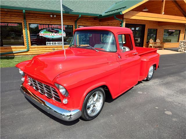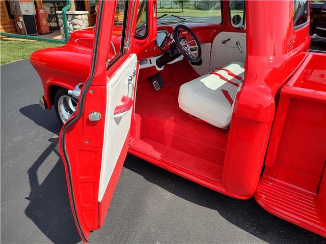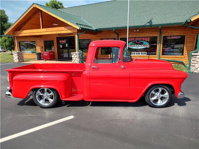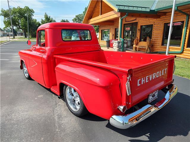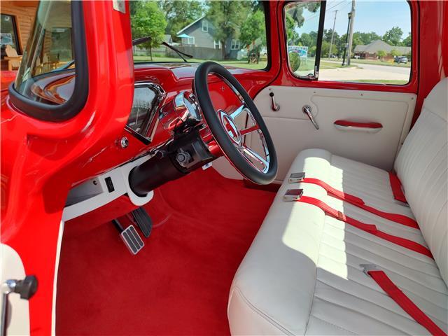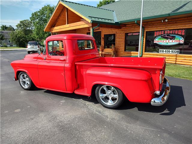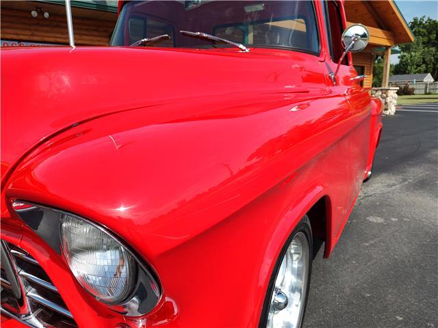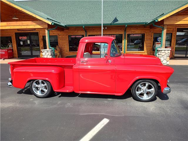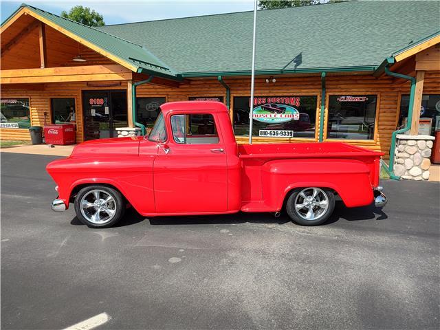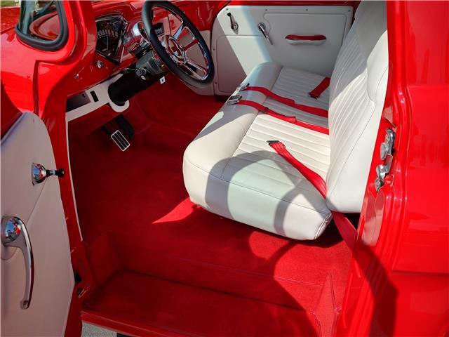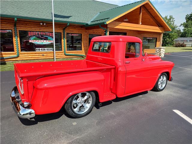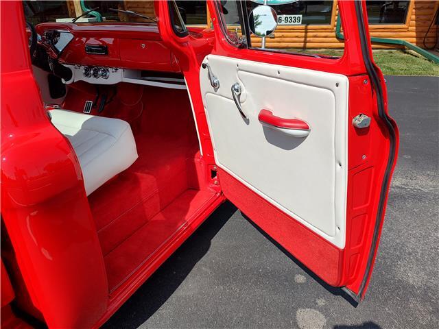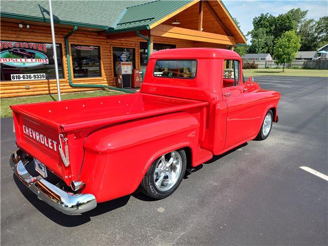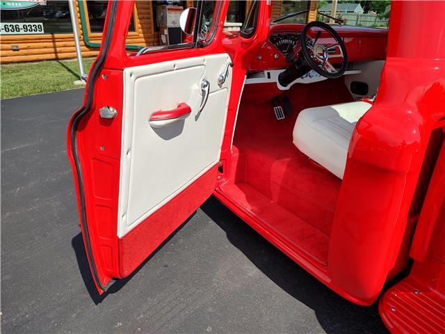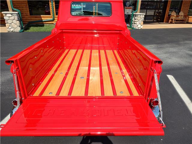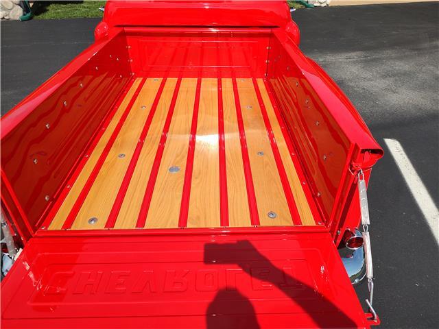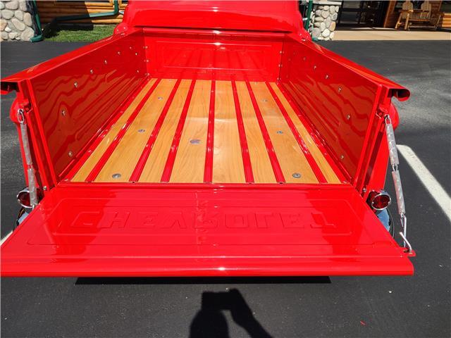 This is a very nice 55 3100 pickup that has had a complete custom build, done in a very slick Torch Red, basecoat clearcoat, sanded and wheeled smooth, new tinted glass, window rubbers and felts, chrome door window frames, weather stripping, fuel tank has been removed from cab; custom fuel cell mounted in rear with flush mounted filler cap in bed floor, new side view mirrors, door handles, chrome grill, headlight bezels and parking lights, chromed front bumper, very nice Oak Wood bed, stainless fasteners, stainless tailgate chains, new stainless taillights, new chrome rear bumper.