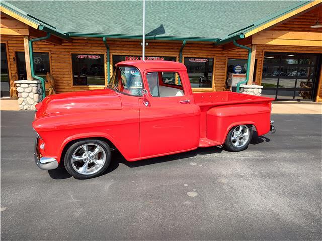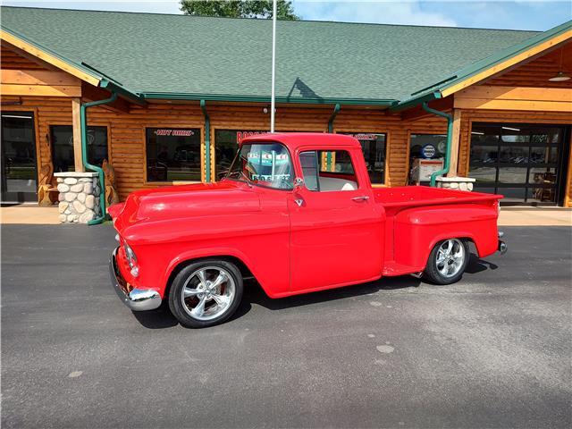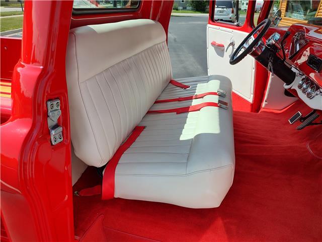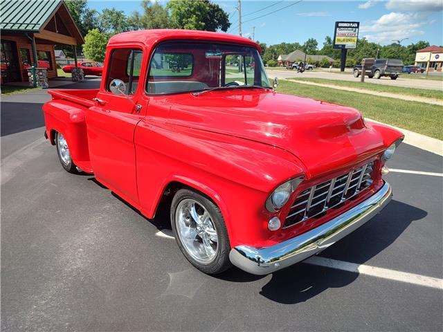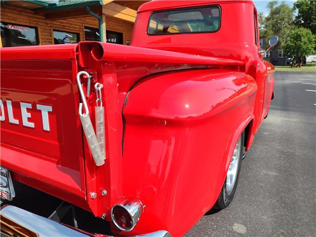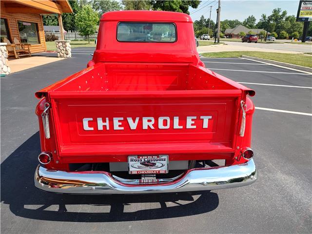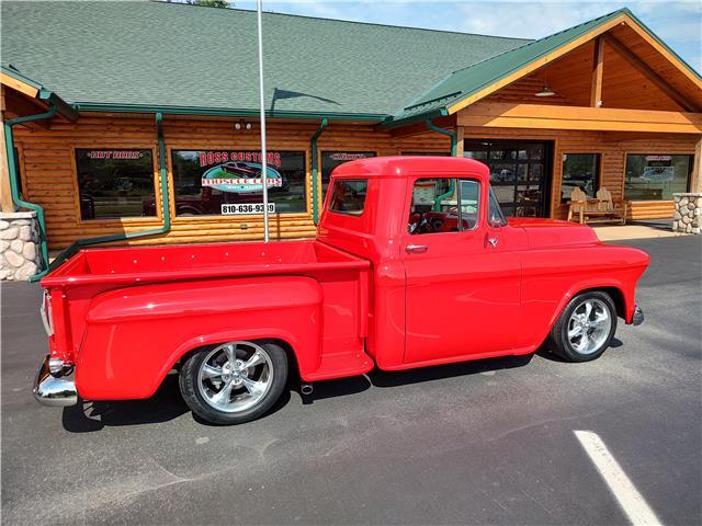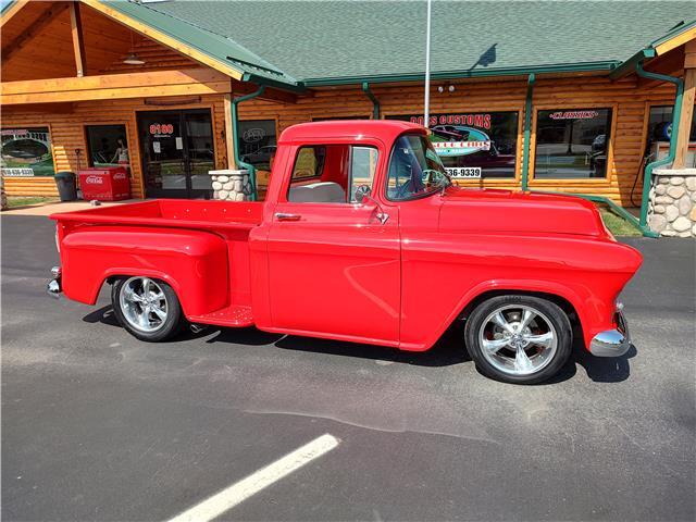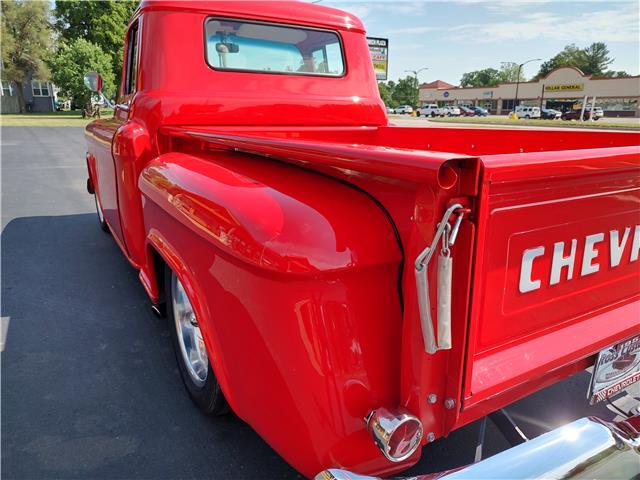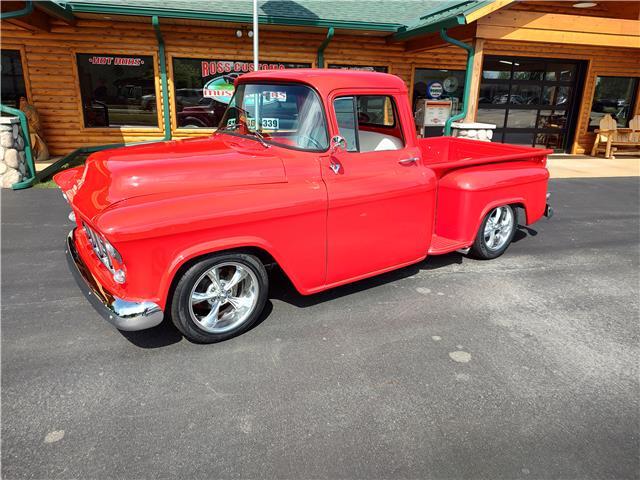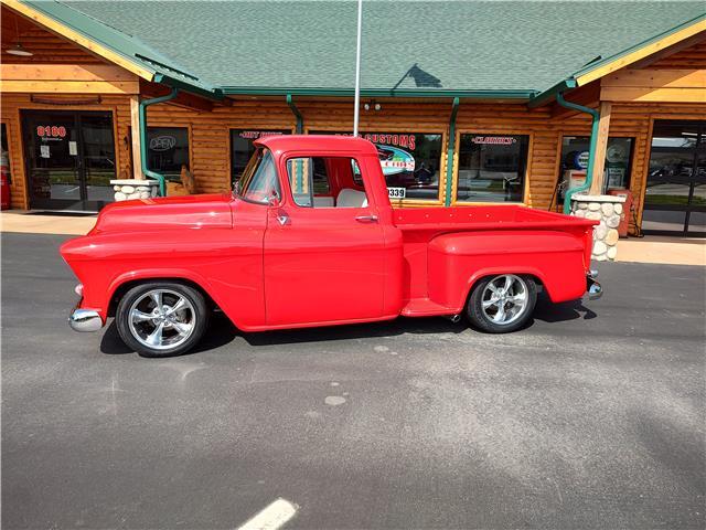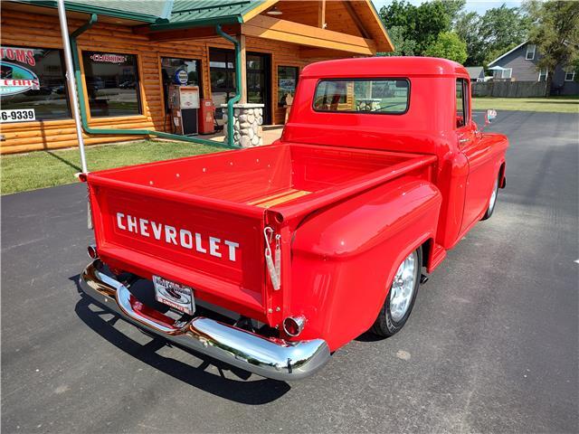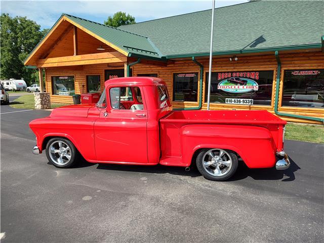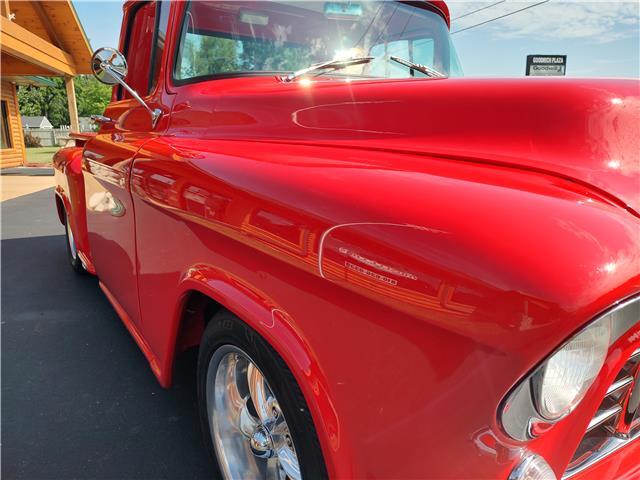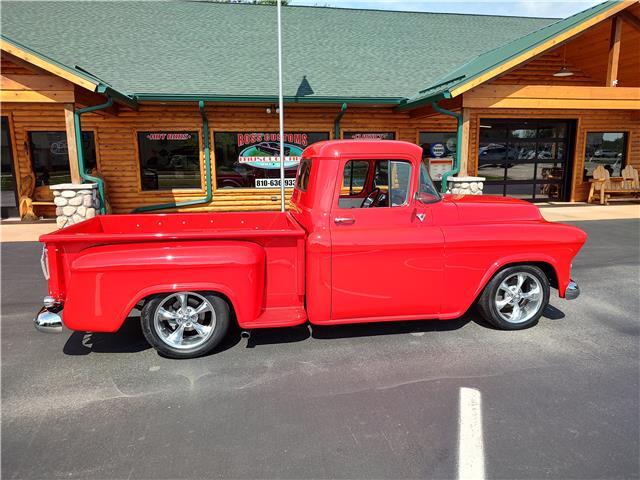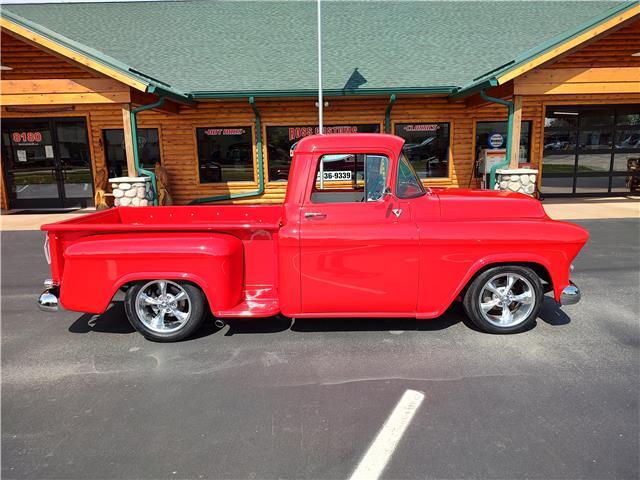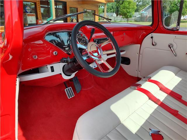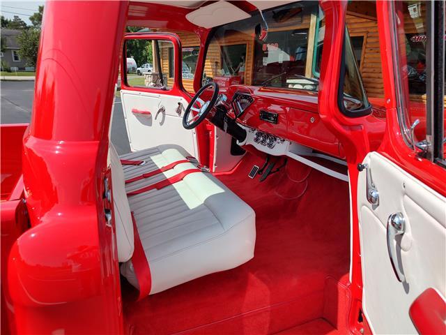 This is a very nice 55 3100 pickup that has had a complete custom build, done in a very slick Torch Red, basecoat clearcoat, sanded and wheeled smooth, new tinted glass, window rubbers and felts, chrome door window frames, weather stripping, fuel tank has been removed from cab; custom fuel cell mounted in rear with flush mounted filler cap in bed floor, new side view mirrors, door handles, chrome grill, headlight bezels and parking lights, chromed front bumper, very nice Oak Wood bed, stainless fasteners, stainless tailgate chains, new stainless taillights, new chrome rear bumper.