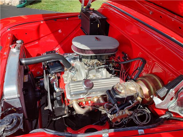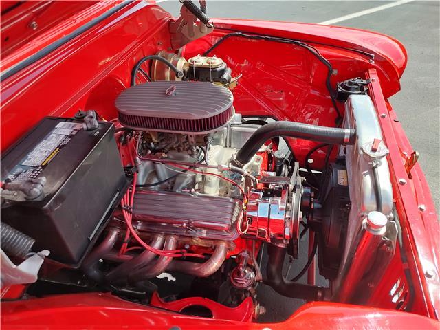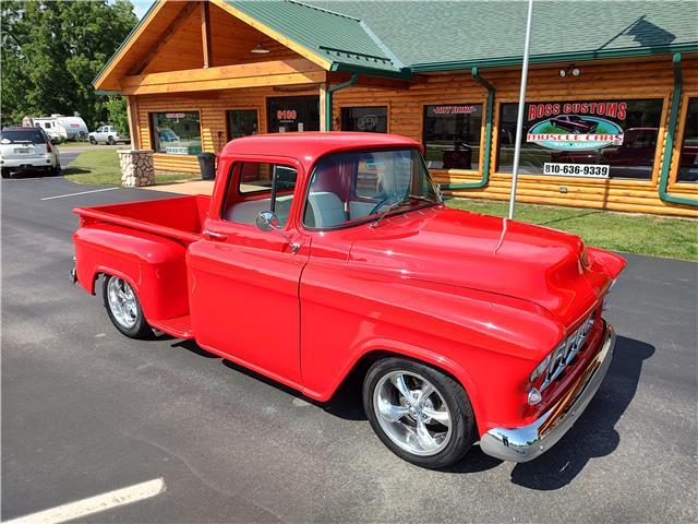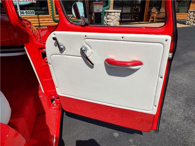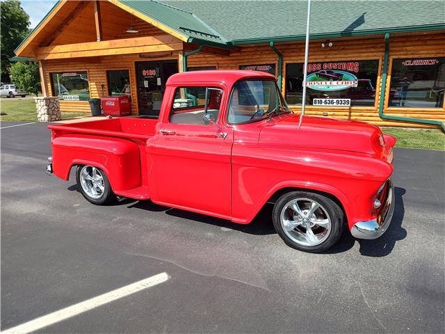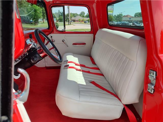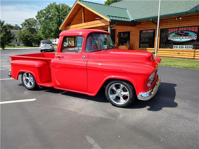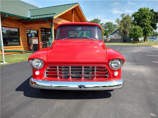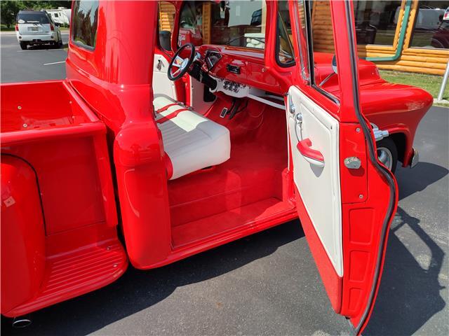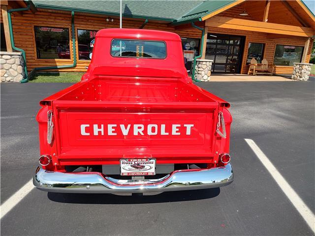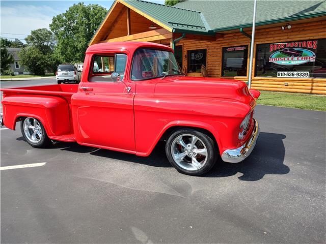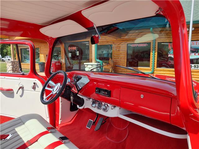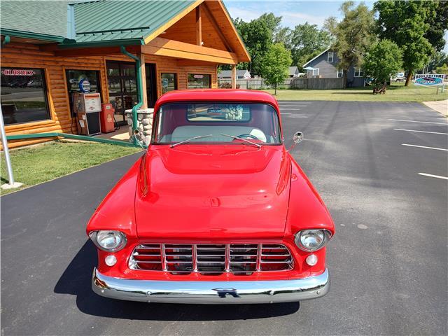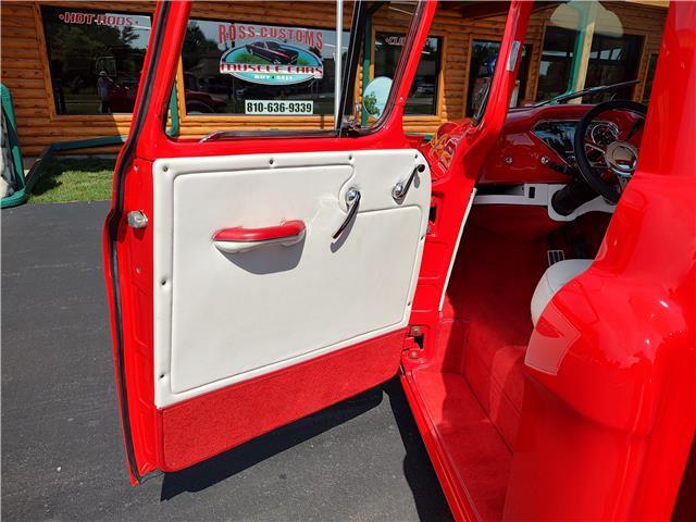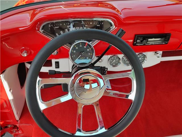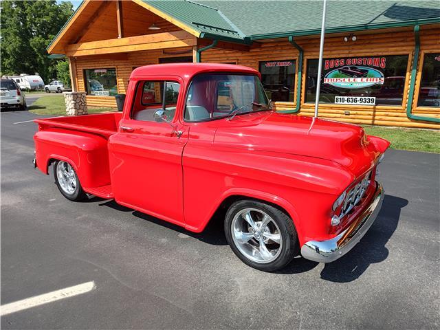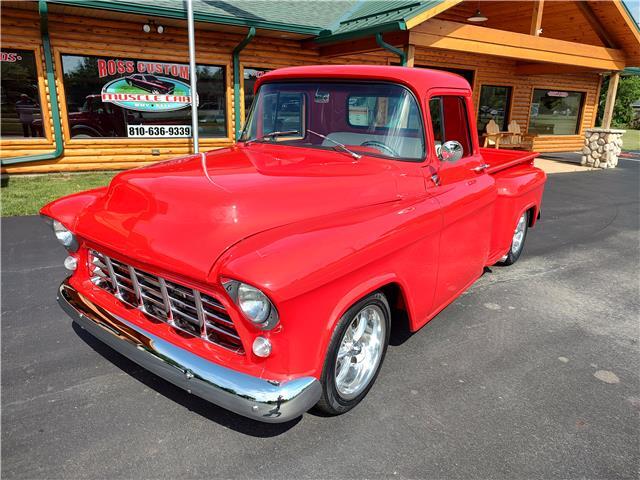This is a very nice 55 3100 pickup that has had a complete custom build, done in a very slick Torch Red, basecoat clearcoat, sanded and wheeled smooth, new tinted glass, window rubbers and felts, chrome door window frames, weather stripping, fuel tank has been removed from cab; custom fuel cell mounted in rear with flush mounted filler cap in bed floor, new side view mirrors, door handles, chrome grill, headlight bezels and parking lights, chromed front bumper, very nice Oak Wood bed, stainless fasteners, stainless tailgate chains, new stainless taillights, new chrome rear bumper.