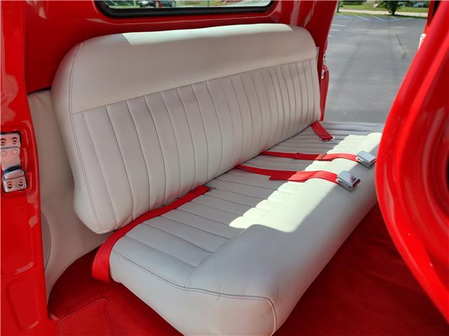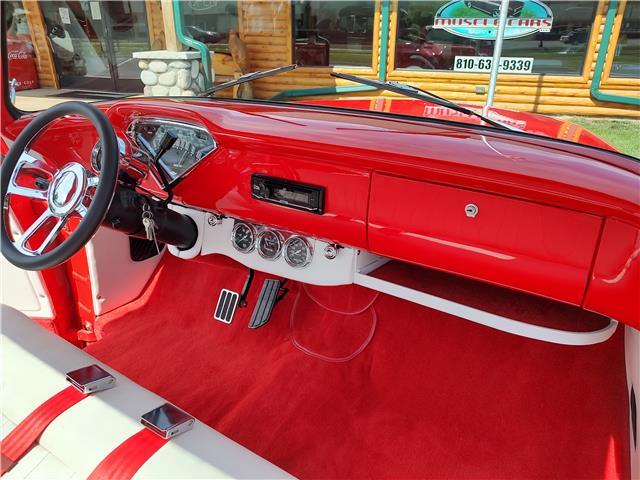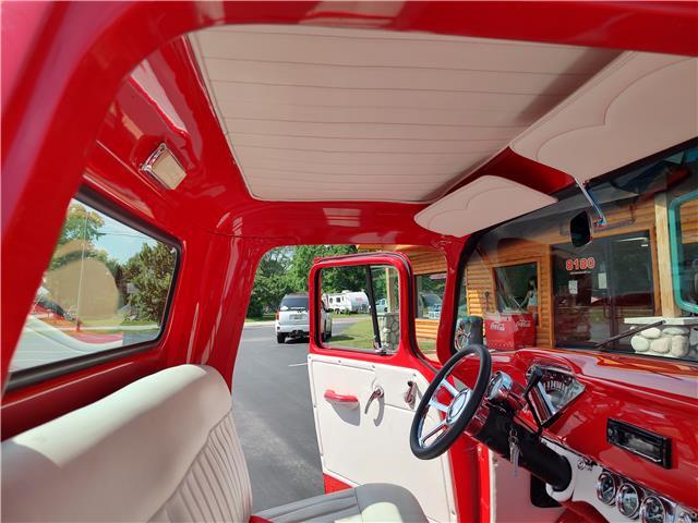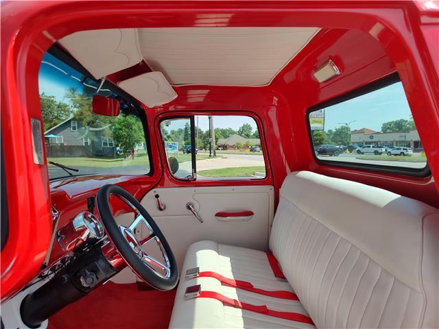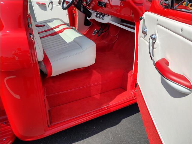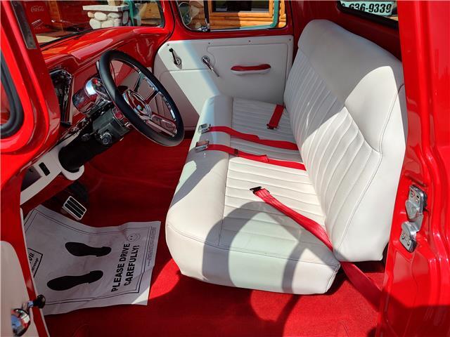 Inside of cab, dash and dash trim have been re-finished, new up to date wiring, new instrument cluster, AM/FM/CD stereo nicely mounted under dash, custom lower dash shelf, GM tilt steering column, tach nicely mounted to column, billet steering wheel, updated with LoKar brake pedal, white custom leather interior, new visors, headliner, kick panels and door panels, rear of cab has also been upholster with speakers, seat has been redone and updated with seat belts, full custom carpet.