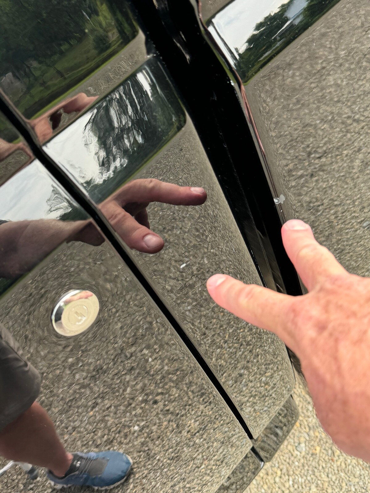 The truck was repainted approximately 8 years ago. The parking brake was not properly set and the truck rolled down a hill striking a tree with the front end. The hood, the grill, and the front bumper was replaced. It was at this time it was decided to have the truck professionally painted. The truck has a “factory finish” and one would never know it has been repainted.