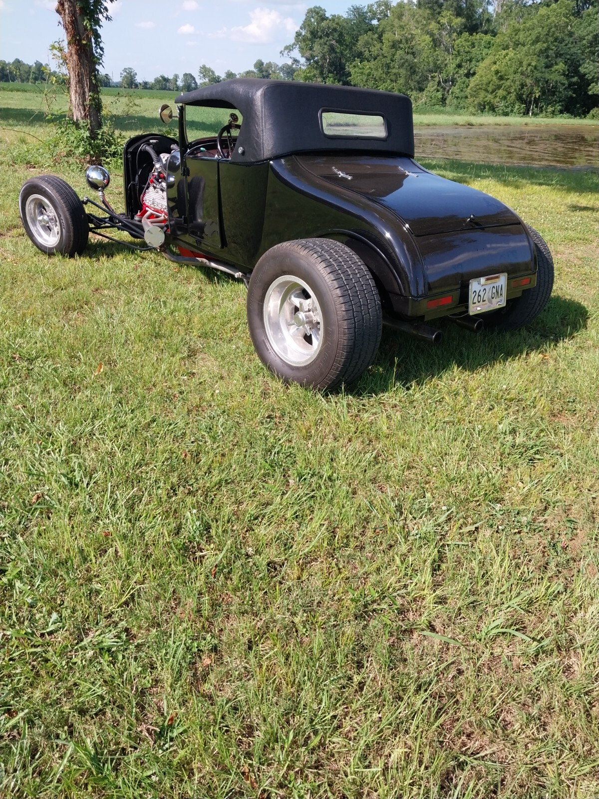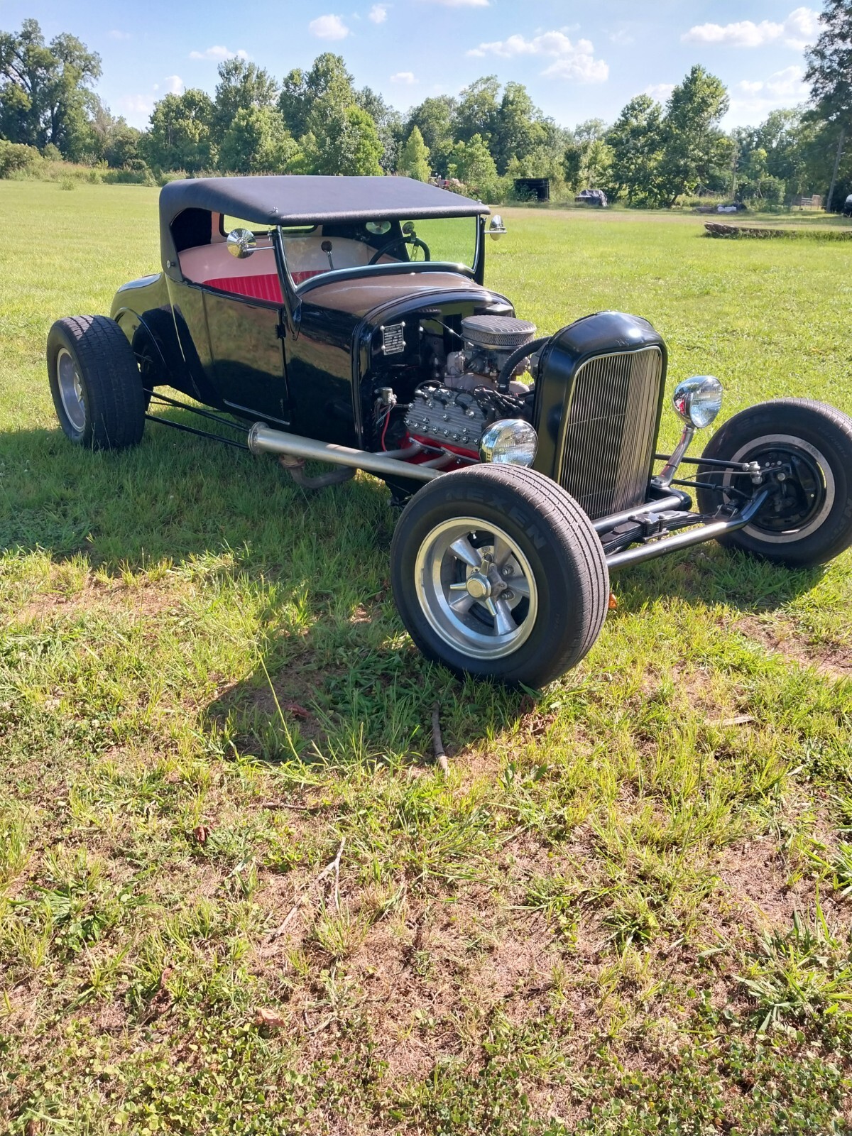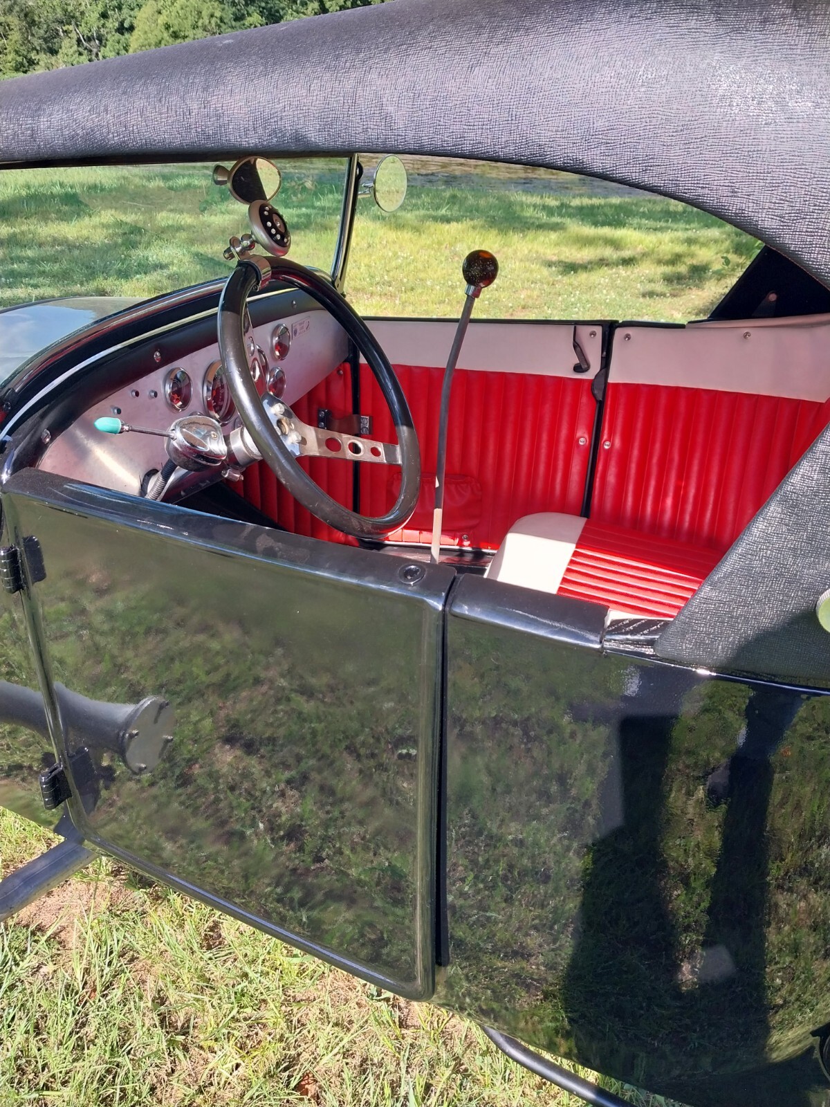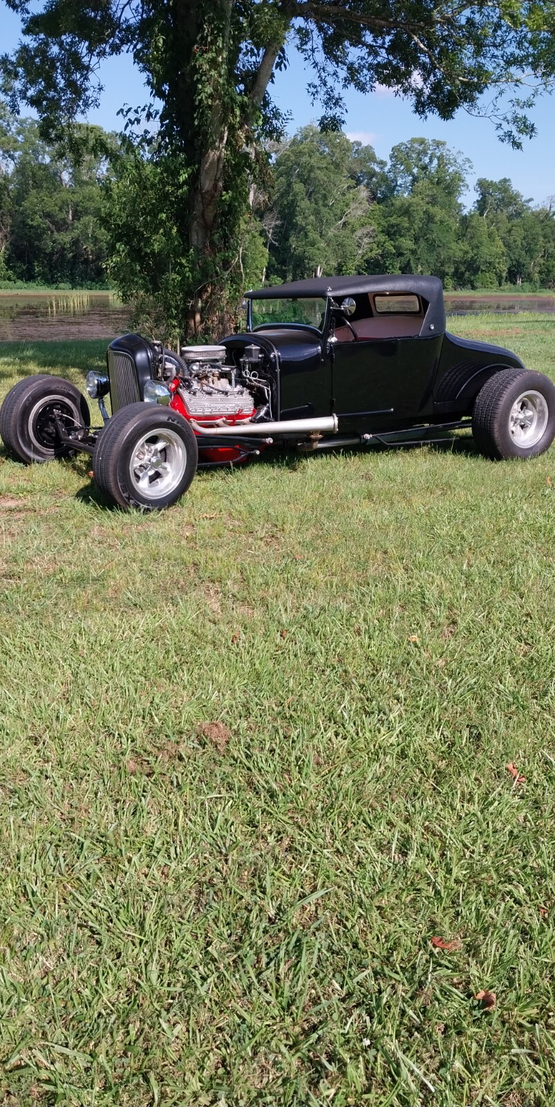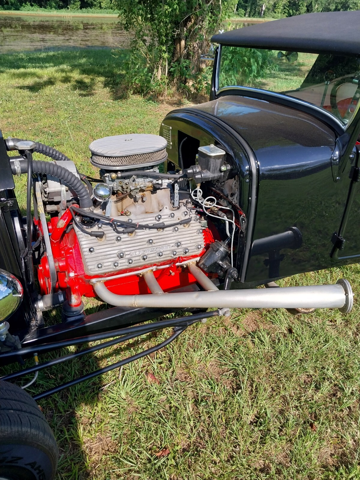 1927 Ford Model T Roadster All Steel Body, custom built frame and suspension, Flathead Ford V8 engine with Offenhauser intake and 390 CFM Holley carb, 5 speed manual transmission, Custom built removable Fiberglass top and Red and white tuck & roll interior. 4 new tires.