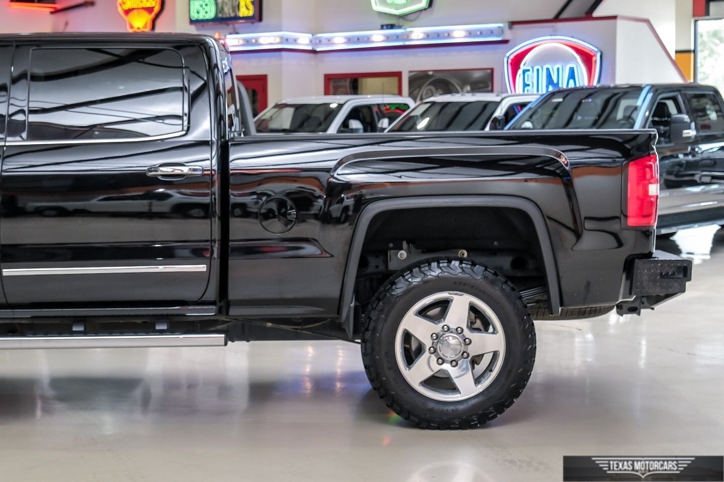 The exterior of this Sierra 2500HD Denali is a sleek, commanding black that emanates confidence and authority on the road. Complementing this bold exterior are the 20 in. Chromed Aluminum Wheels and Chrome Round Assist Steps, adding a touch of elegance and practicality. The Power Adjustable Camper Style Mirrors are perfect for those who need to keep an eye on their load, making towing easy. The all-terrain tires and custom grille guard provide ample utility for those jobs that take you somewhere people don't normally go.