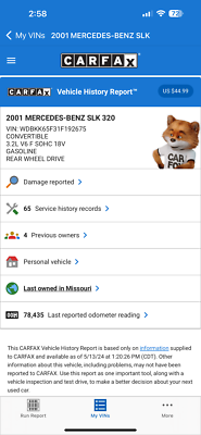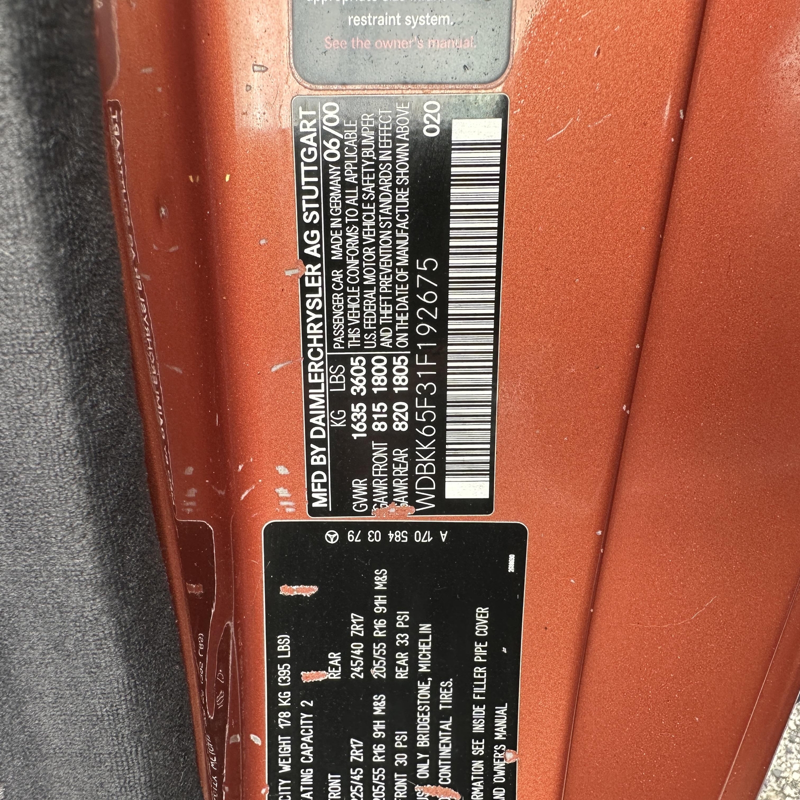 "PLEASE SCROLL TO BOTTOM OF LISTING AND CLICK "SEE FULL ITEM DESCRIPTION" TO VIEW ALL 50+ PHOTOS!!!" "I WILL HELP YOU ARRANGE SHIPPING AND WILL MATCH OR BEAT YOUR QUOTE" UP FOR OUR NEXT AUCTION IS THIS VERY NICE 2001 MERCEDES-BENZ SLK 320 ONE OF A KIND LORENZO EDITION ALSO COPPER EDITION DESIGNO PACKAGE, CONVERTIBLE WITH VERY LOW 79K MILES, WITH 65 SERVICE RECORDS ON CLEAN CARFAX, ACCIDENT FREE, EXTRA CLEAN, NON SMOKER AND PRICED TO SELL!!! THIS CAR IS OVERALL IN GOOD CONDITION INSIDE AND OUT. THE EXTERIOR SHOWS NO MAJOR DENTS, DINGS OR SCRATCHES. THE INTERIOR ALSO SHOWS NO SIGNS OF ABUSE, (SEE ALL PICTURES FOR MORE DETAILS.) THE ENGINE RUNS STRONG AND THE TRANSMISSION IS SMOOTH. THE CAR WILL BE A STEAL, SO BID WITH CONFIDENCE!!! Please keep in mind you are bidding on a pre-owned vehicle. Everyday driving can cause minor chips, dings or scratches on a vehicle. Unless otherwise noted in our photos or description these items are minimal, but may exist in some cases. Our photos are designed to be a visual description of this vehicle, please look at them carefully and use them to make a confident decision to bid on our vehicle. Get a great vehicle at a great price!!! Bid Now! If you have any questions about this or any of my other auctions please feel free to contact me via e-mail at or you can call me at 267-828-0272 ask for Serge. Thank you for your interests and we look forward to hearing from you...