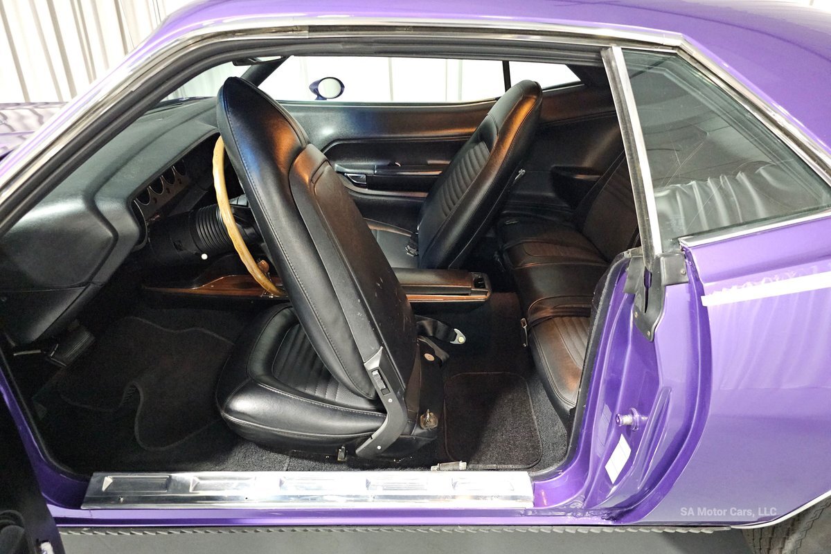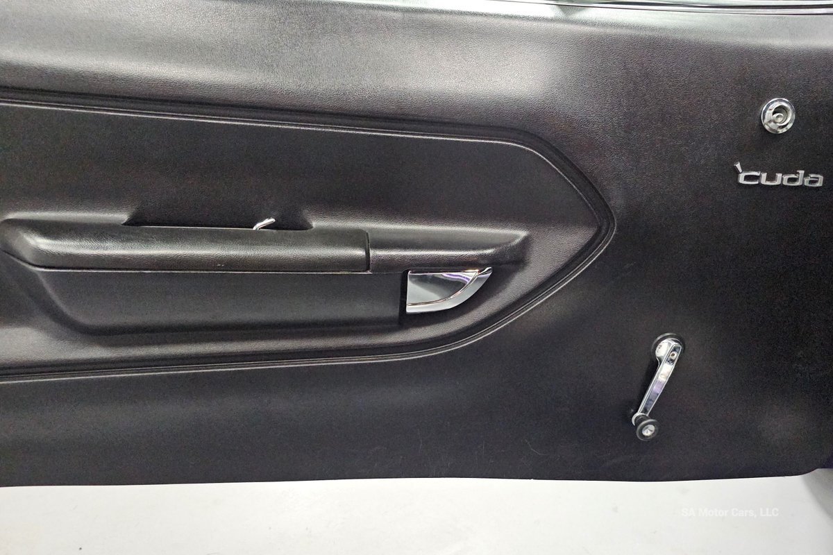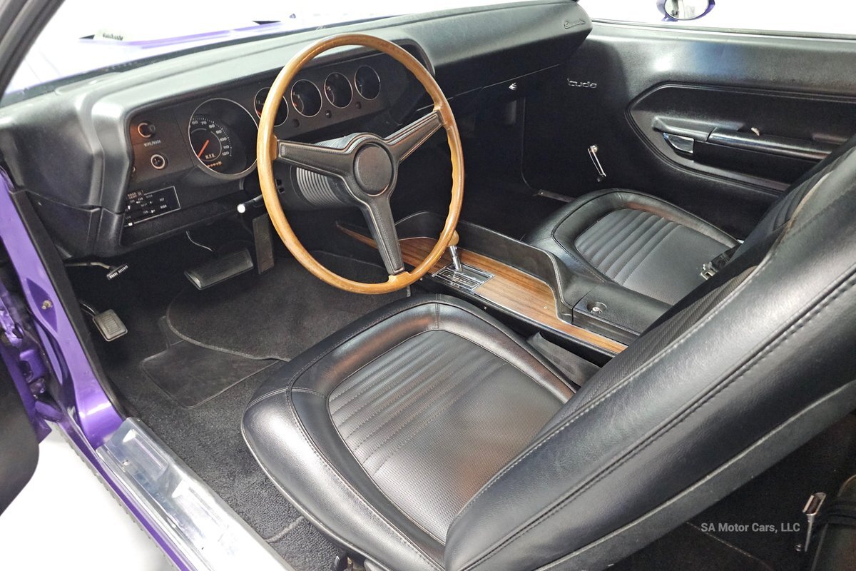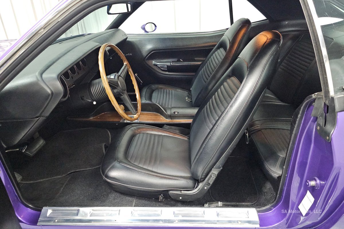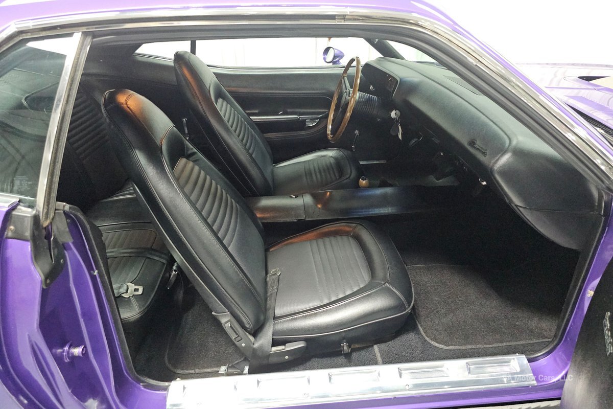 Looking into the inside of this Cuda it's sporting that beautiful Black Interior, Black Carpets, Black Mats, Bucket Seats in front, Black Console with woodgrain look, 3-Spoke Woodgrain Steering Wheel, Bench Seat in the back and Black safety belts.