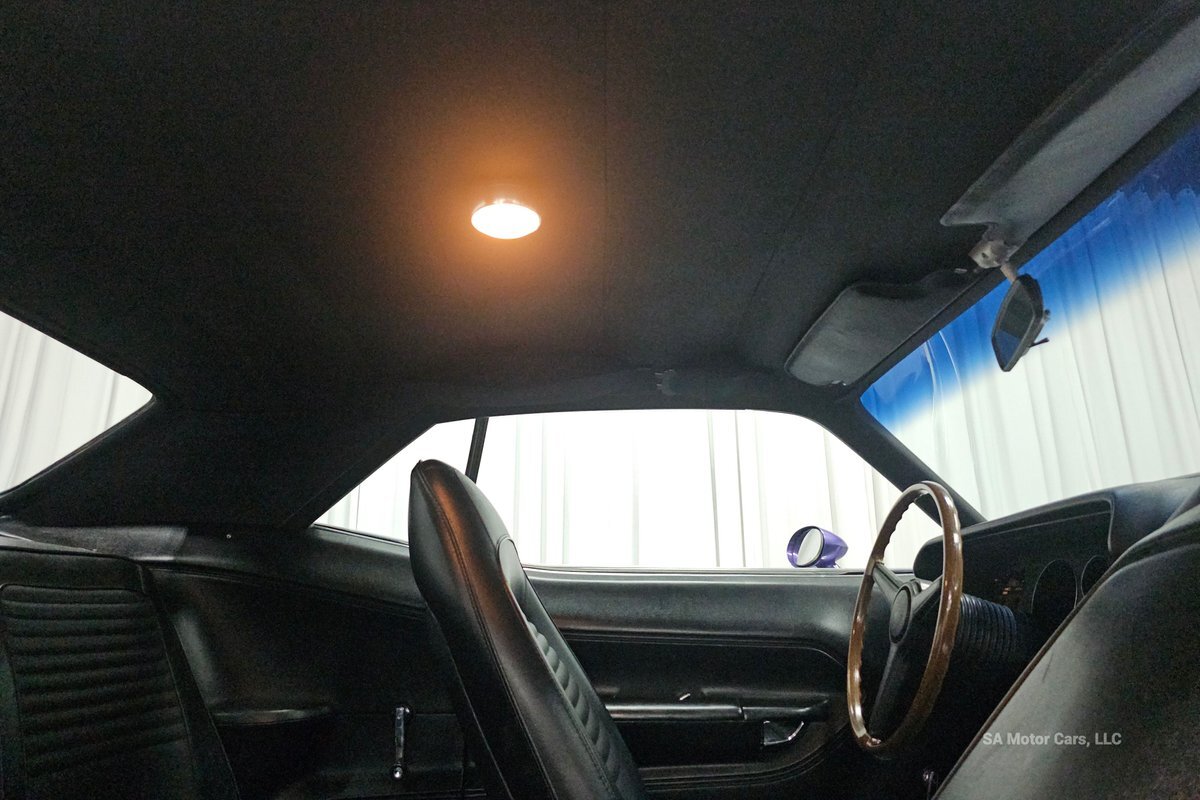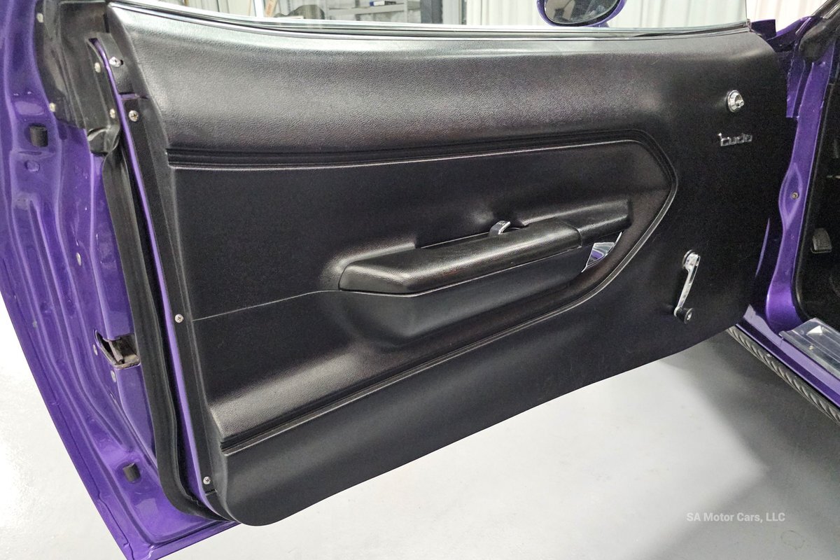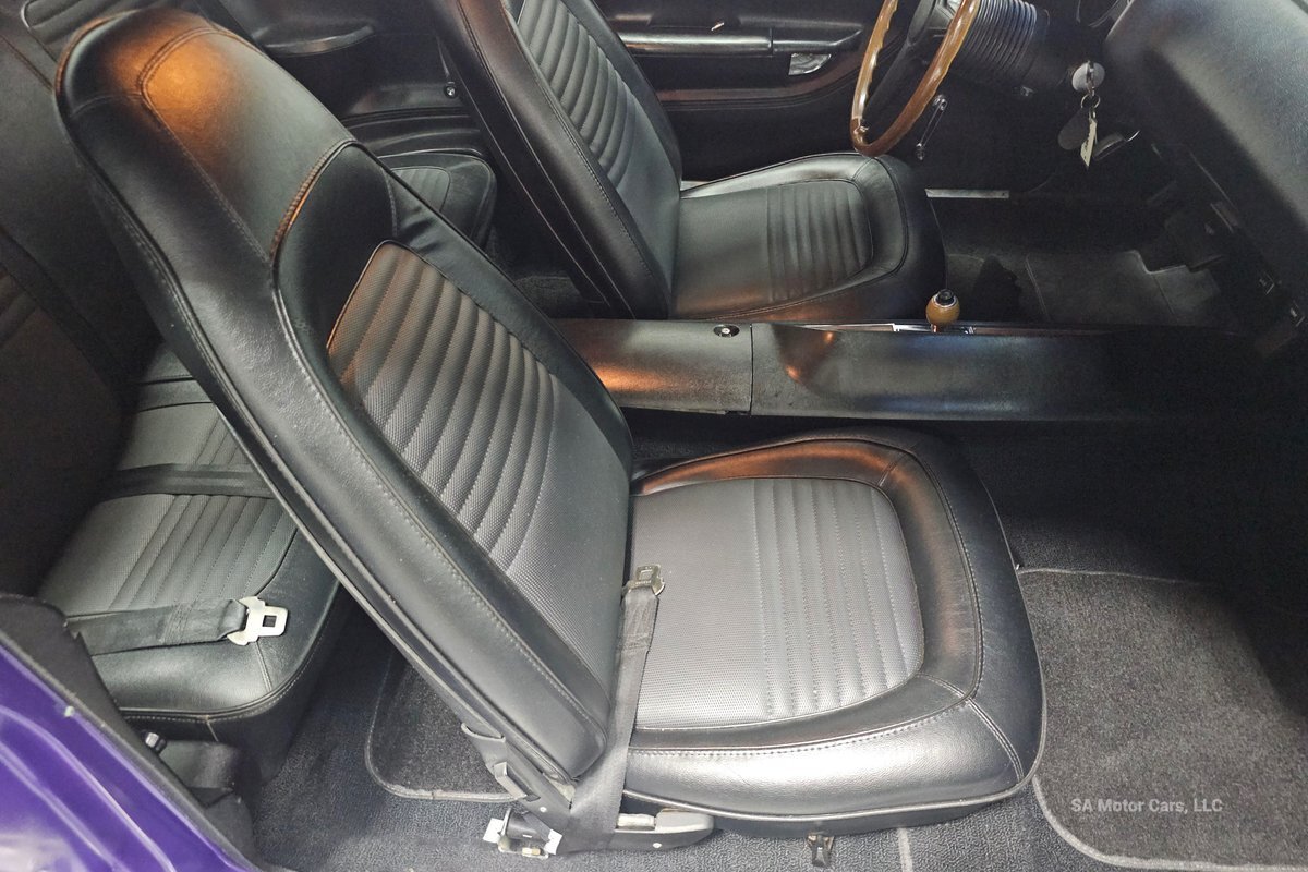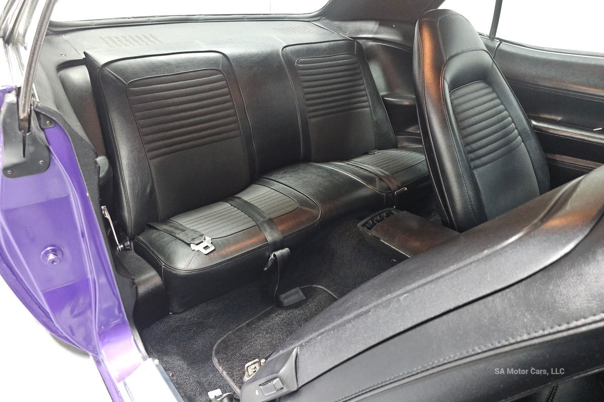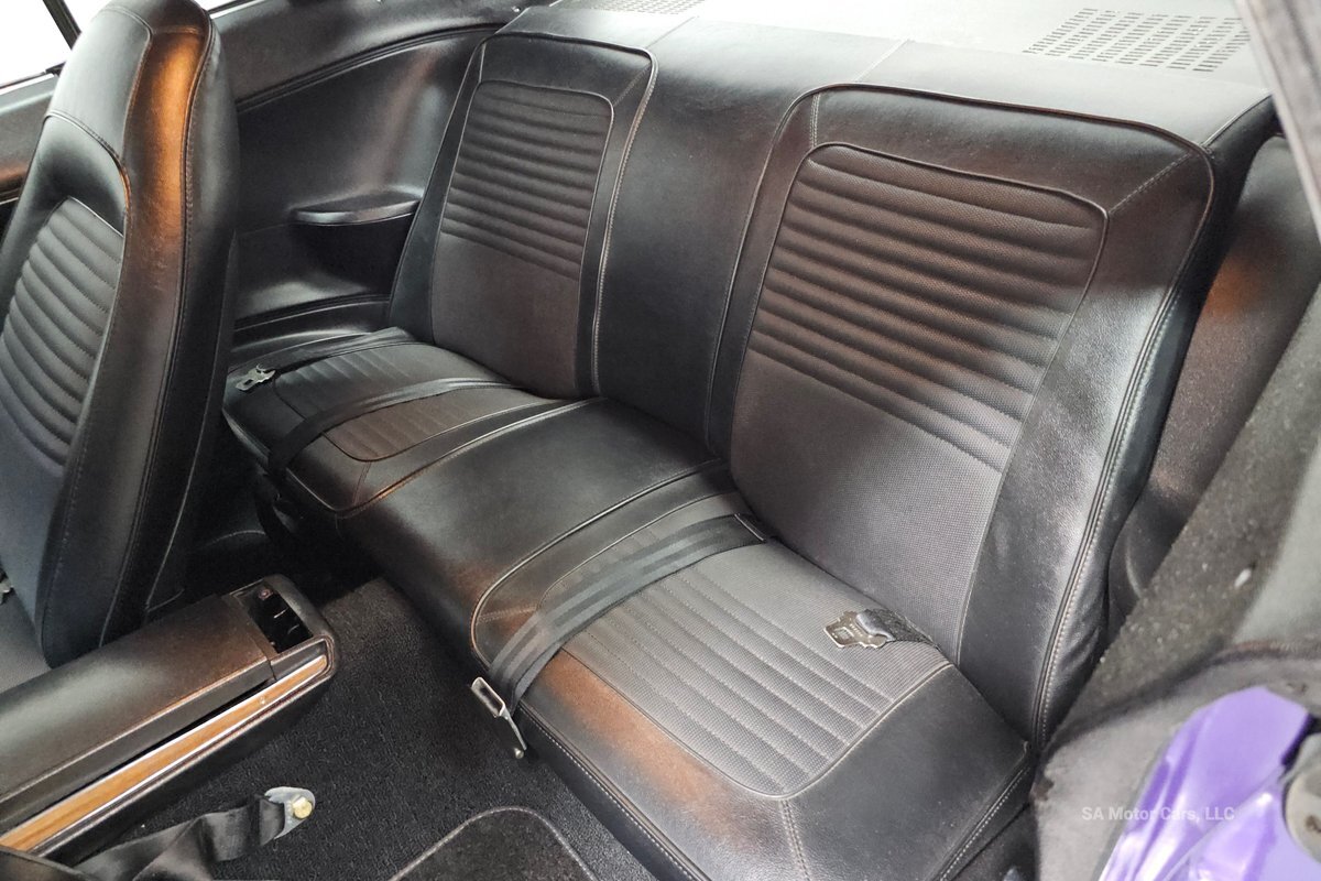 Looking into the inside of this Cuda it's sporting that beautiful Black Interior, Black Carpets, Black Mats, Bucket Seats in front, Black Console with woodgrain look, 3-Spoke Woodgrain Steering Wheel, Bench Seat in the back and Black safety belts.