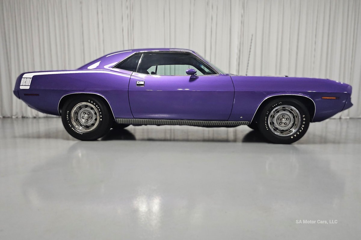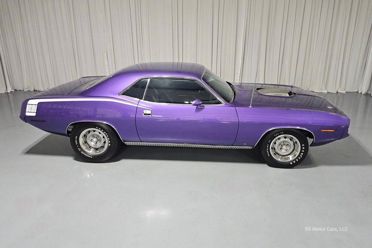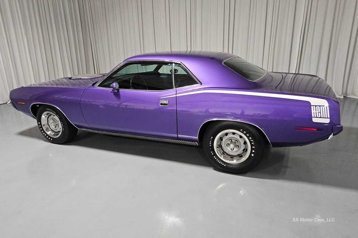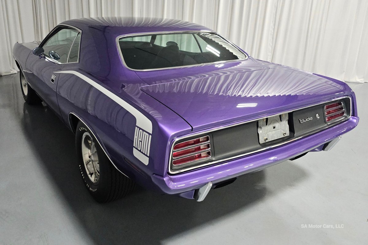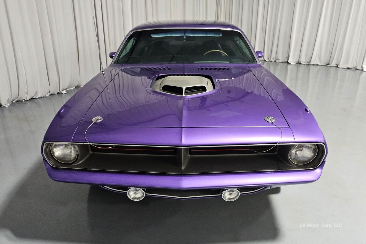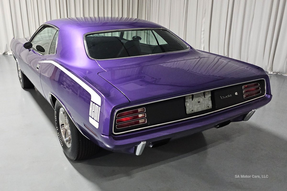 Check out this Stunning, All Original, Numbers Matching, with MMC DETROIT DAVID WISE PREMIUM DECODE Report, 1970 PLYMOUTH HEMI CUDA. This model of Hemi Cuda, there were only 368 built and of course this is one of them. This Cuda exterior is finished in a Beautiful Plum Crazy Purple Paint, sporting the Cuda badge on the tail end, Shaker Hood, White wide stripe with HEMI on both sides, on the back panels. The front and rear elastomeric bumpers are painted matching the car.