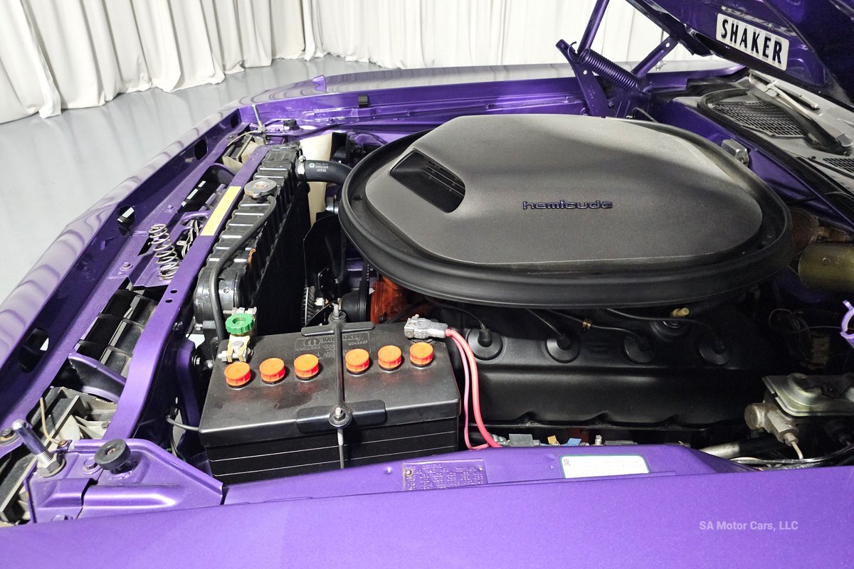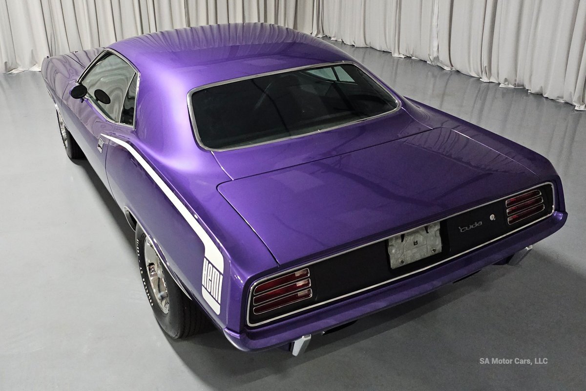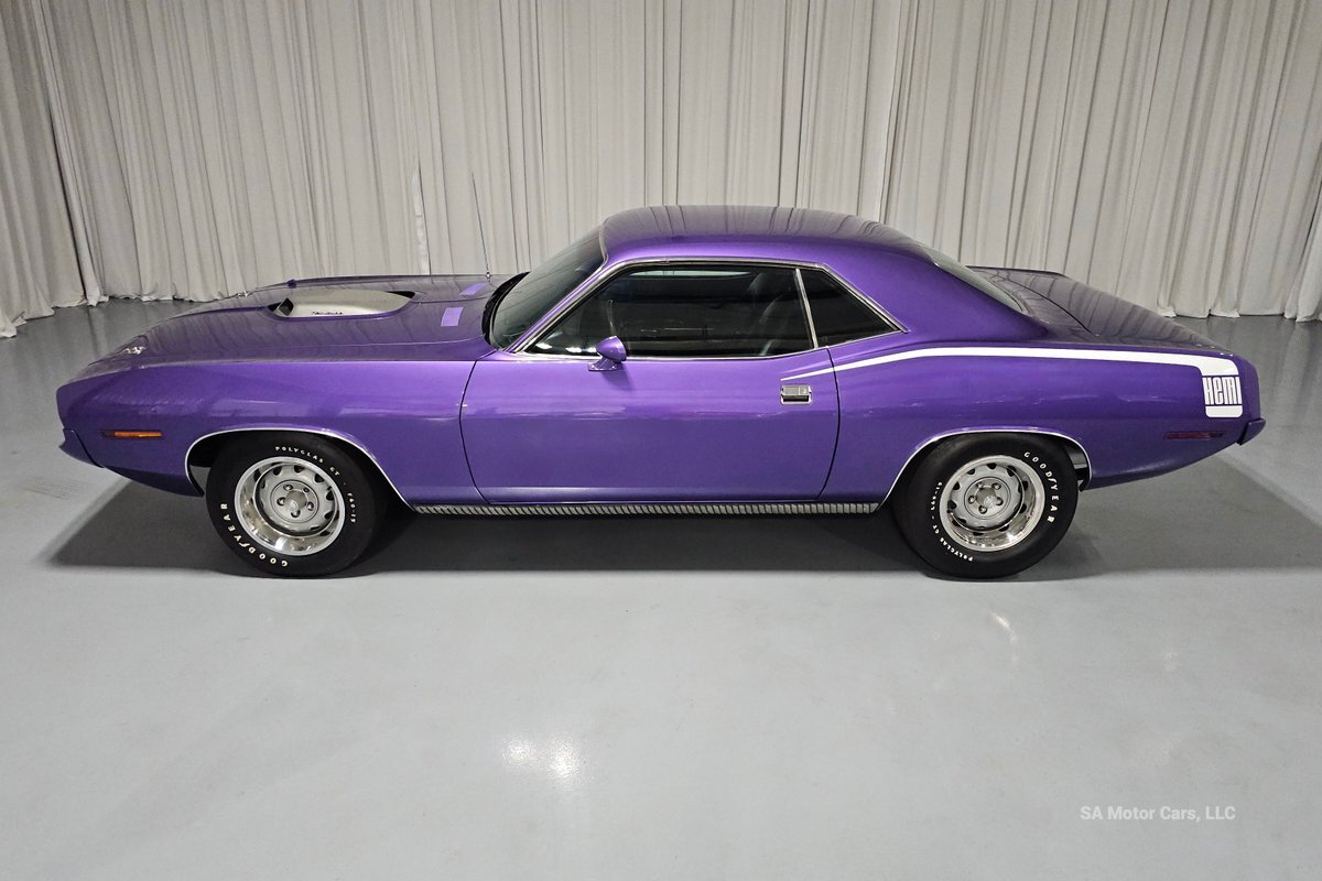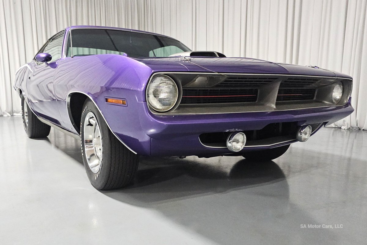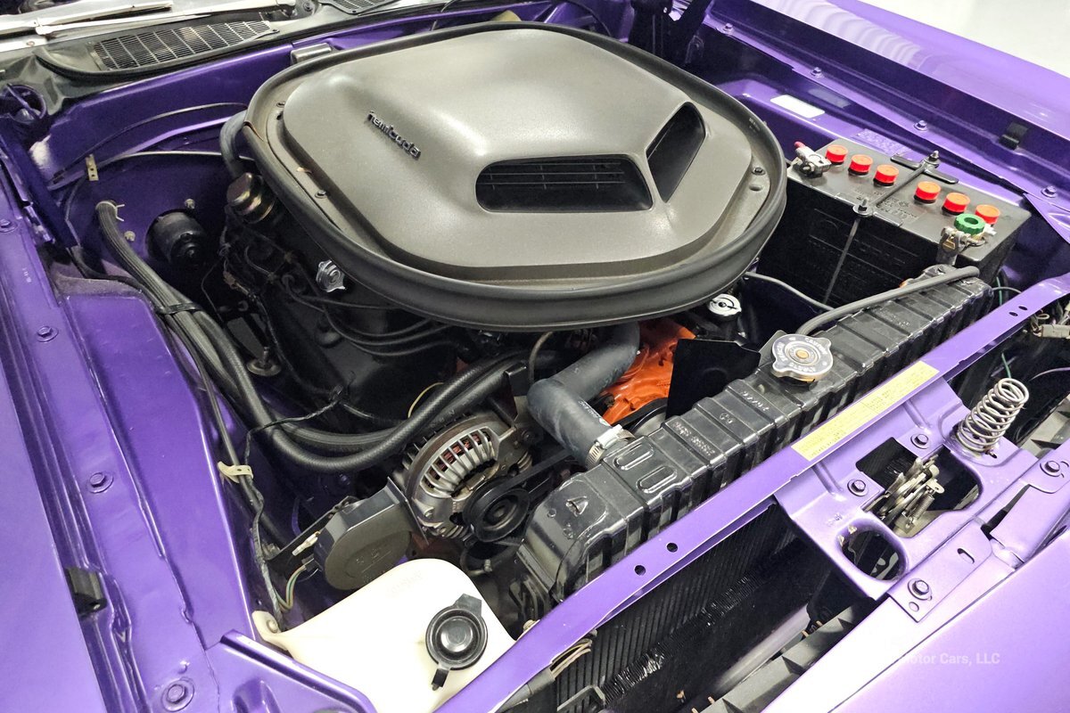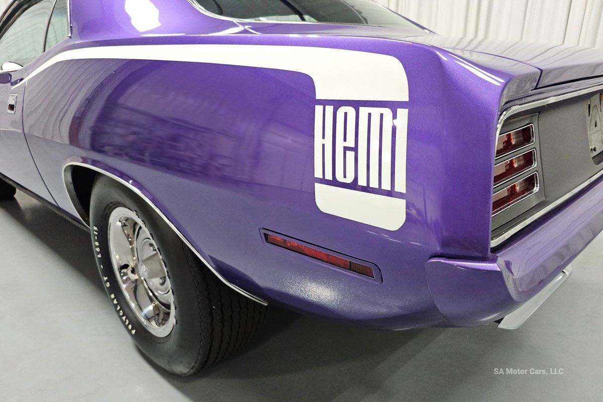 Check out this Stunning, All Original, Numbers Matching, with MMC DETROIT DAVID WISE PREMIUM DECODE Report, 1970 PLYMOUTH HEMI CUDA. This model of Hemi Cuda, there were only 368 built and of course this is one of them. This Cuda exterior is finished in a Beautiful Plum Crazy Purple Paint, sporting the Cuda badge on the tail end, Shaker Hood, White wide stripe with HEMI on both sides, on the back panels. The front and rear elastomeric bumpers are painted matching the car.