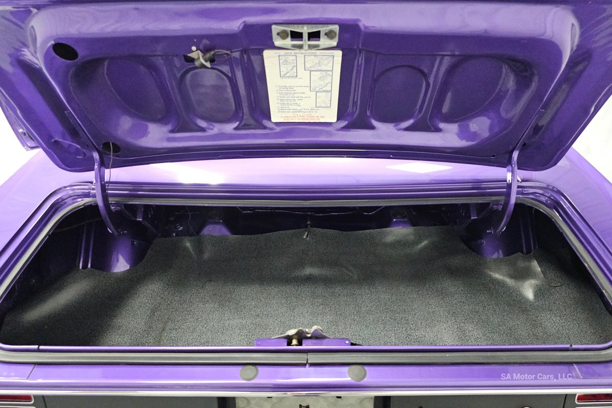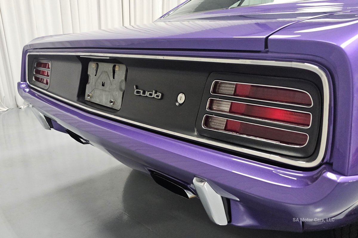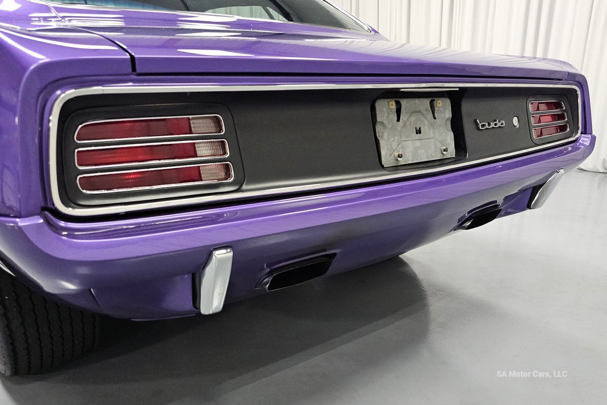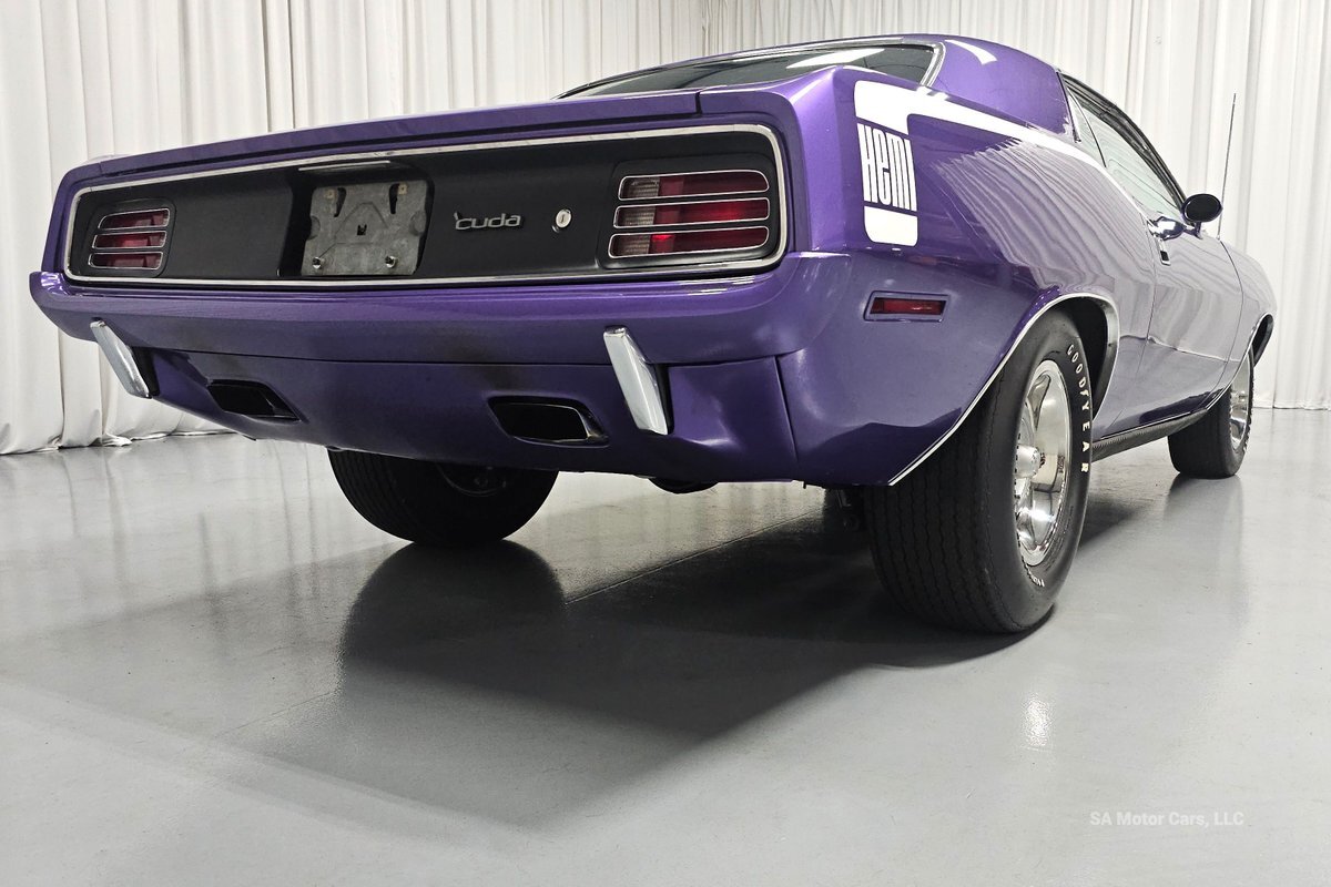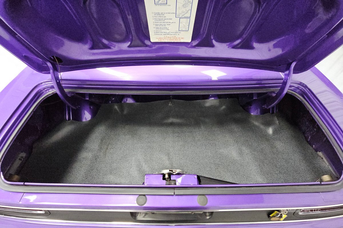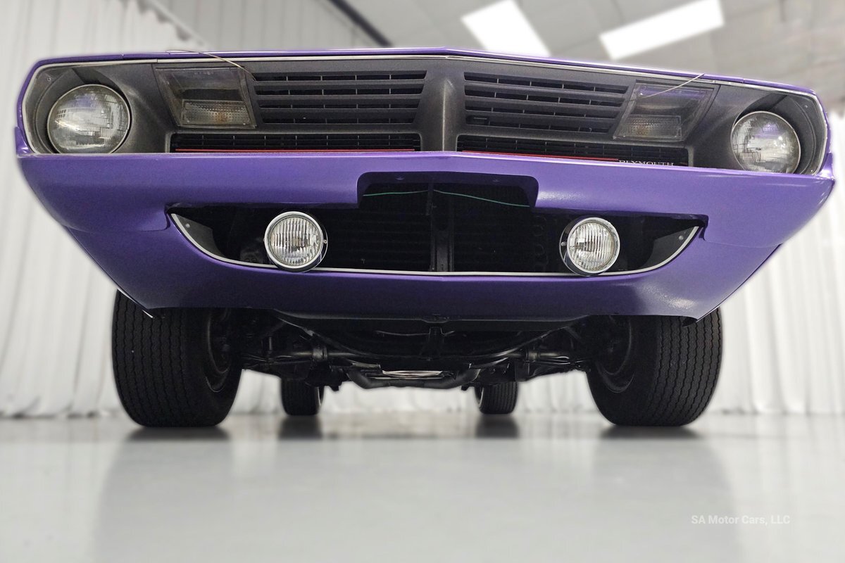 Check out this Stunning, All Original, Numbers Matching, with MMC DETROIT DAVID WISE PREMIUM DECODE Report, 1970 PLYMOUTH HEMI CUDA. This model of Hemi Cuda, there were only 368 built and of course this is one of them. This Cuda exterior is finished in a Beautiful Plum Crazy Purple Paint, sporting the Cuda badge on the tail end, Shaker Hood, White wide stripe with HEMI on both sides, on the back panels. The front and rear elastomeric bumpers are painted matching the car.