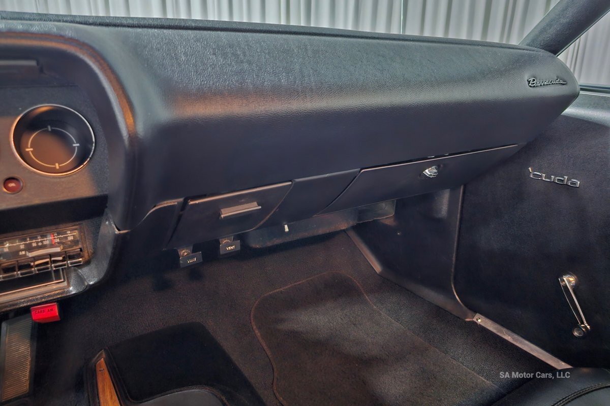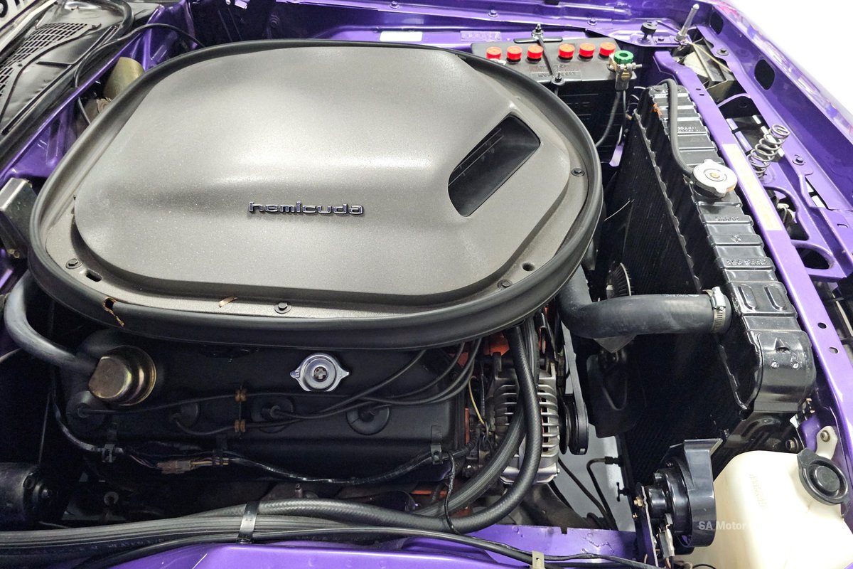 Sitting under the Shaker Hood of this Cuda is numbers matching 426C.I Hemi V8 Engine! She has 2X4BBL Carburetors, and power is put through via numbers matching A727 TorqueFlite Automatic Transmission! This baby pushes out around 425 horsepower.