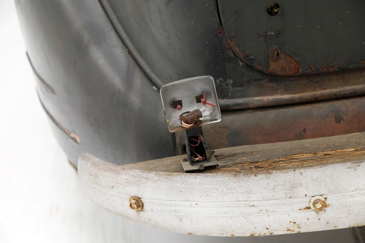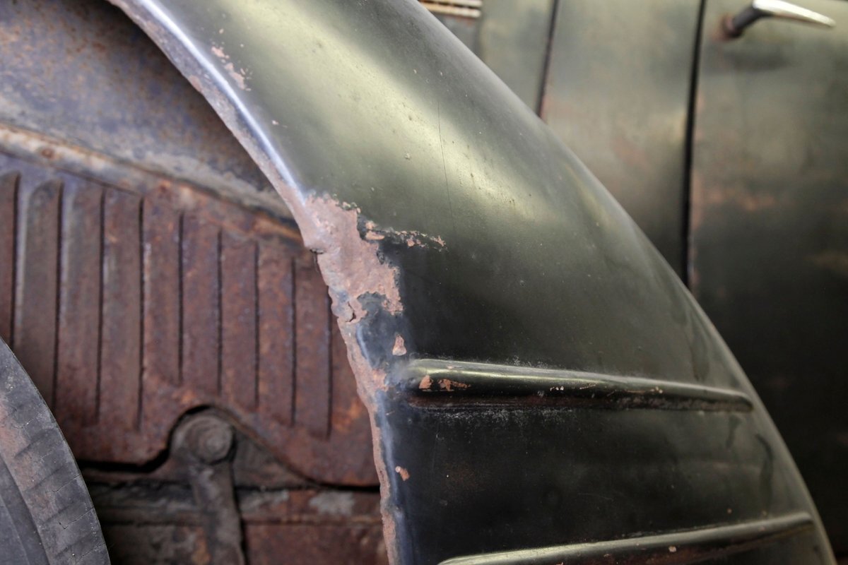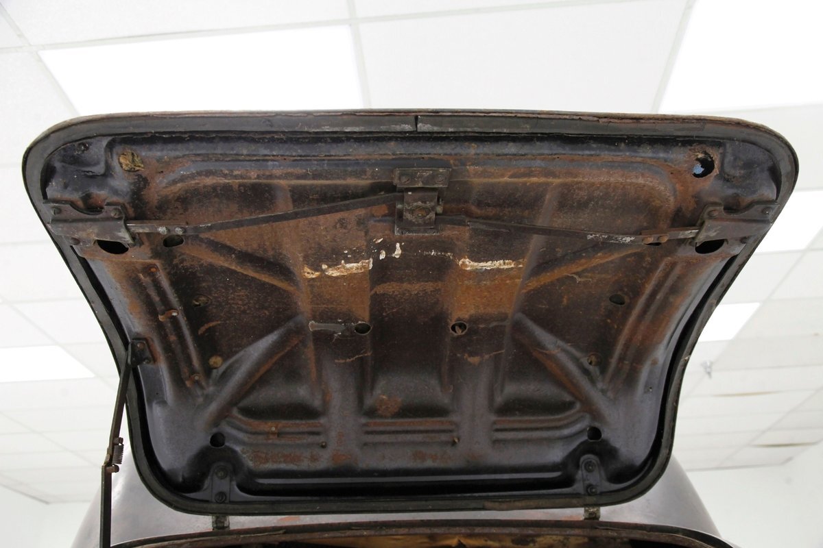 Up front, the Silver Streak treatment begins as a bright band, (now sadly heavily surface rusted), of multiple ribs running from the base of the windshield and across the top of the hood, forming a somewhat streamlined waterfall grille. Complementary touches included deco-inspired trim on the hood sides and large bullet styled encased circular headlights. Legend has it that the Silver Streak design theme was inspired by a photo of a Napier race car, its oil cooler protruding through the hood, that Hershey saw in a French magazine. Below is a rusted simple curved bumper framing the bottom of the car's front end. A large curved english wheel shaped fender, almost the beginnings of the pontoon styling, frames the front tire and wheel. This moves rearward eventually hooking up with a running board and then leading to the rear fender which is a simple curve inset more input the rear bodywork. The hood top and roofline have heavy surface rust and the sides are retaining their patina and dulled black paint. The running boards have an extra plate on them, presumably to cover up rust through damage underneath although these panels are also surface rusted. 4 doors, and all the glass that is in is clear but the driver's rear glass is missing. The roofline is surface rusted and all 4 doors are black painted and are rear hinged. In back a humpback styled trunk is on and it has a wonderful bottom curve created by the rear fender lines wrapping downward and curving across the back. Another simple curved bumper, this time not as rusted, frames the bottom and the tail light casings, although the lenses are gone. 16-inch steel wheels, surface rusted, have mixed style tires wrapping them to make the car easier to move around.
