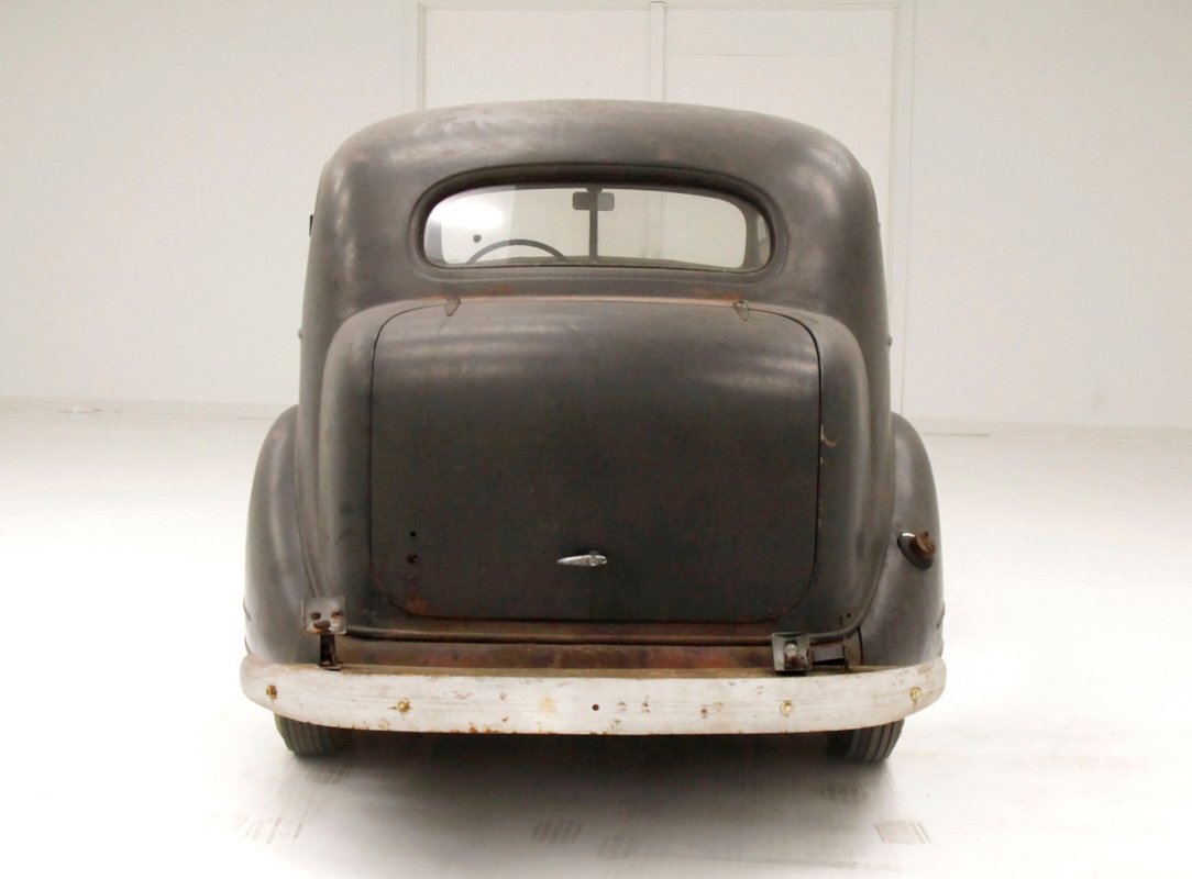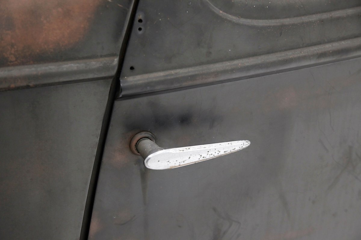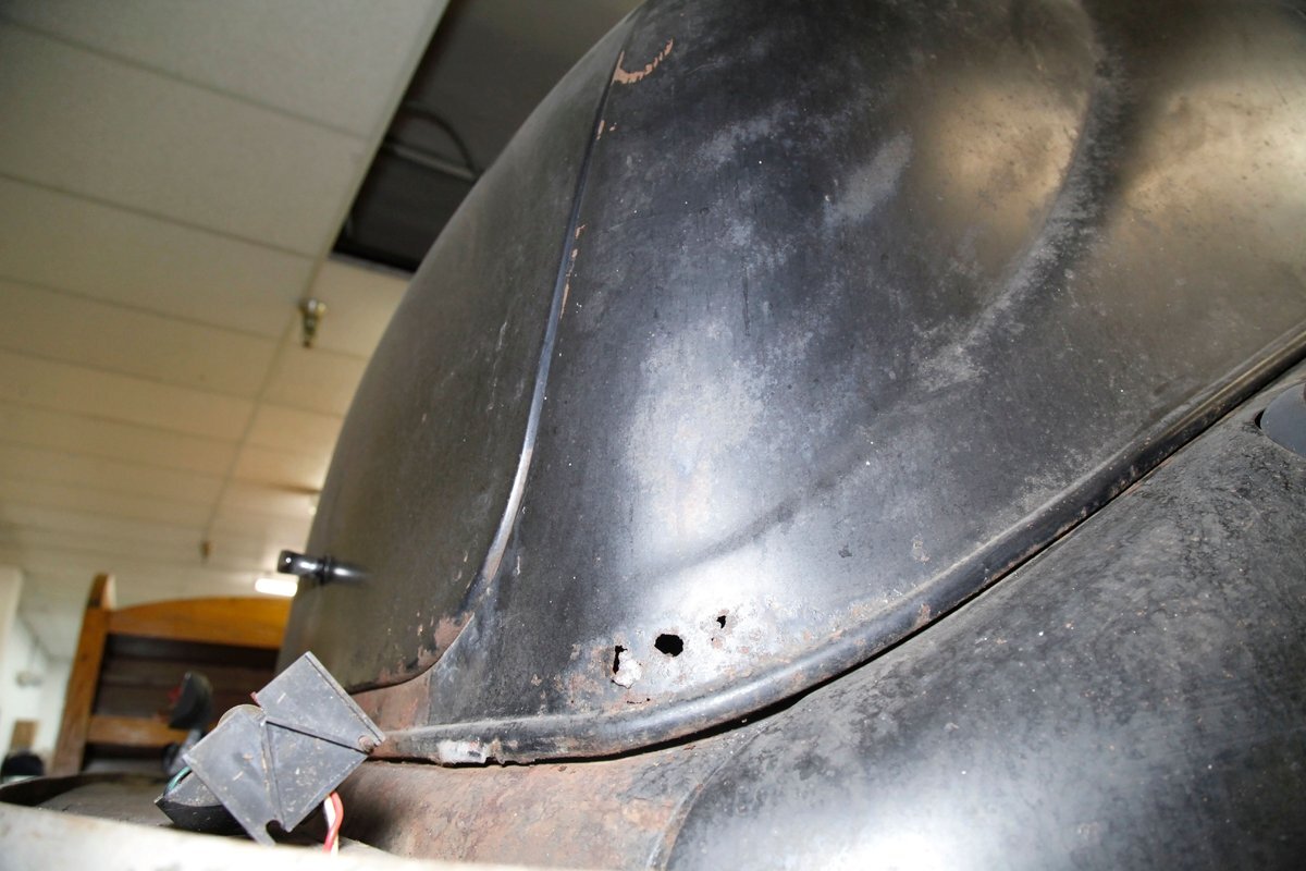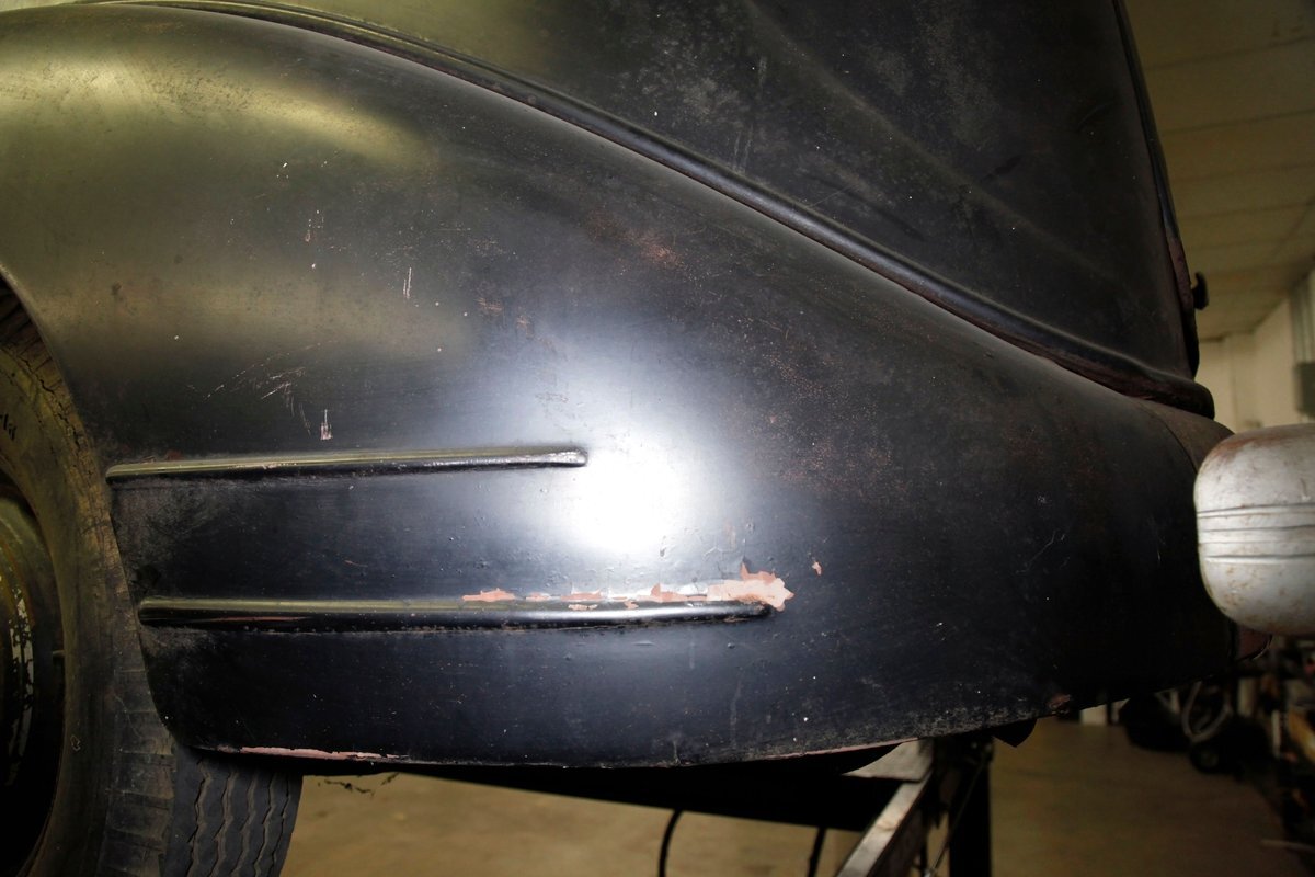 Up front, the Silver Streak treatment begins as a bright band, (now sadly heavily surface rusted), of multiple ribs running from the base of the windshield and across the top of the hood, forming a somewhat streamlined waterfall grille. Complementary touches included deco-inspired trim on the hood sides and large bullet styled encased circular headlights. Legend has it that the Silver Streak design theme was inspired by a photo of a Napier race car, its oil cooler protruding through the hood, that Hershey saw in a French magazine. Below is a rusted simple curved bumper framing the bottom of the car's front end. A large curved english wheel shaped fender, almost the beginnings of the pontoon styling, frames the front tire and wheel. This moves rearward eventually hooking up with a running board and then leading to the rear fender which is a simple curve inset more input the rear bodywork. The hood top and roofline have heavy surface rust and the sides are retaining their patina and dulled black paint. The running boards have an extra plate on them, presumably to cover up rust through damage underneath although these panels are also surface rusted. 4 doors, and all the glass that is in is clear but the driver's rear glass is missing. The roofline is surface rusted and all 4 doors are black painted and are rear hinged. In back a humpback styled trunk is on and it has a wonderful bottom curve created by the rear fender lines wrapping downward and curving across the back. Another simple curved bumper, this time not as rusted, frames the bottom and the tail light casings, although the lenses are gone. 16-inch steel wheels, surface rusted, have mixed style tires wrapping them to make the car easier to move around.