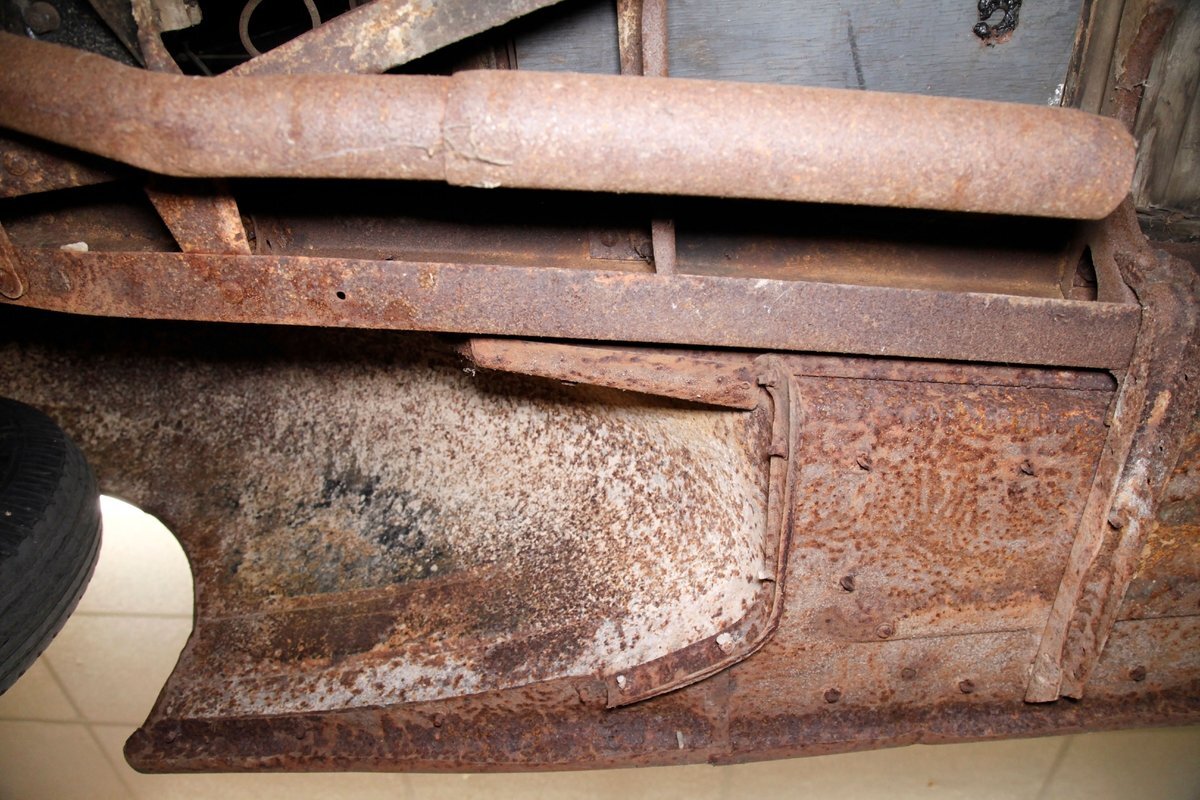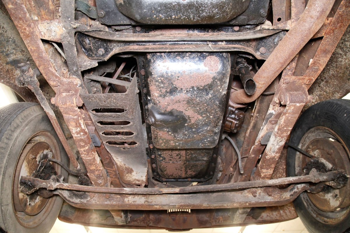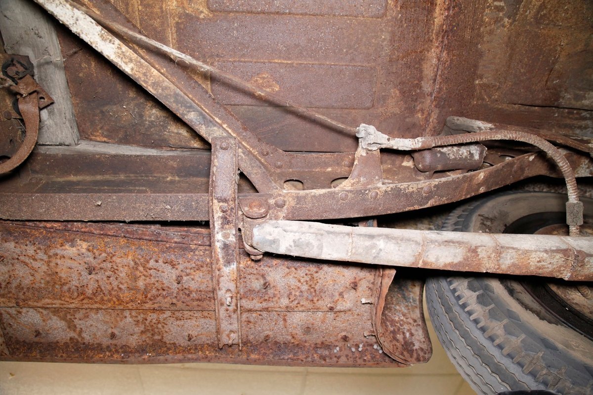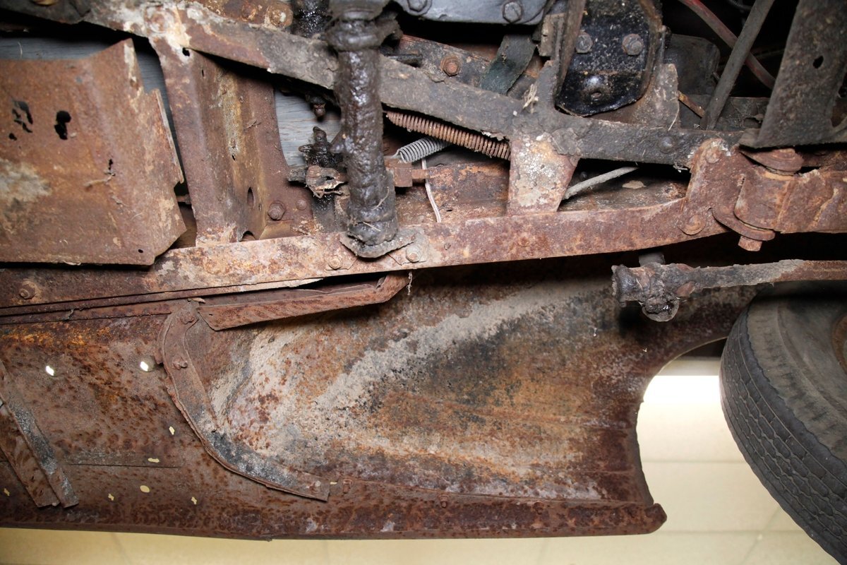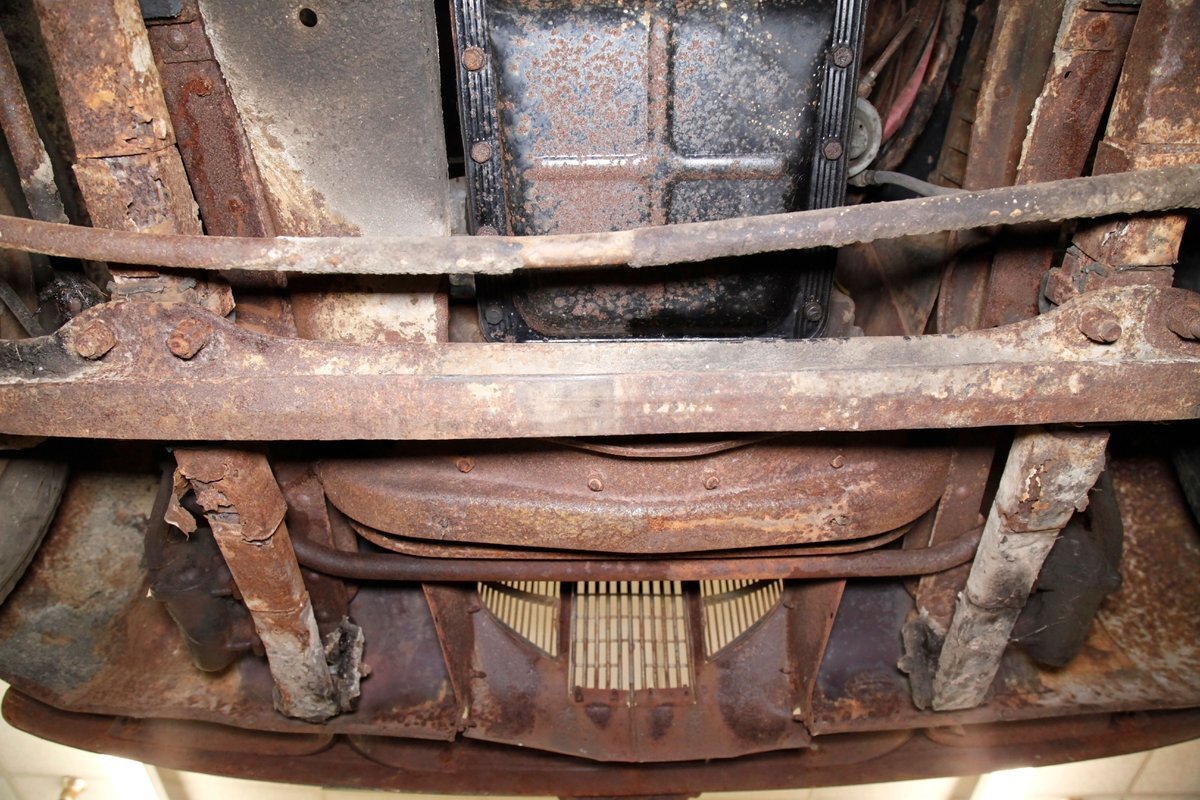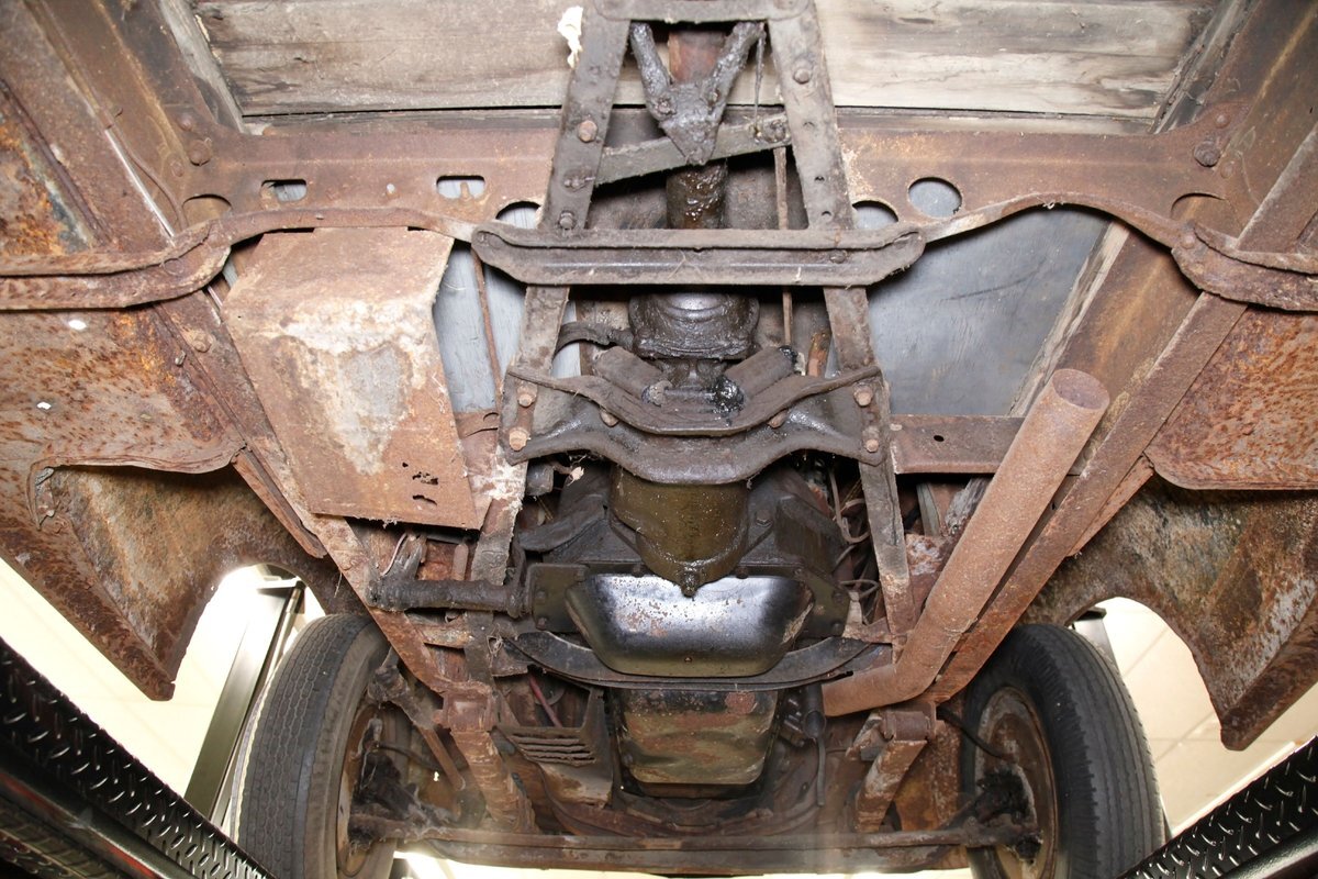 Heavy surface rust is vouchering all steel X framing, and stamped floor pans. The rust is heavier on the undersides of the floor boards and hangers for them. The beginnings of invasive rust holes are seen on the floor pans at various areas as well. Leaf springs are all around, and drum braking is on all 4 corners.