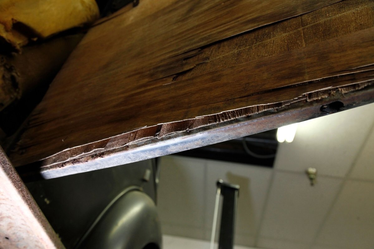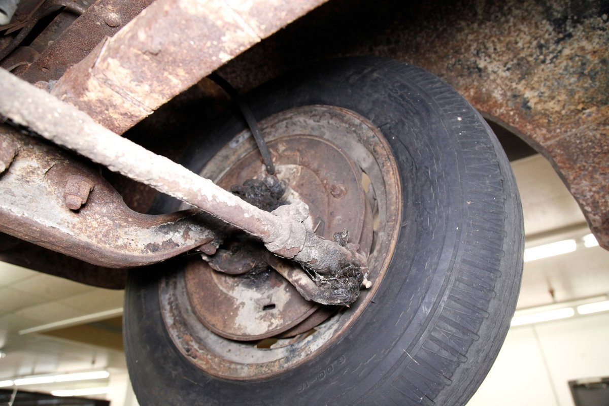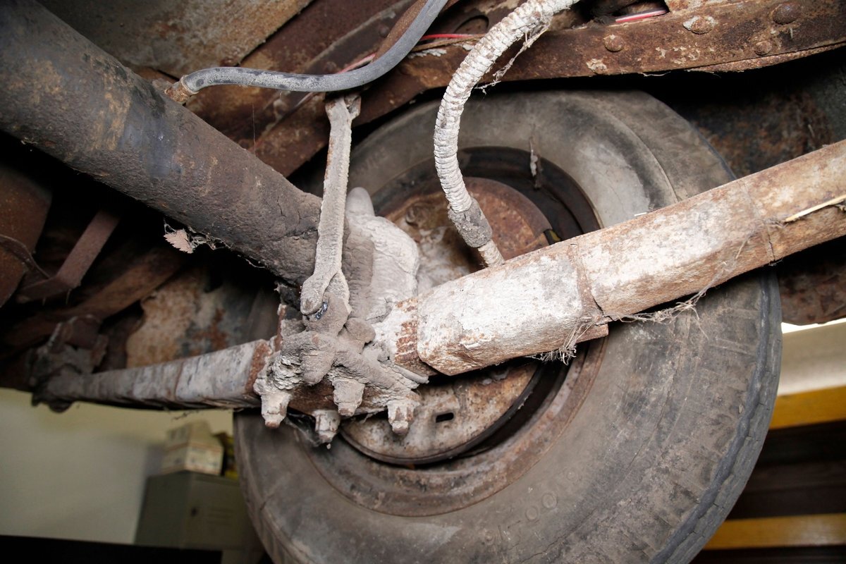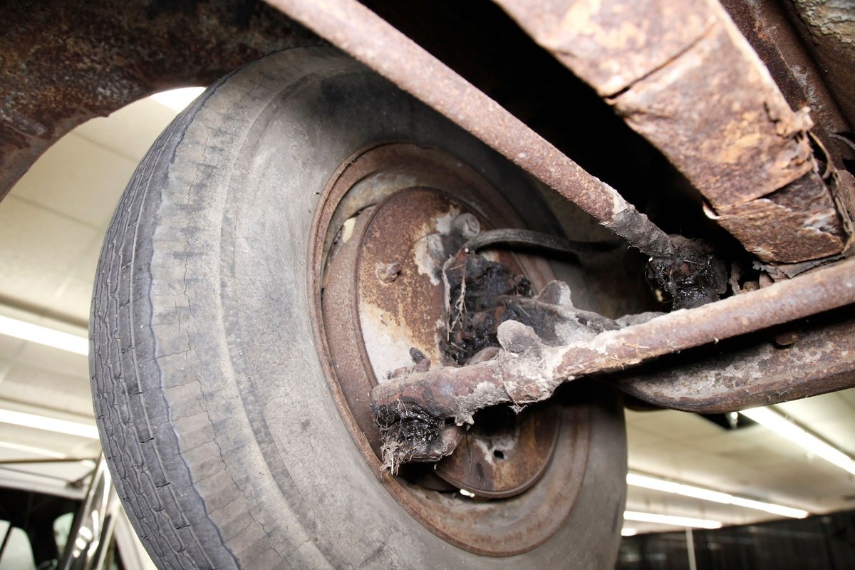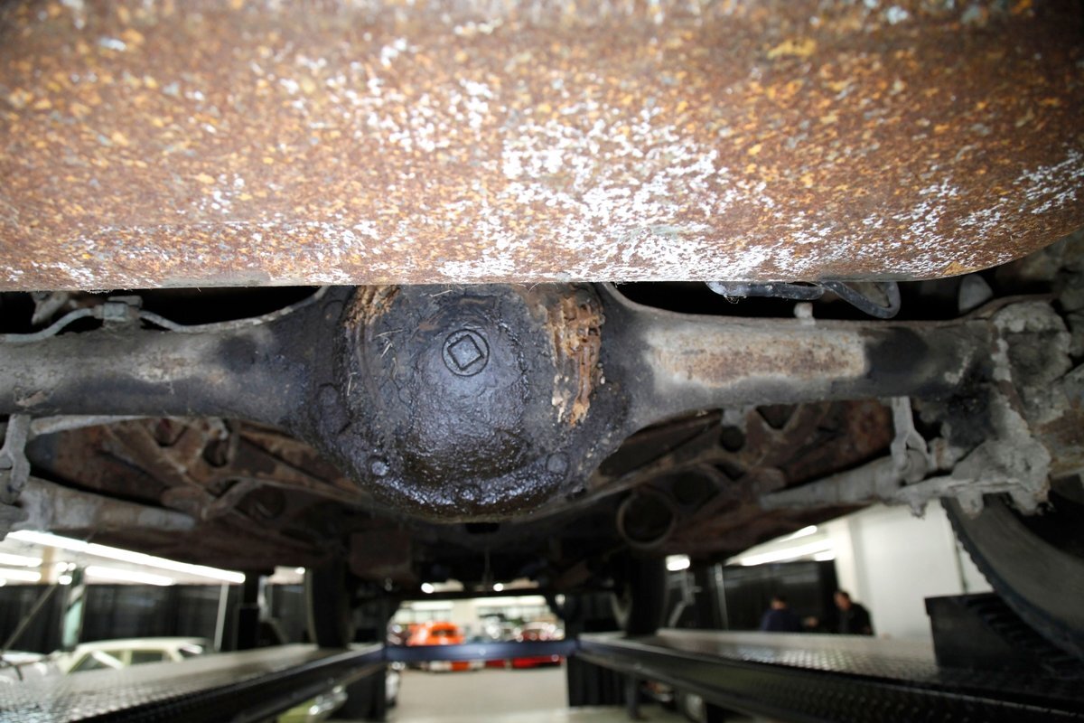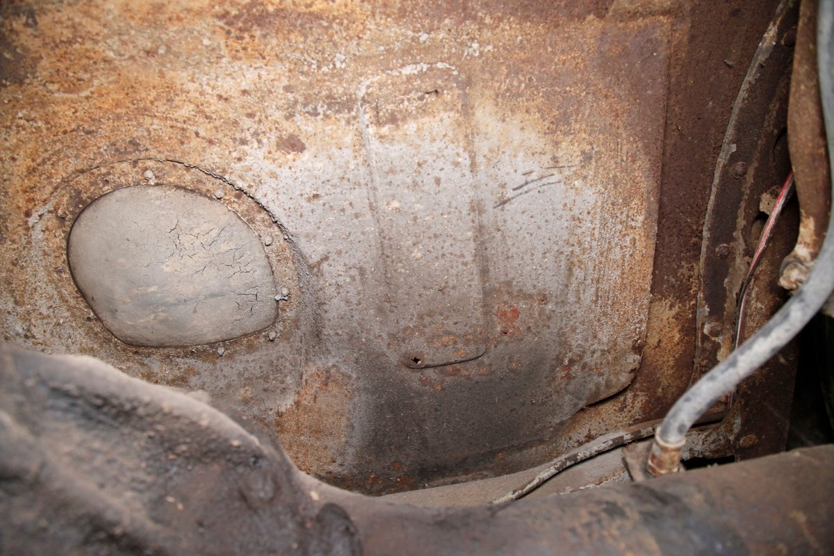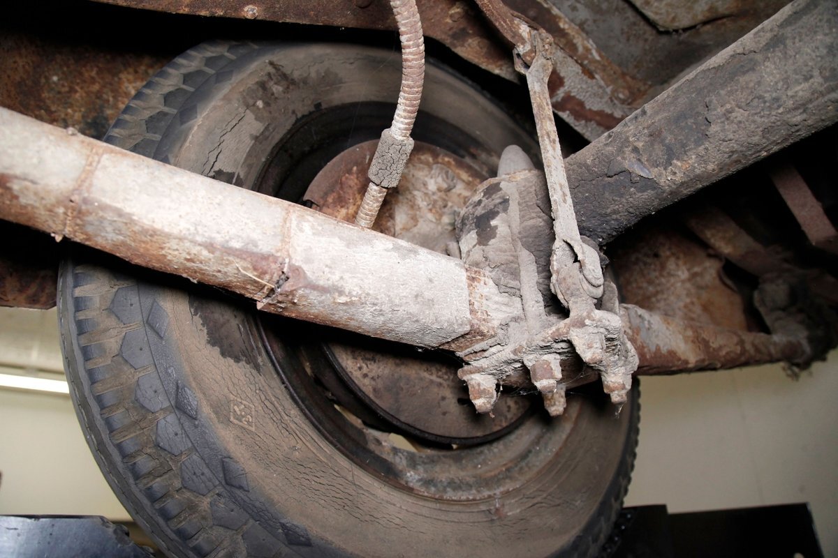 Heavy surface rust is vouchering all steel X framing, and stamped floor pans. The rust is heavier on the undersides of the floor boards and hangers for them. The beginnings of invasive rust holes are seen on the floor pans at various areas as well. Leaf springs are all around, and drum braking is on all 4 corners.