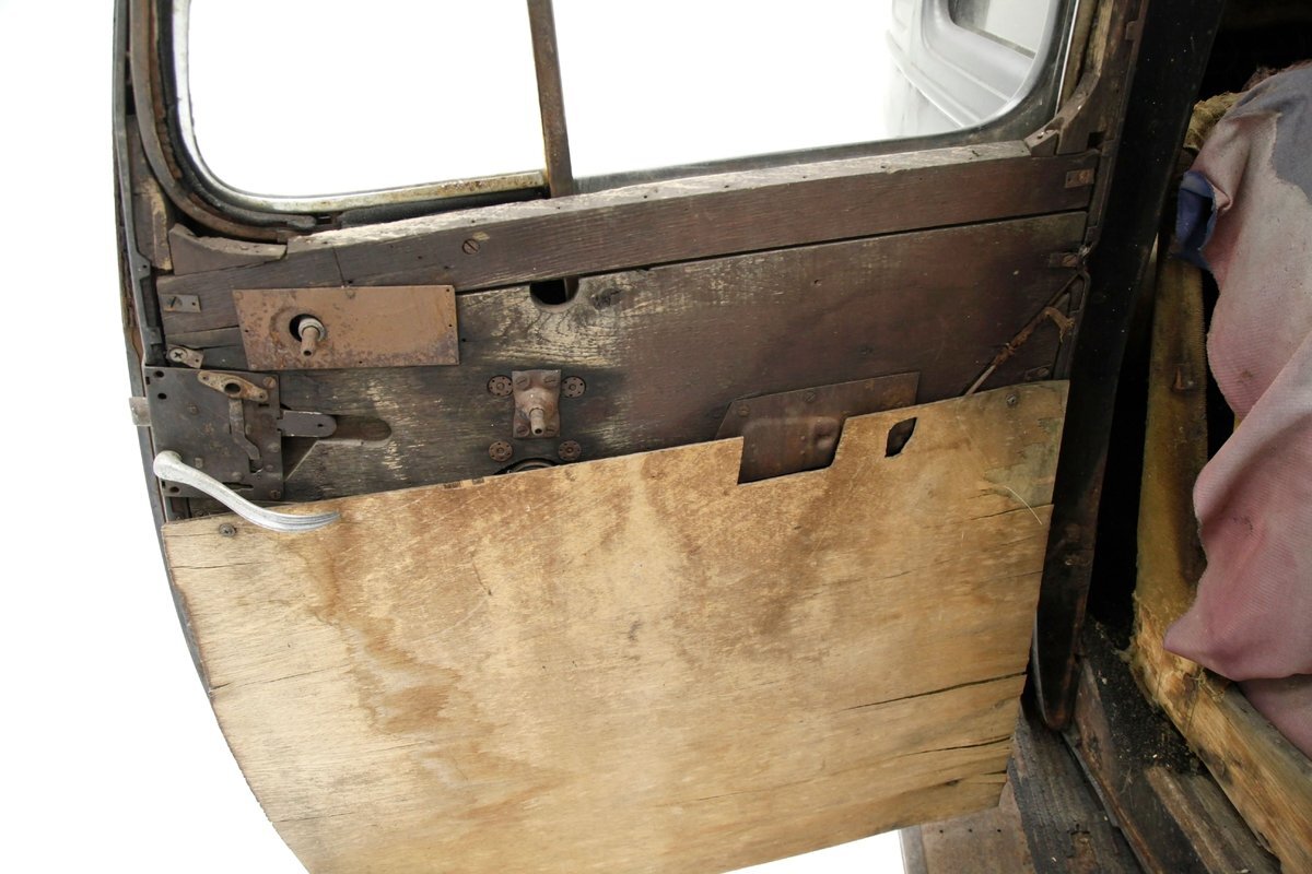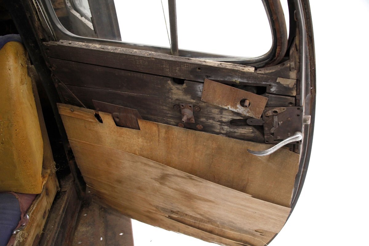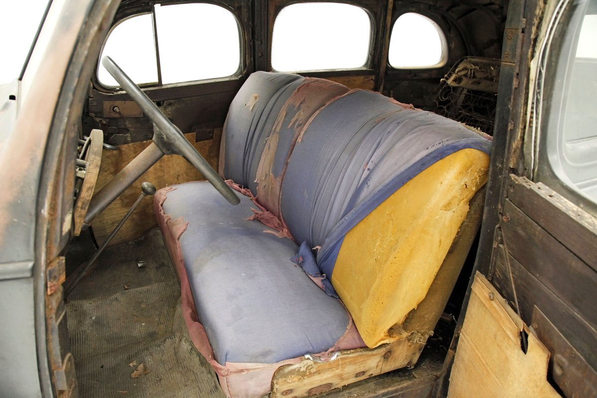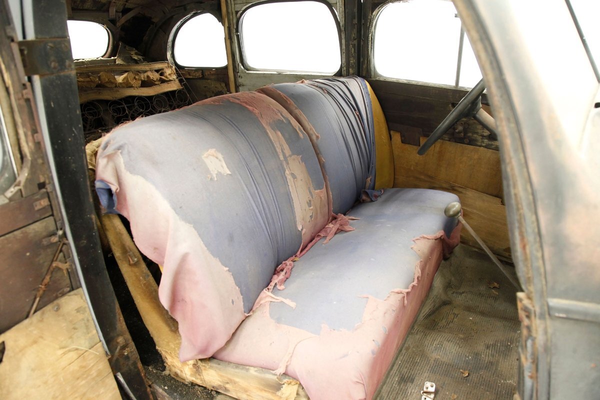 A swing of the doors and we see no real door panels to speak of and the replacement wood panels have long since been water damaged and rotted out. A front and rear bench are in and all their coverings have been taken away by time. The headliner and side interior panels are dry rotted away revealing the structural metal. The dual eyebrow curved dash front is in need of total restoration, as are the floors and instrument panel of the dash.