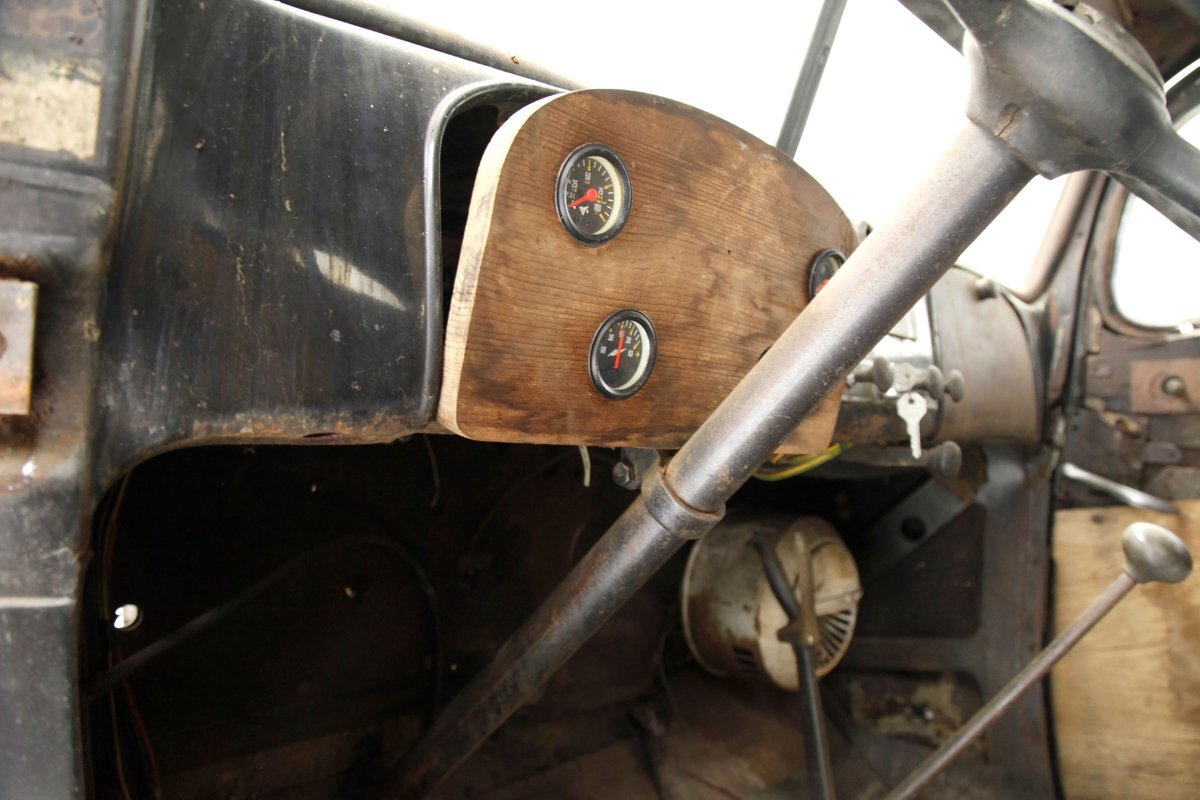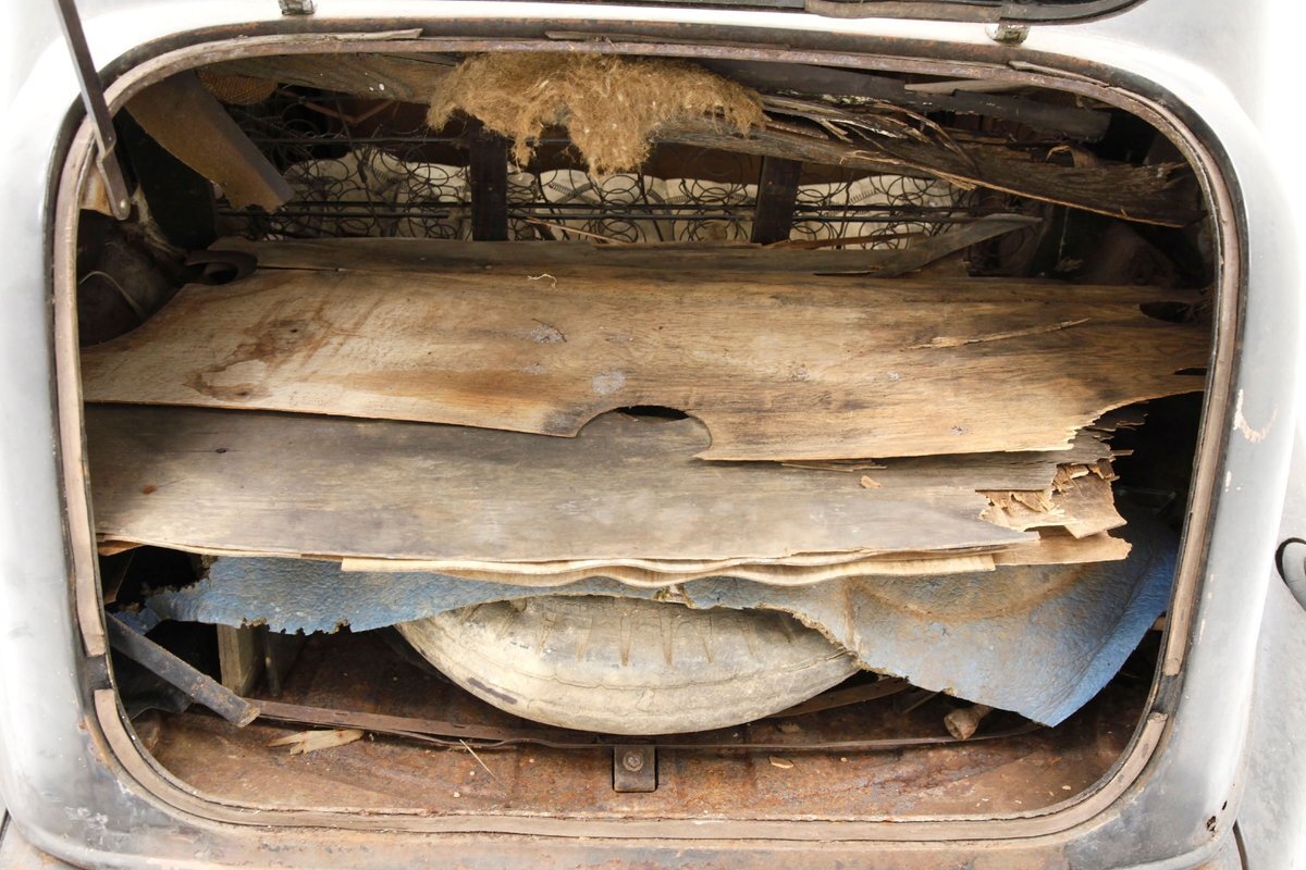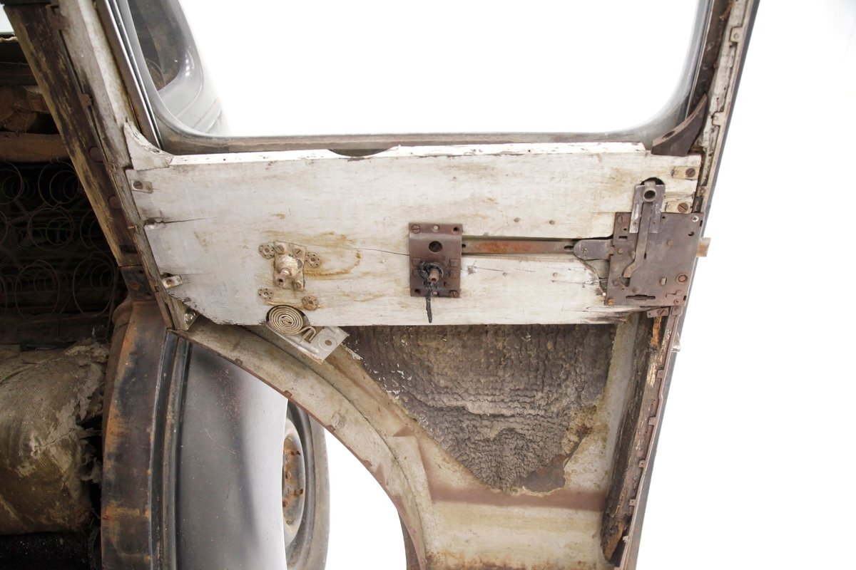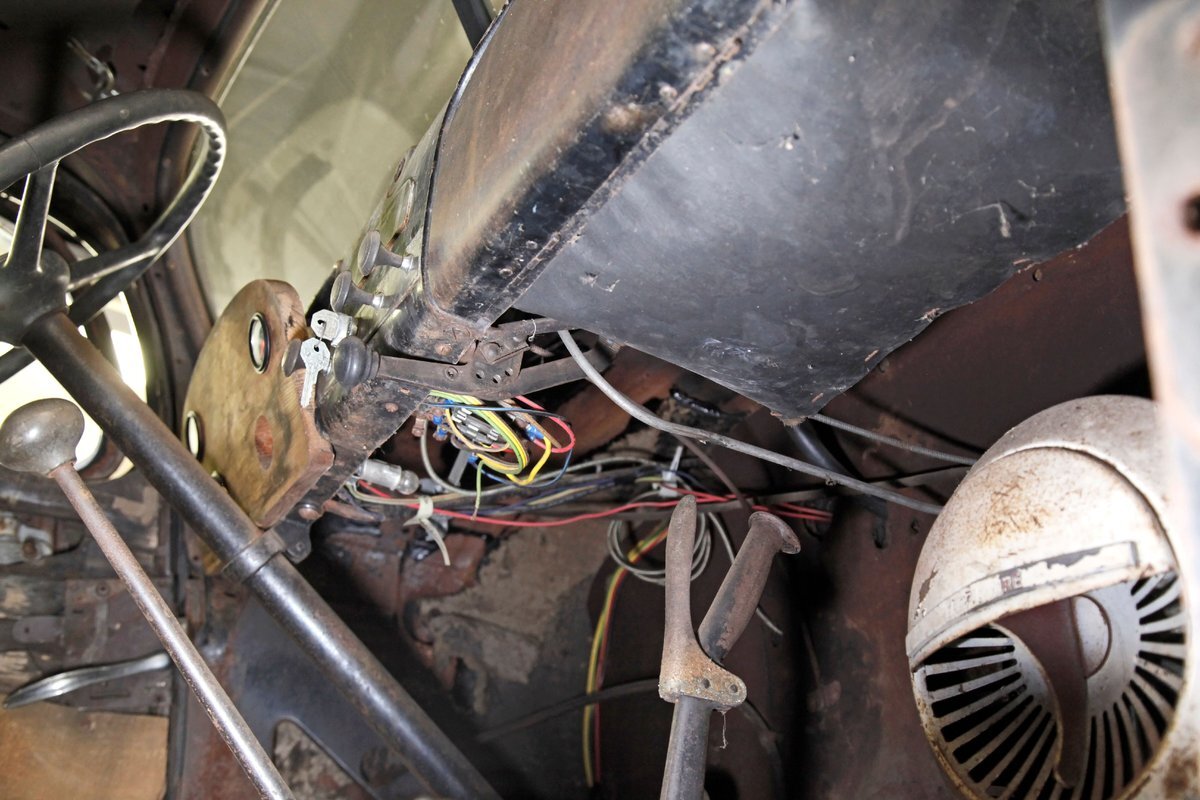 A swing of the doors and we see no real door panels to speak of and the replacement wood panels have long since been water damaged and rotted out. A front and rear bench are in and all their coverings have been taken away by time. The headliner and side interior panels are dry rotted away revealing the structural metal. The dual eyebrow curved dash front is in need of total restoration, as are the floors and instrument panel of the dash.