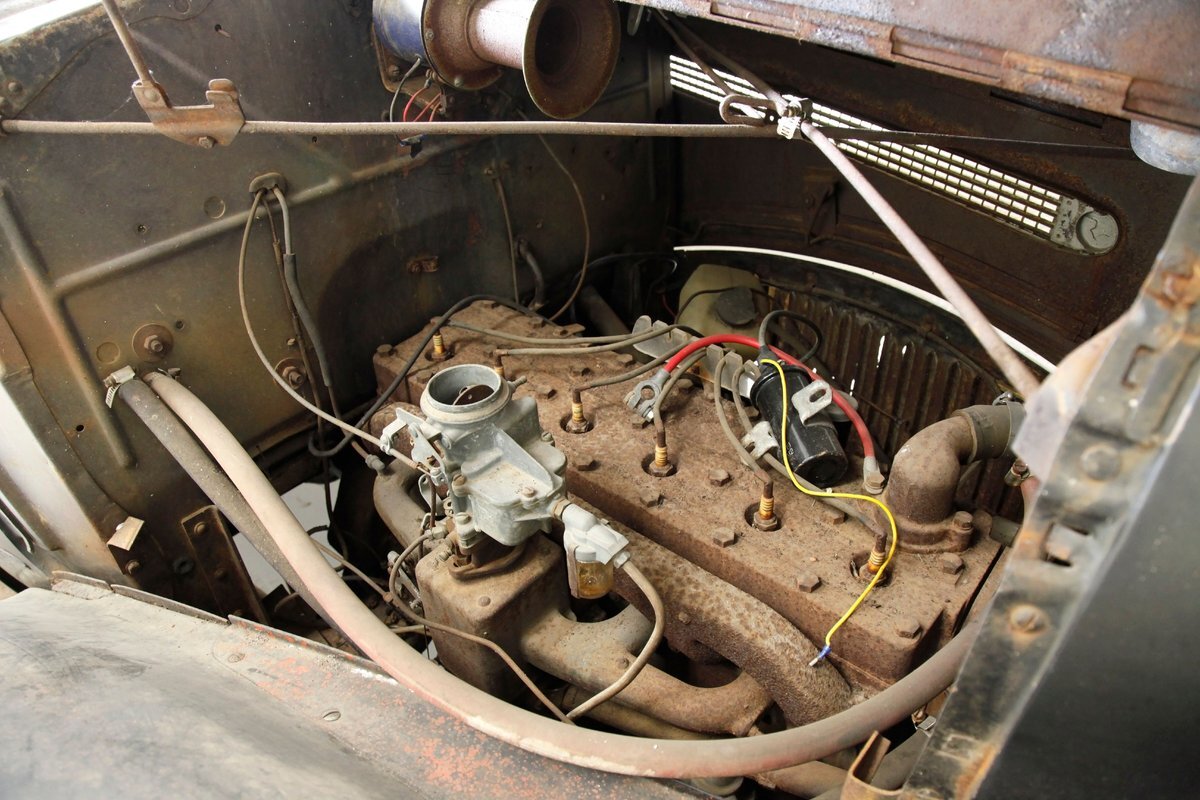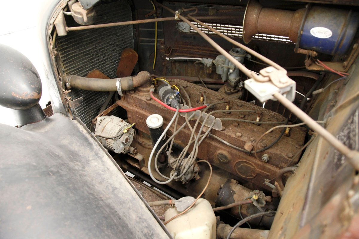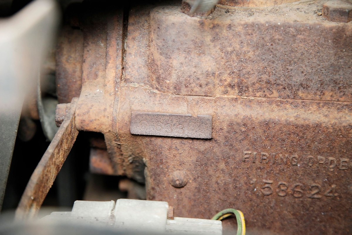 Under the hood is a 208ci Inline 6 cylinder. It has a 1 barrel carburetor and a 3 speed manual transmission. On the back is a 4.44 rear axle. The engine does not presently run and plenty of surface rust and corrosion is noted for this engine and bay.