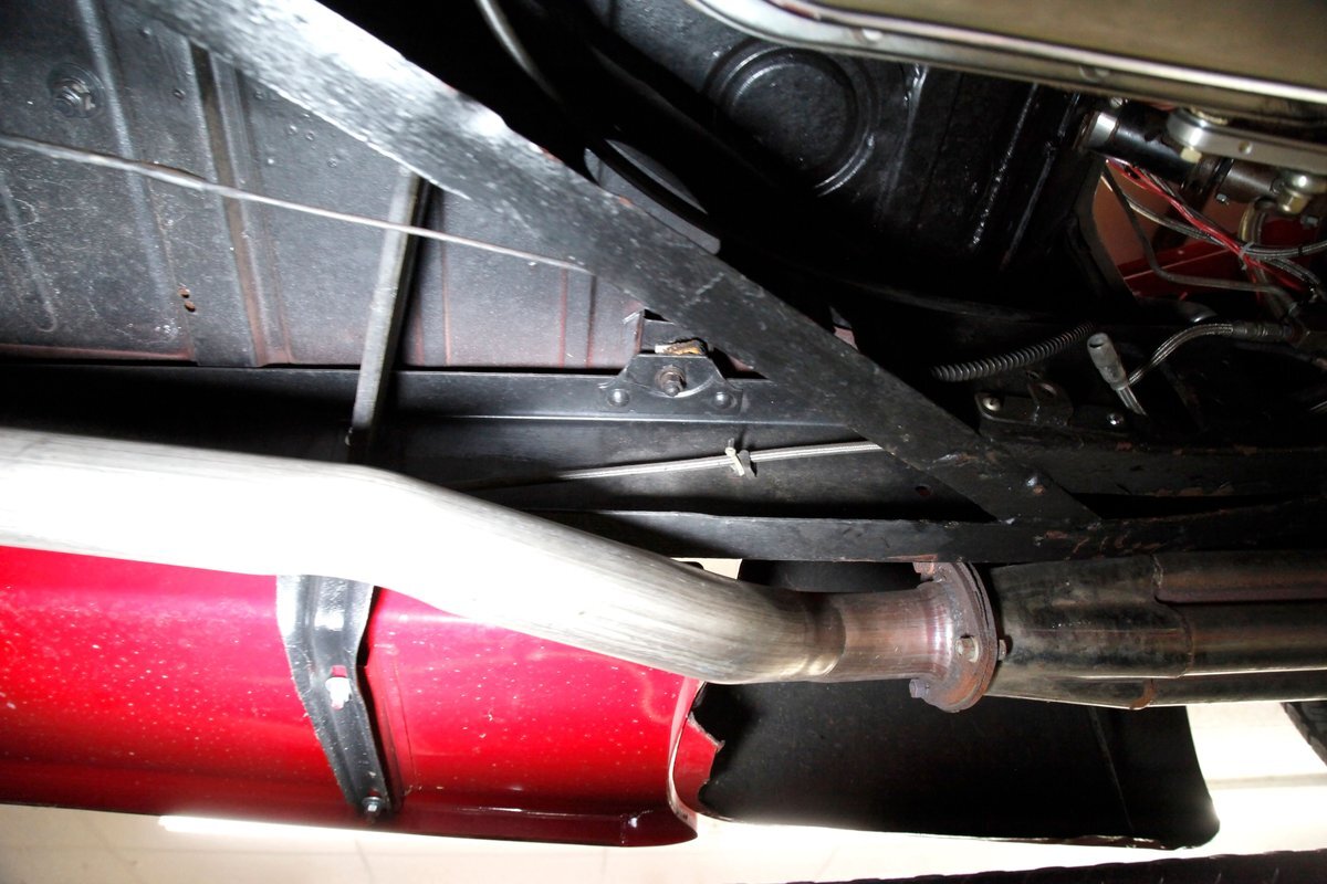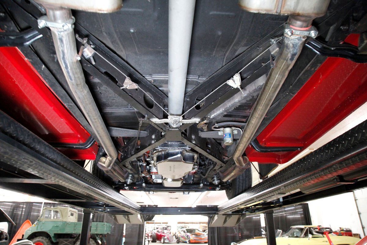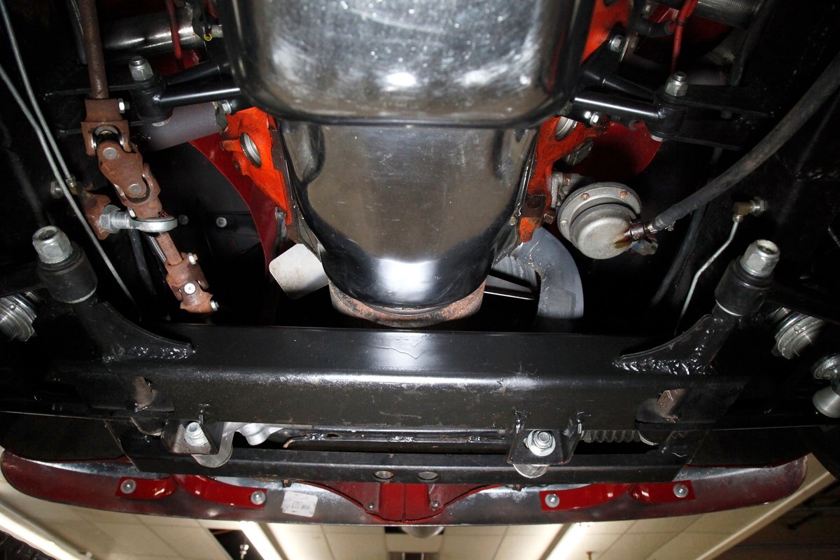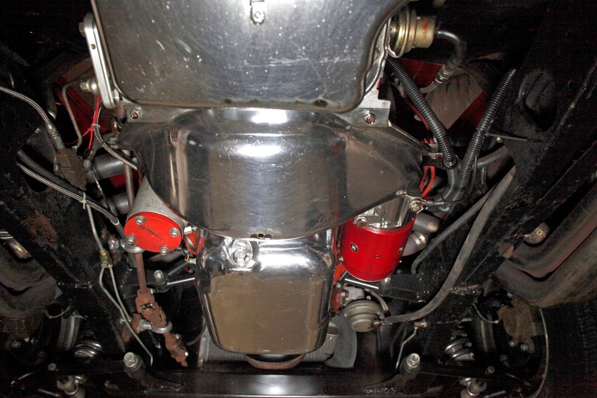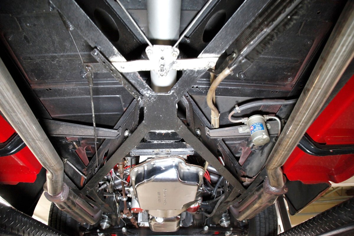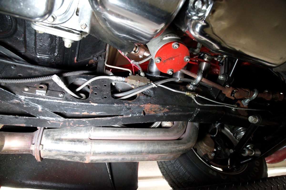 Underneath as clean and shiny as the top side, with black painted steel X framing and floor pans as well as clean wheel well interiors. A black, like new fuel tank is strapped to the chassis and the pumpkin has a chromed plate on the back. Flowmaster dual exhaust is seen snaking its way from front to rear and piping is stainless steel. Noted is a Mustang II front suspension is on and on back leaf springs with traction bars.