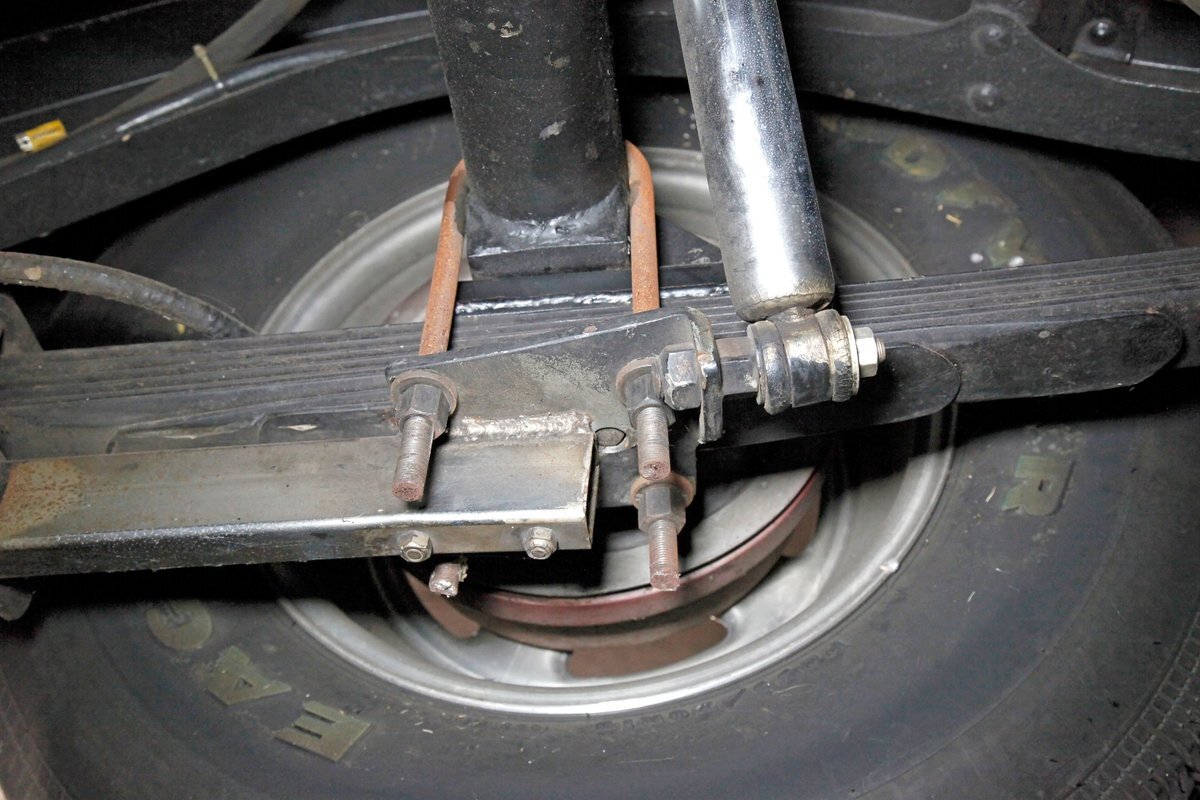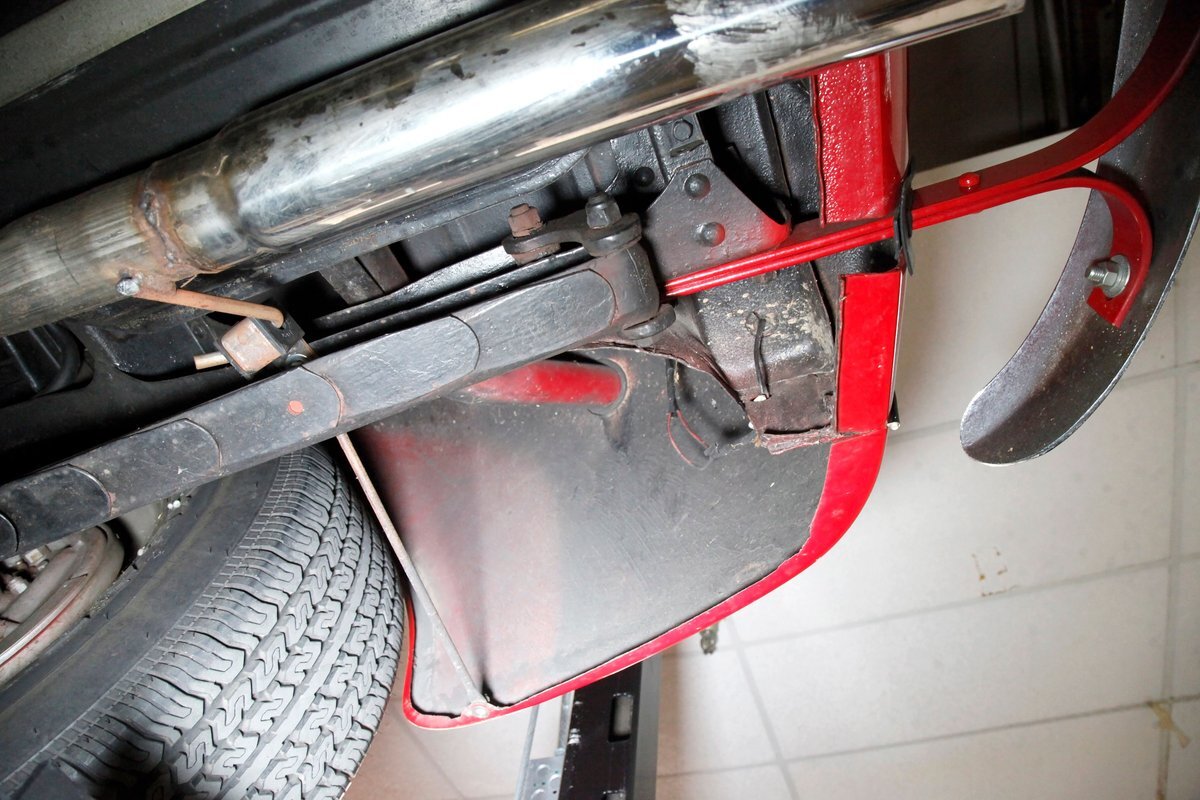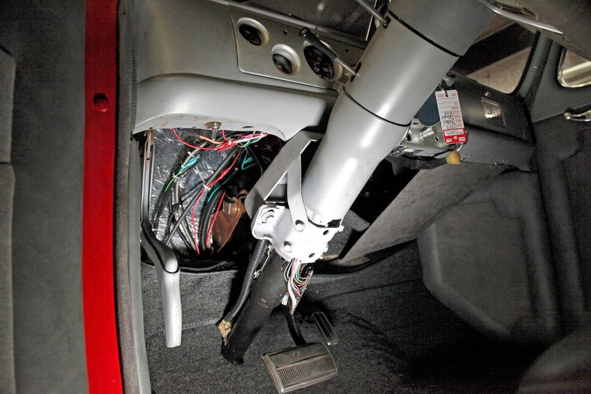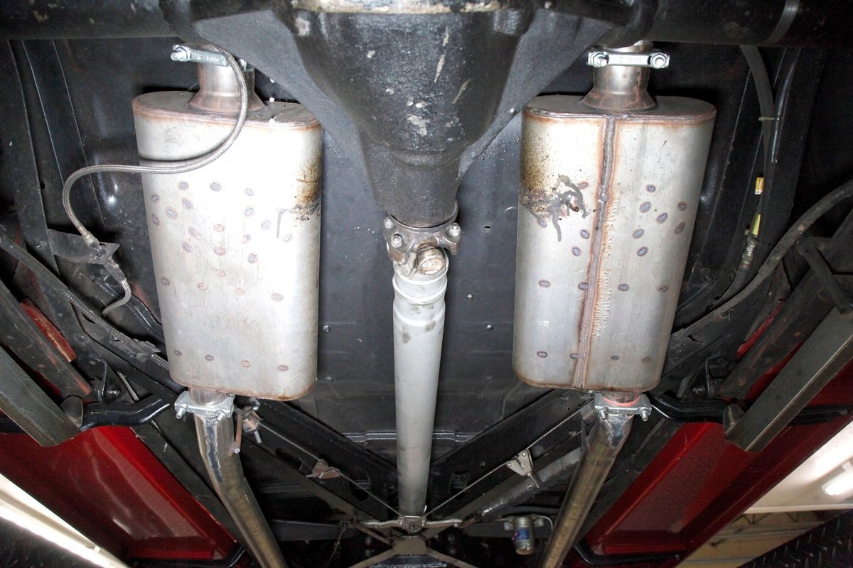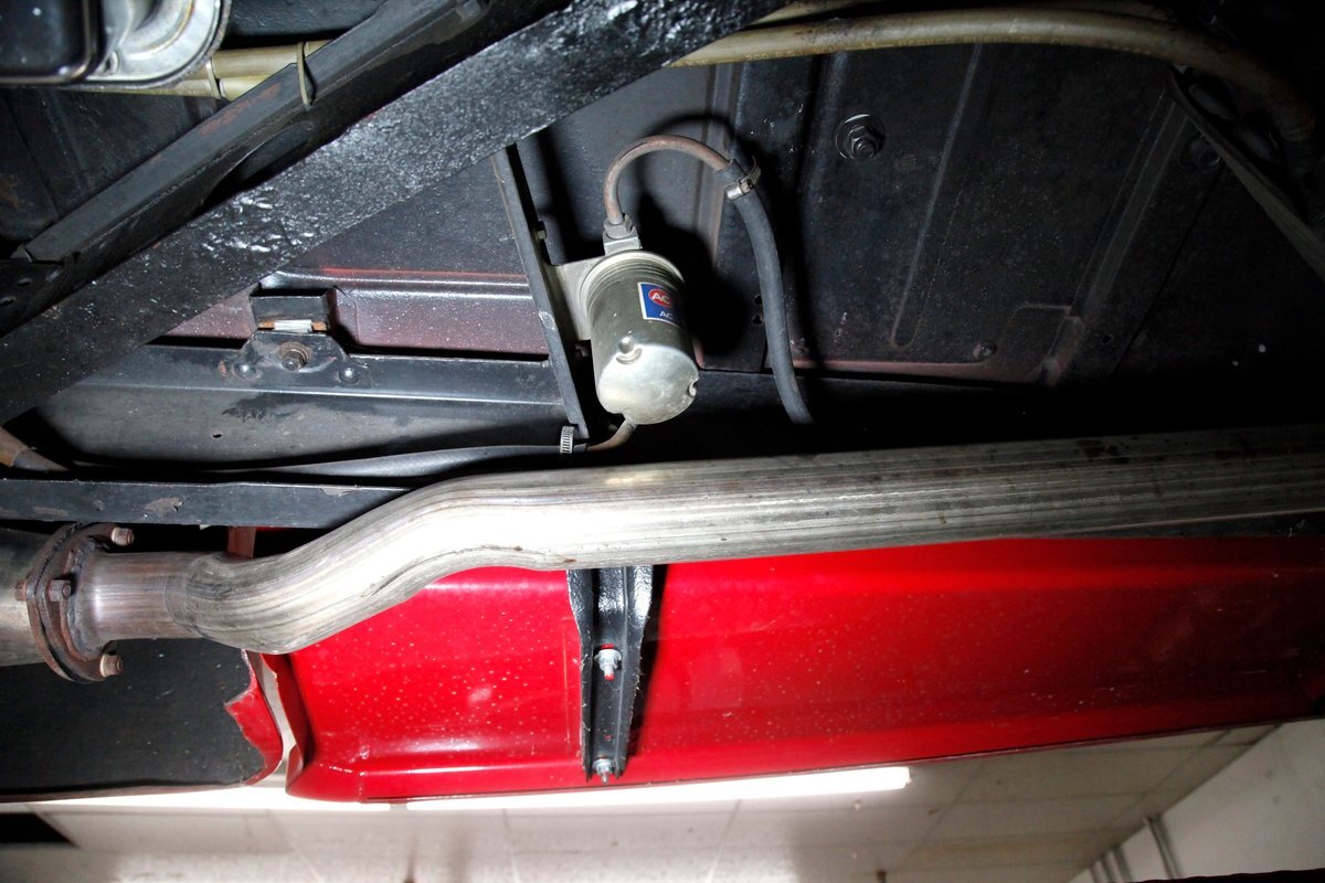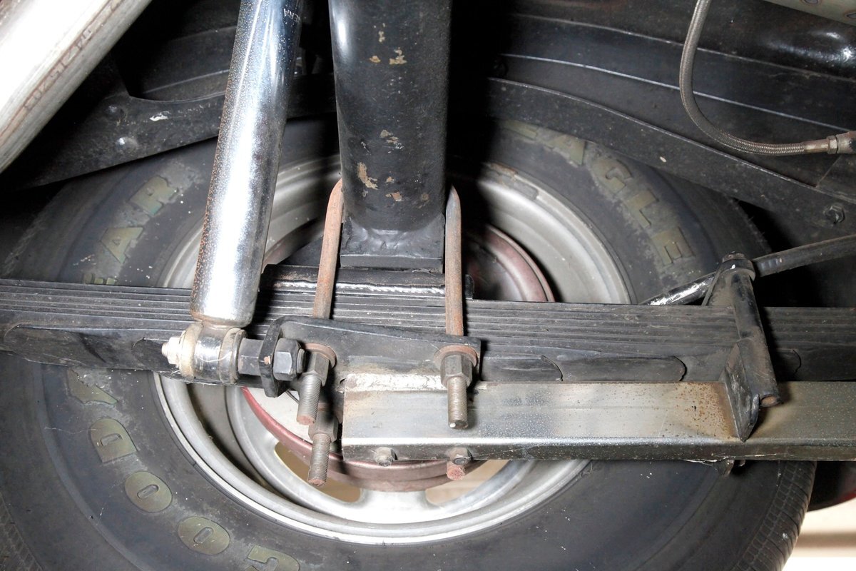 Underneath as clean and shiny as the top side, with black painted steel X framing and floor pans as well as clean wheel well interiors. A black, like new fuel tank is strapped to the chassis and the pumpkin has a chromed plate on the back. Flowmaster dual exhaust is seen snaking its way from front to rear and piping is stainless steel. Noted is a Mustang II front suspension is on and on back leaf springs with traction bars.