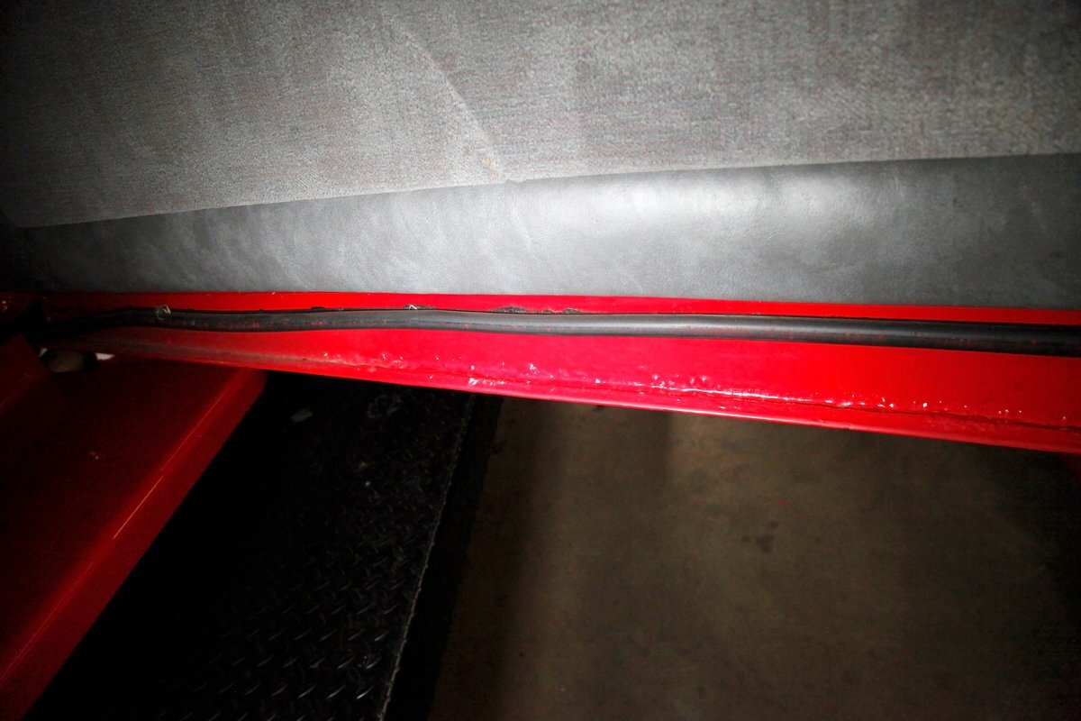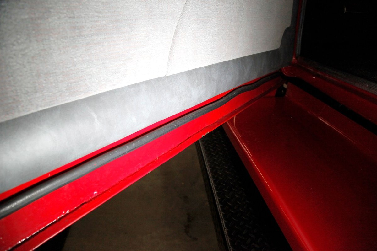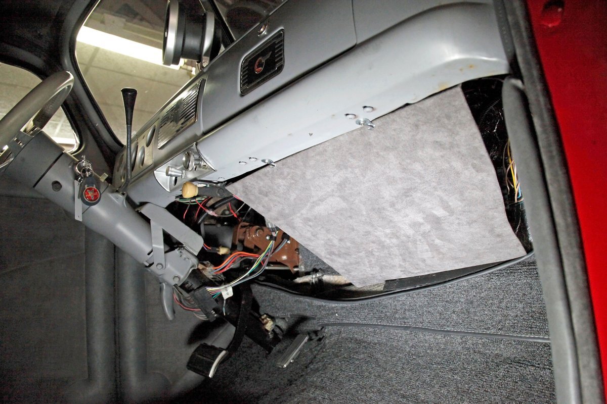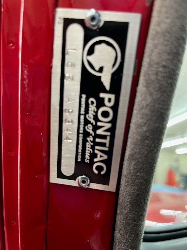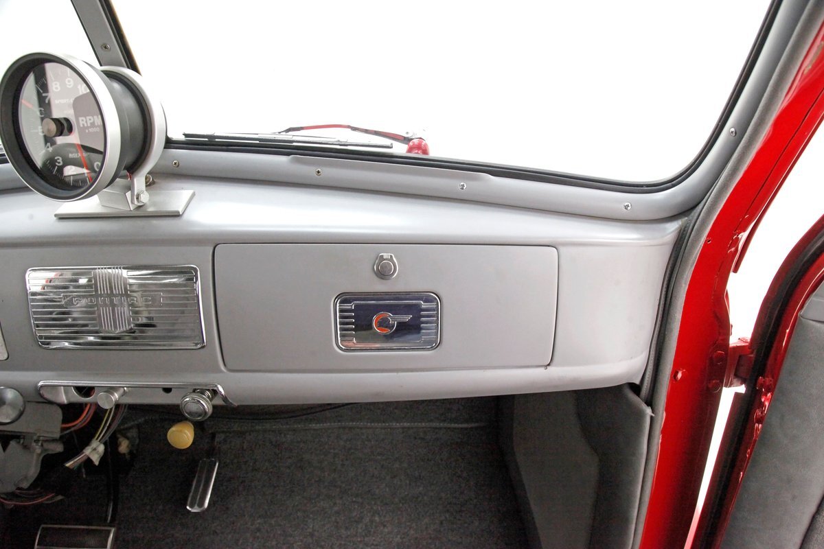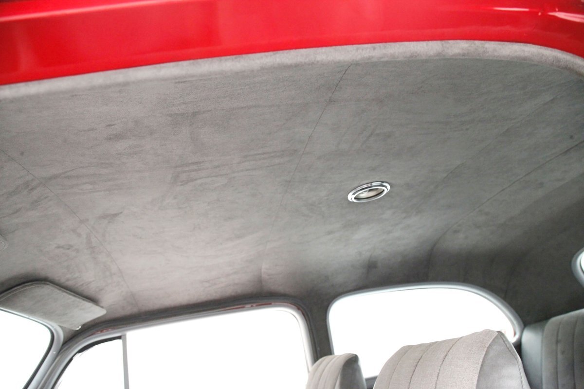 A swing of the doors and we are in custom heaven. This is accentuated by a frame on the edges of dark gray vinyl and on the interior said frame, a light gray broadcloth which resembles suede. Some snappy billet style handles and cranks are seen as is a comfy light gray armrest. Inside, floating on medium gray tweed carpeting peppered with some sparse color threading floats smooth high back buckets sans headrests. These have the darker gray vinyl for the bolsters and more of the suede like broadcloth tucked and rolled for the inserts. A back seat stretches across the rear and has a wide dark gray center on the vinyl to add a bot of interest to the large expanse of the tuck and roll light gray. In front we see a custom dash with an all new instrument cluster now sporting round black faced and white lettered circular gauges and small round turn signal lights. In the center is an original chromed panel with horizontal ribs and a central P O N T I A C badge. Fronting the dash is a tilt column and a Lecarra rally steering wheel covered in ivory padded leather. On the dash top is a GIANT tachometer you cannot miss! Above is more suede-esque light gray broadcloth stitched in for the tight headliner. The trunk has been grayed and tweed carpeted and the car comes with a matching wood mailbox now stored in the trunk. All a neat neutral contrast to the exterior Red.