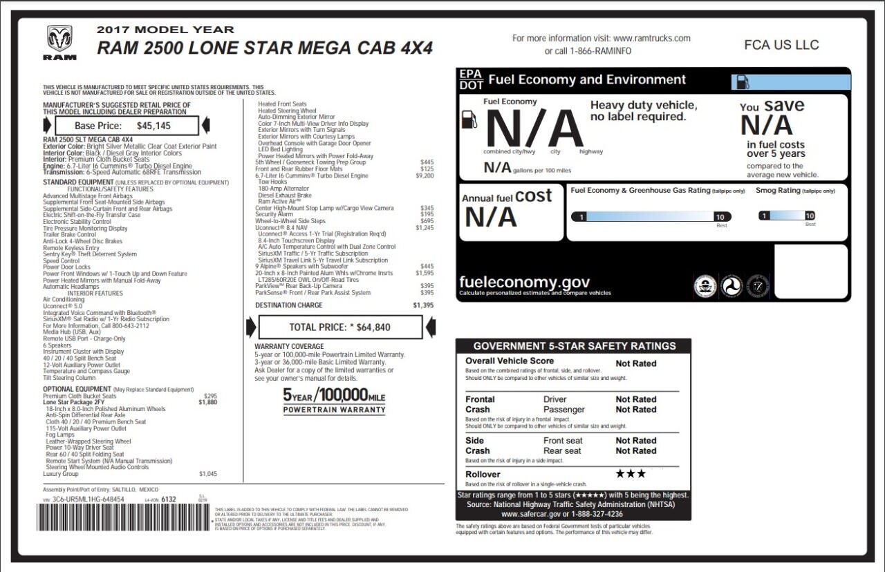PLEASE CALL ONE OF OUR SALES ASSOCIATES AT713-489-2380 FOR PERSONAL ASSISTANCE AND TO GET MORE INFORMATION ABOUT THIS VEHICLE.WE ARE LOCATED AT 12423 W SAM HOUSTON PKWY S HOUSTON TX 77031ADDITIONAL SIMILLAR UNITS IN STOCKTHIS VEHICLE QUALIFIES FOR EXTENDED WARRANTY STARTING AT $2990HIGHLIGHTS:2017 RAM 2500 LONE STARVIN: 3C6UR5ML1HG648454CREW PICKUP6.7L I6 F OHV 24VDIESELREAR WHEEL DRIVE W/ 4X4Original Window StickerNO ACCIDENTS OR DAMAGE REPORTED TO CARFAXRAM 2500 SLT MEGA CAB 4X4Exterior Color: Bright Silver Metallic Clear Coat Interior Color: Black / Diesel Gray Interior: Premium Cloth Bucket SeatsEngine: 6.7-Liter I6 Cummins Turbo Diesel Engine Transmission: 6-Speed Automatic 68RFE TransmissionTire Pressure Monitoring DisplayTrailer Brake ControlRemote Keyless EntrySpeed ControlPower Door LocksPower Front WindowsAutomatic HeadlampsAir ConditioningBluetoothSat RadioMedia Hub (USB, Aux)Remote USB Port - Charge-Only6 Speakers12-Volt Auxiliary Power OutletTemperature and Compass GaugeTilt Steering ColumnPremium Cloth Bucket SeatsLone Star PackageFog LampsLeather-Wrapped Steering WheelPower SeatSteering Wheel Mounted Audio ControlsHeated Front SeatsHeated Steering WheelAuto-Dimming Exterior MirrorOverhead Console with Garage Door OpenerLED Bed LightingTow HooksDiesel Exhaust BrakeNAVIGATION8.4-Inch Touchscreen DisplayA/C Auto Temperature Control with Dual Zone Control9 Alpine Speakers with SubwooferRear Back-Up CameraAND MANY MORE ... Flying in to Houston to pick up your vehicle? For your convenience we offer FREE ride from IAH and HOU airports in Houston to our dealershipAll financial transactions should be completed within a reasonable period of time usually within six days after we receive the deposit.We accept and prefer PayPal deposit made to . We accept major credit cards and debit cards for $500.00 ONLY.***ALL DEPOSITS ARE NON-REFUNDABLE***All our Vehicles are sold as is where is with no warranty expressed written or implied. The Seller shall not be responsible for the correct description authenticity genuineness or defects herein and makes no warranty in connection therewith. No allowance or set a side will be made on account of any incorrectness imperfection defect or damage. Any descriptions or representations are for identification purposes only and are not to be construed as a warranty of any type. It is the responsibility of the buyer to have thoroughly inspected the vehicle and to have satisfied himself or herself as to the condition and value and to buy based upon that judgement solely. The seller shall and will make every reasonable effort to disclose any known defects associated with this vehicle at the buyer's request prior to the close of sale. Seller assumes no responsibility for any repairs regardless of any oral statements about the vehicle.All buyers are responsible to pay Texas V.I.T tax (Vehicle Inventory Tax). Which is 0.002018 of the purchase price (Example: $10000.00 purchase = $20.18) $150.00 documentary fee $5.00 buyers tag fee and a $295.00 dealer preparation fee Texas buyers must pay 6.25% sales tax plus $137.00 registration fee. Out-Of state buyers are responsible to pay their tax within 21 days of purchase.Everest Motors Inc Advantage Plus:For $795.00 customers will benefit from 3 Years Key replacement 3 Years Paint less Dent Removal and 3 Years Windshield Protection. Please go to Our Store/Terms to view the complete details. Everest Motors Inc Advantage Plus program will automatically make the customer eligible to receive an additional $500.00 trade-in coupon on their future trades and $250 referral check for every referred buyer that buys a vehicle from Everest Motors Inc. Everest Motors Inc Advantage Plus it is a nationwide program and applies to every deal unless otherwise discussed with the customer. Visit Everest Motors Inc. online at to see more pictures of this vehicle or call us at713-489-2380 today to schedule your test drive.