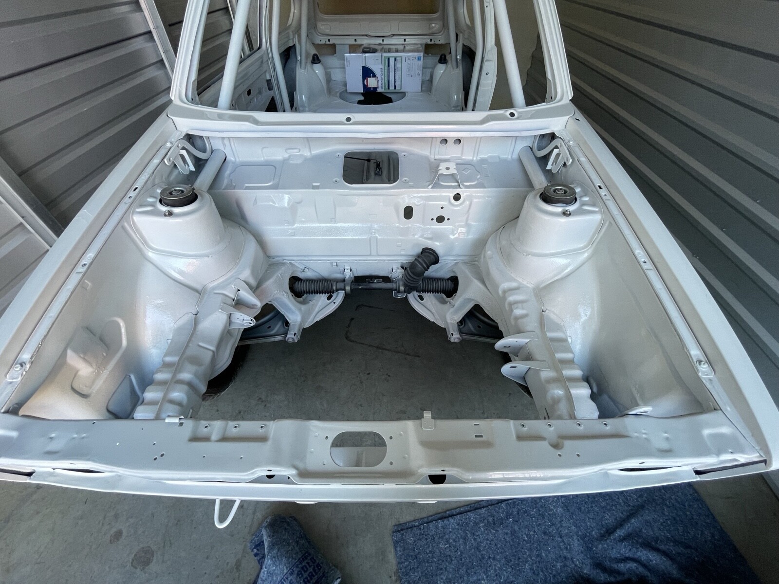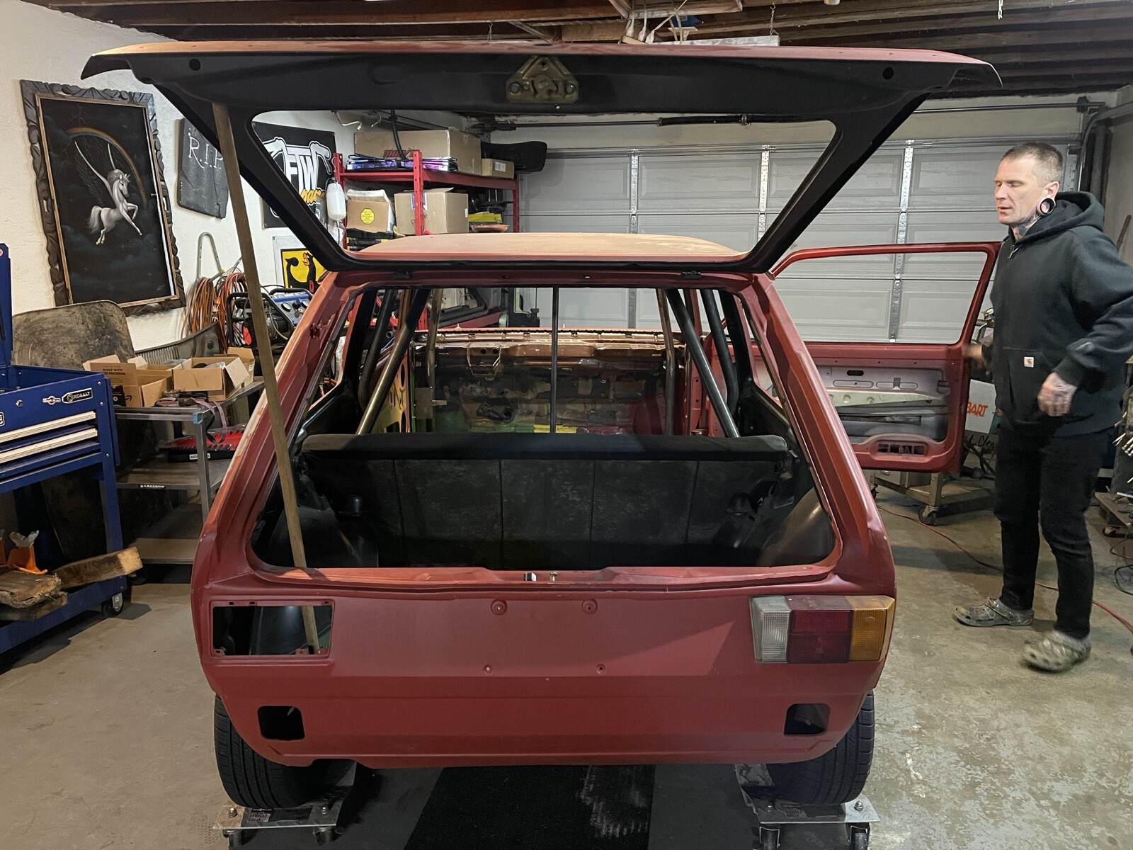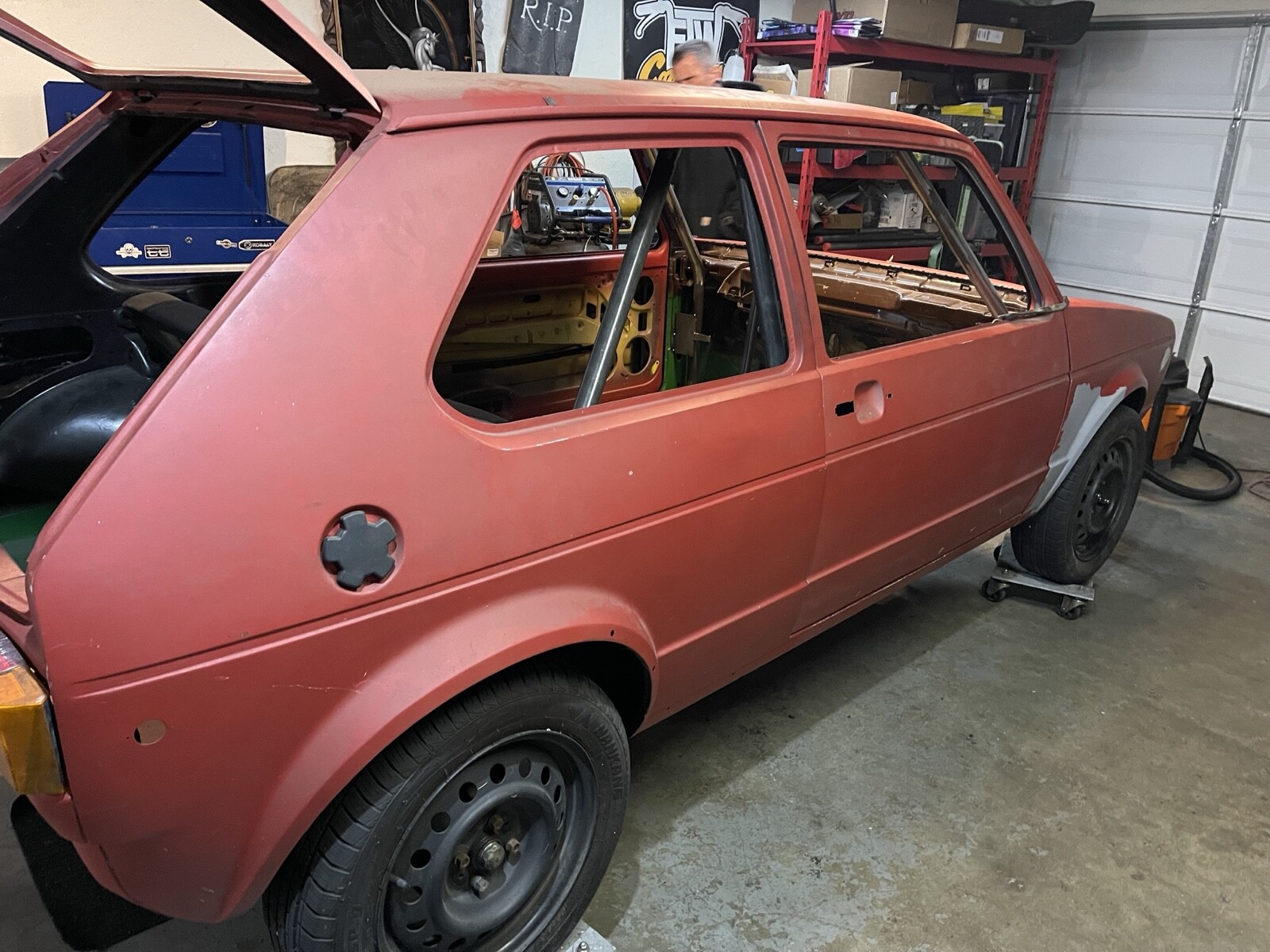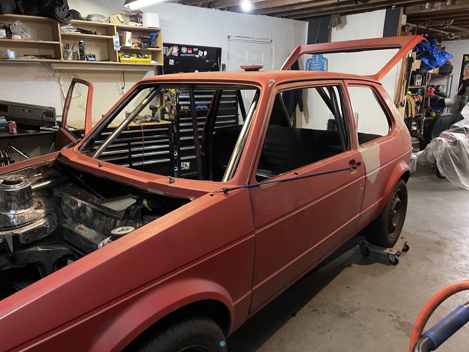 1979 Volkswagen Rabbit L shell/body repainted in Alpine White ($6,000.00 cost), front clip converted from square to round eye headlight configuration, Raised strut towers to allow for coilover suspension kit to fit, Rhodes Race Cars custom 12 point SCCA Chromoly drift racing roll cage modified for street use and easy interior access ($1,200.00 kit cost + $5,500 welding and metal fabrication labor).