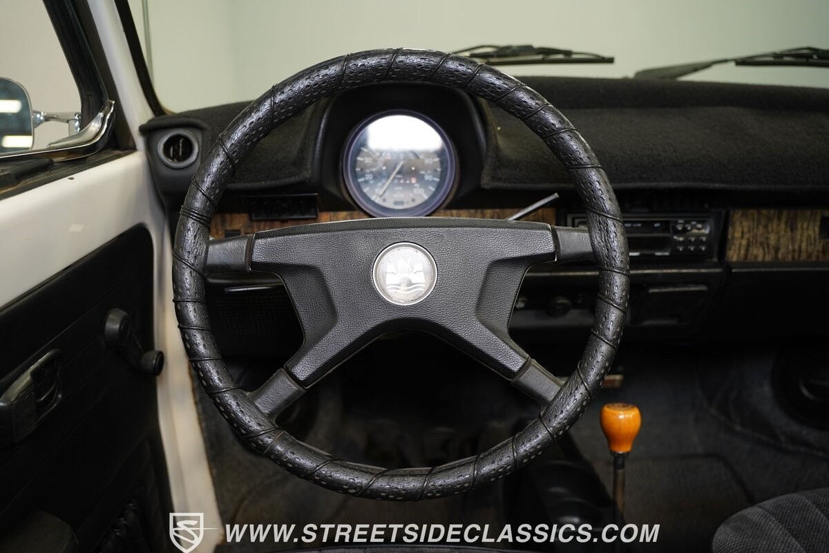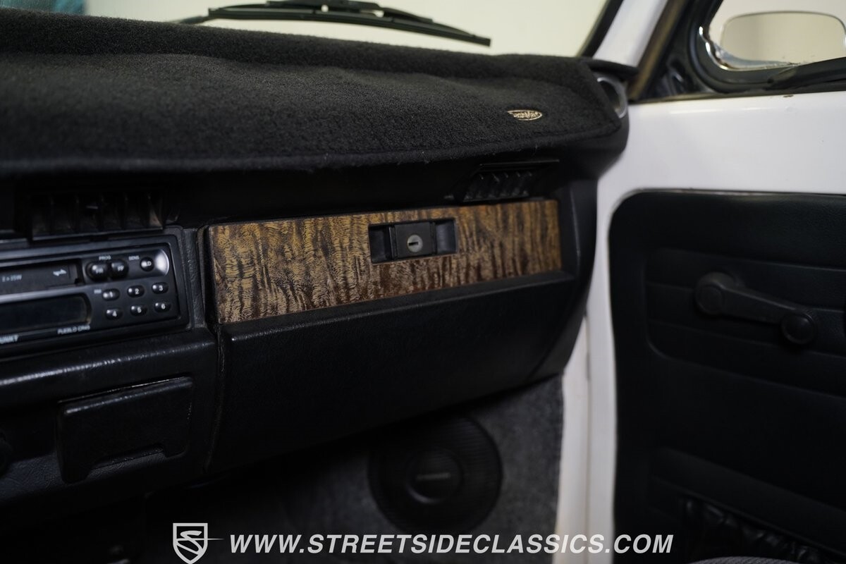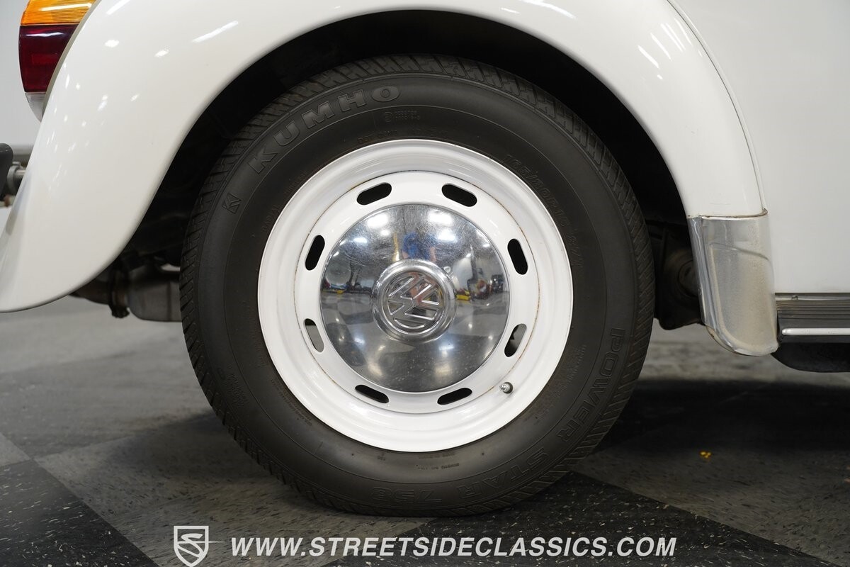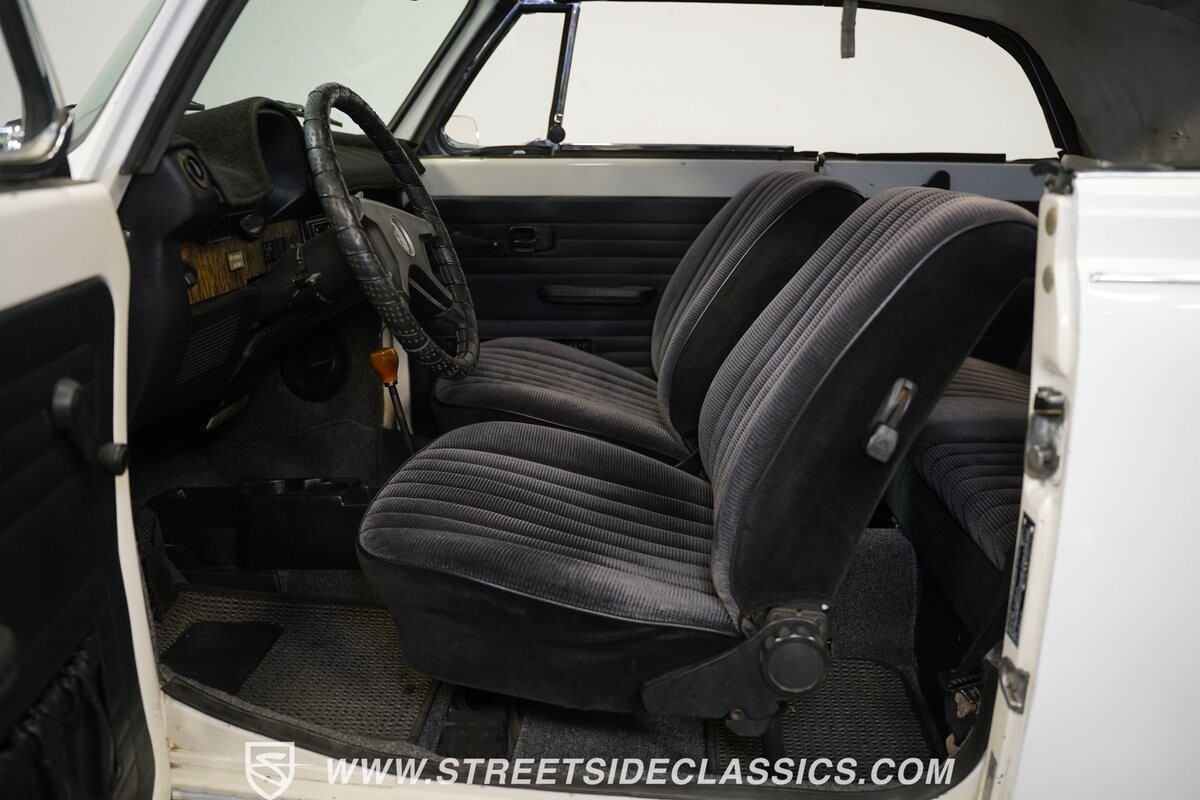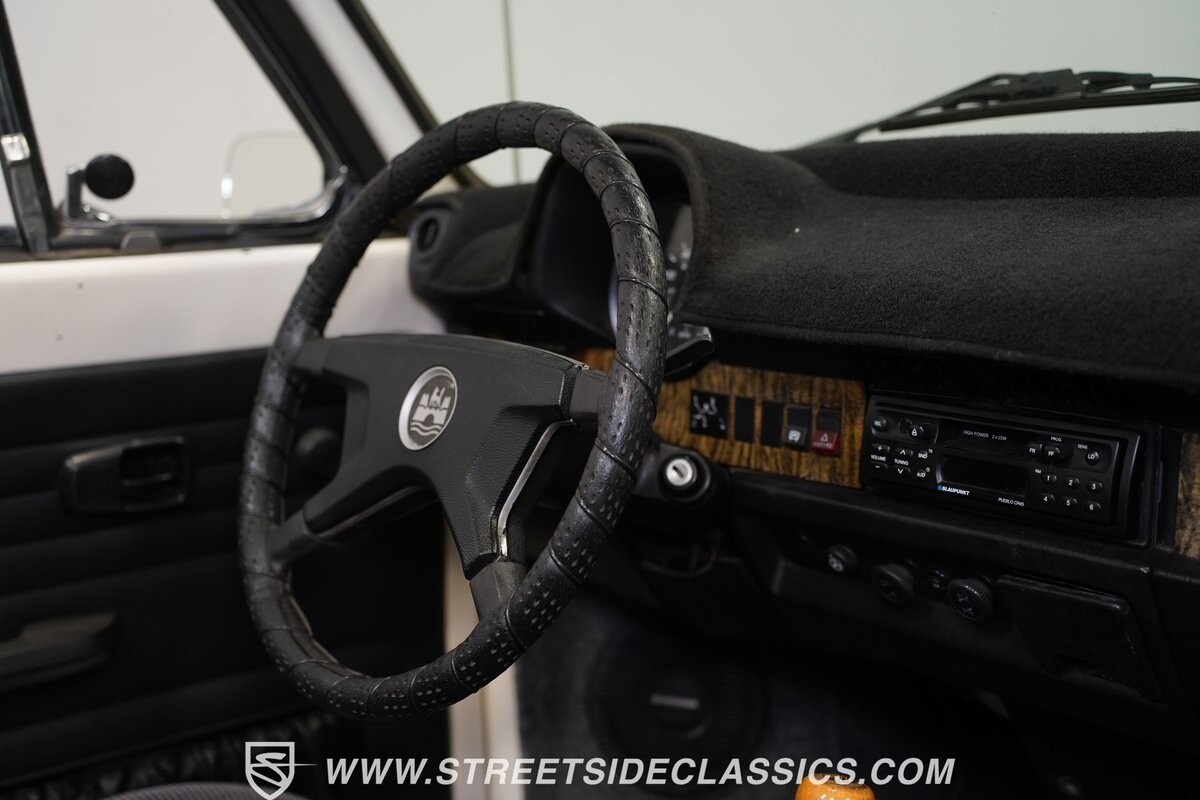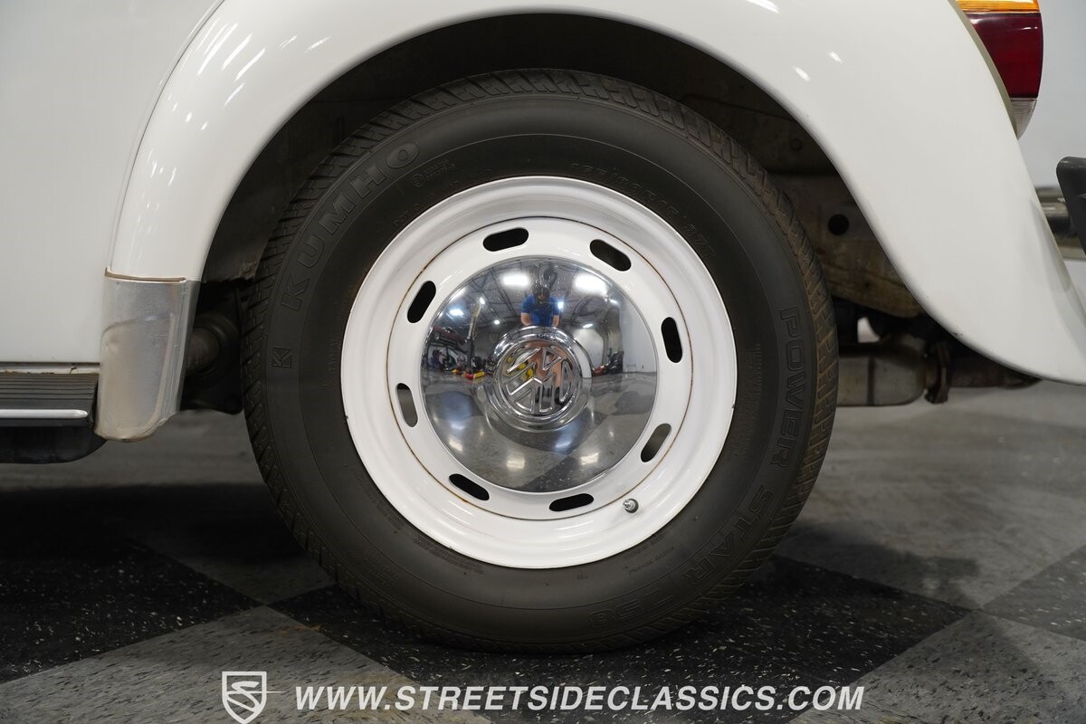In a world where conformity reigns supreme, this 1977 Volkswagen Super Beetle Convertible dares to break the mold. Draped in a coat of white that gleams like a pearl, this classic drop-top is ready to make every sunny day an adventure. The 15" steel wheels, adorned with chrome caps and wrapped in 165/80R15 Kumho Powerstar tires, add a touch of sophistication to the iconic Bug silhouette. And when the urge to feel the wind in your hair strikes, the white vinyl top folds down effortlessly, revealing a cabin that's as inviting as it is stylish.