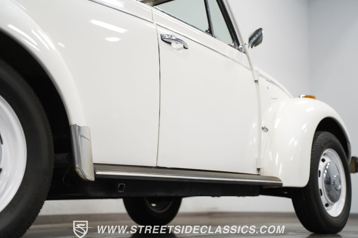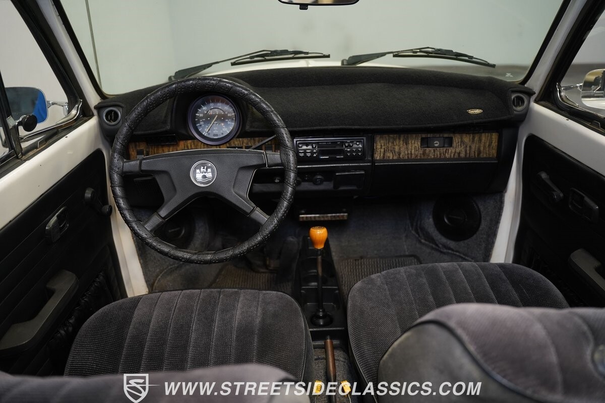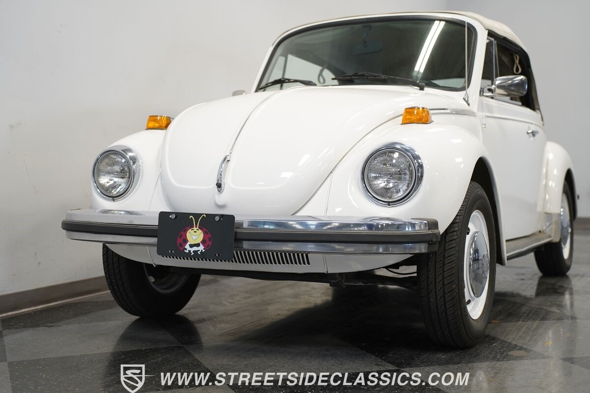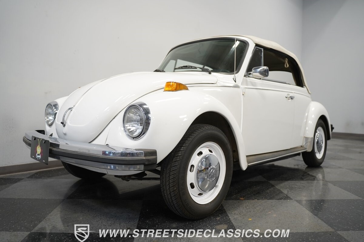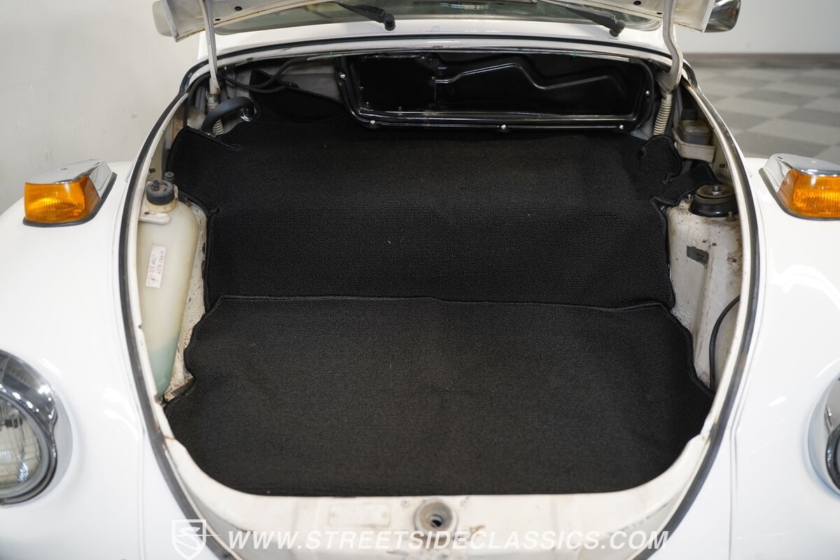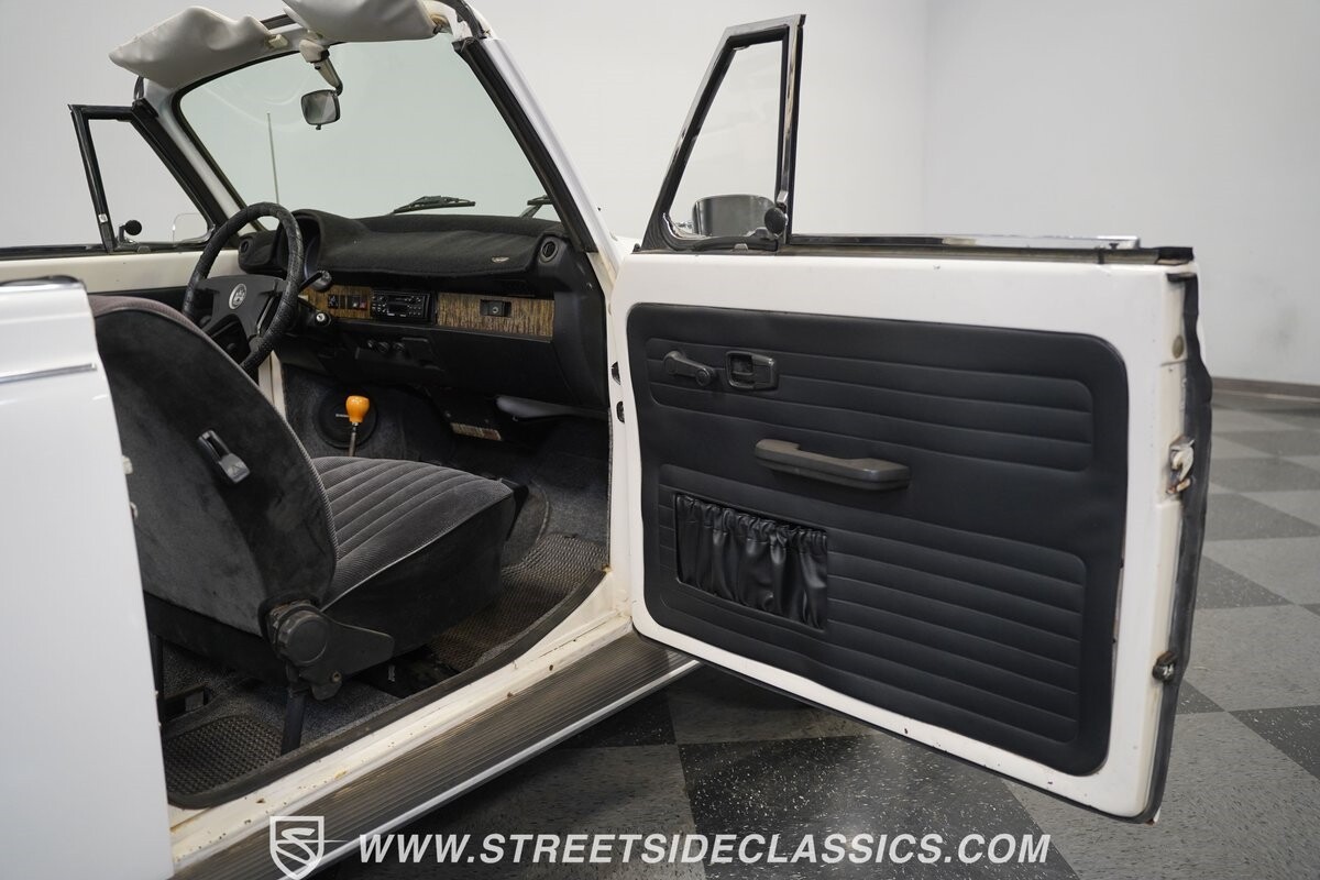 In a world where conformity reigns supreme, this 1977 Volkswagen Super Beetle Convertible dares to break the mold. Draped in a coat of white that gleams like a pearl, this classic drop-top is ready to make every sunny day an adventure. The 15" steel wheels, adorned with chrome caps and wrapped in 165/80R15 Kumho Powerstar tires, add a touch of sophistication to the iconic Bug silhouette. And when the urge to feel the wind in your hair strikes, the white vinyl top folds down effortlessly, revealing a cabin that's as inviting as it is stylish.