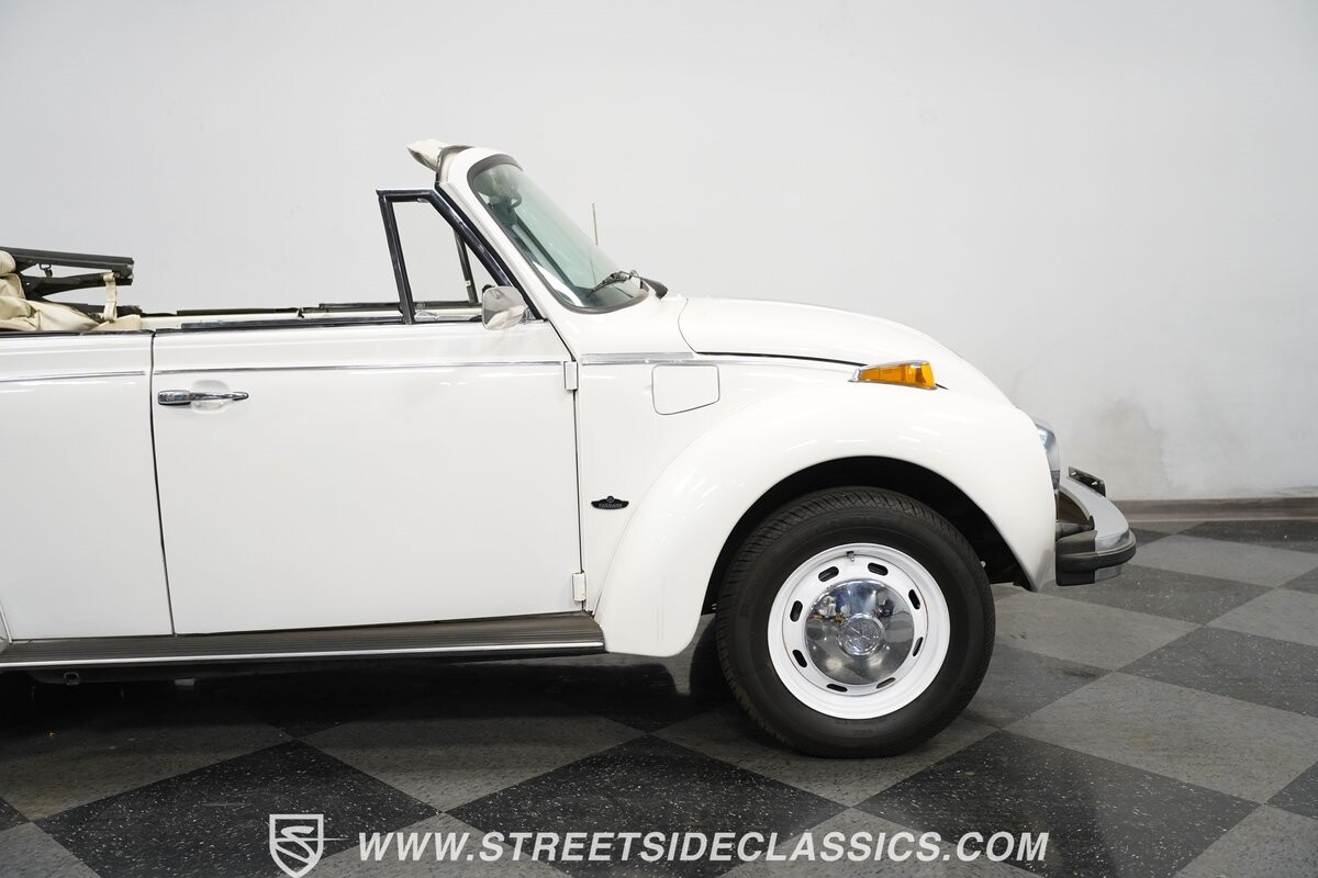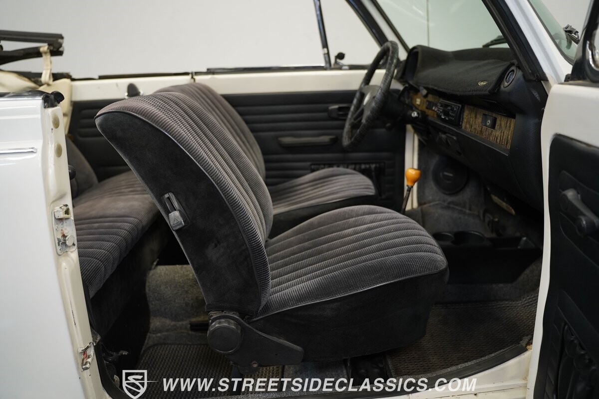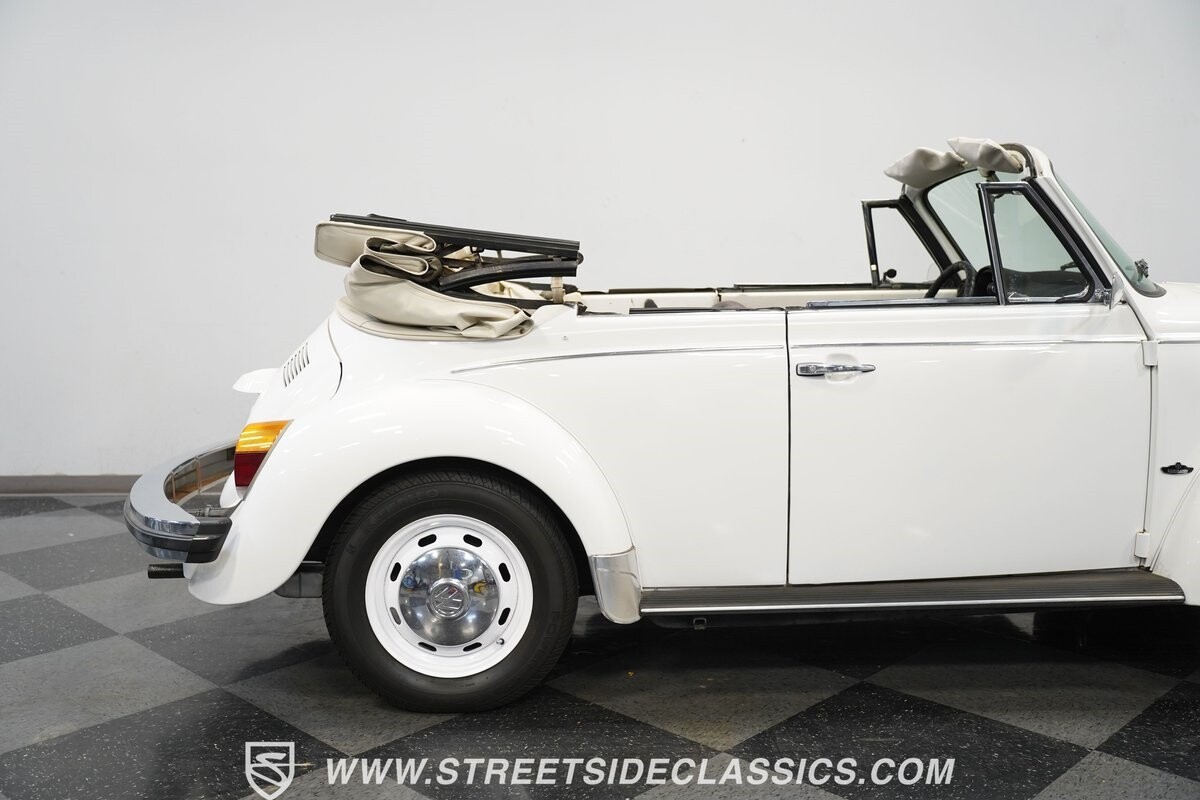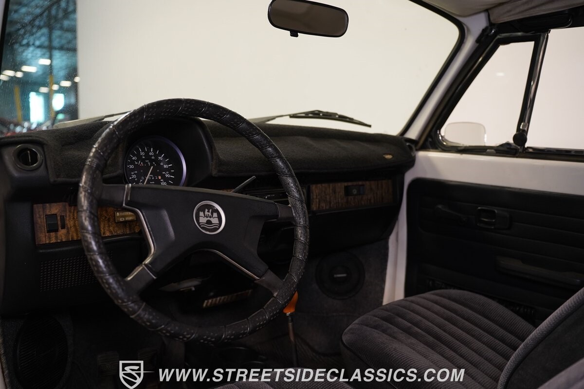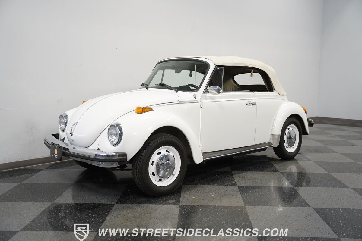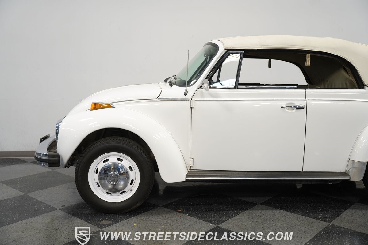 In a world where conformity reigns supreme, this 1977 Volkswagen Super Beetle Convertible dares to break the mold. Draped in a coat of white that gleams like a pearl, this classic drop-top is ready to make every sunny day an adventure. The 15" steel wheels, adorned with chrome caps and wrapped in 165/80R15 Kumho Powerstar tires, add a touch of sophistication to the iconic Bug silhouette. And when the urge to feel the wind in your hair strikes, the white vinyl top folds down effortlessly, revealing a cabin that's as inviting as it is stylish.