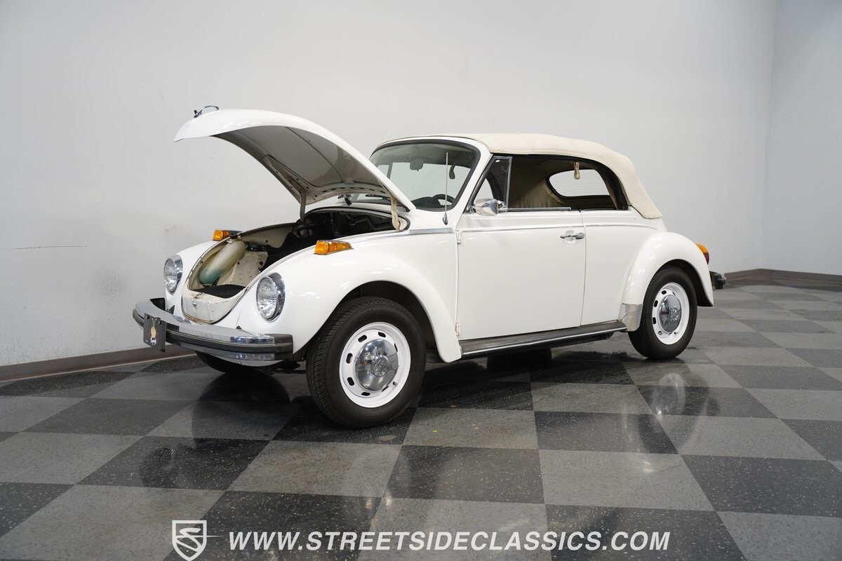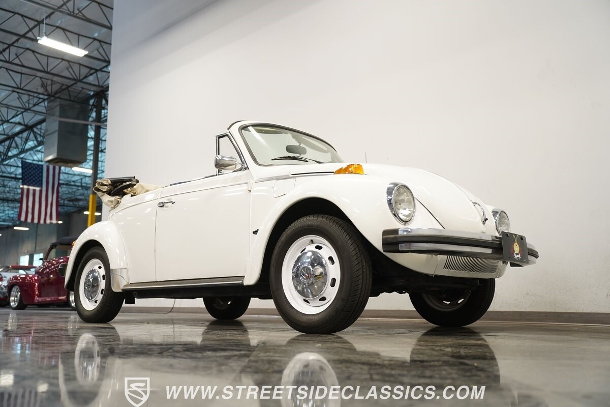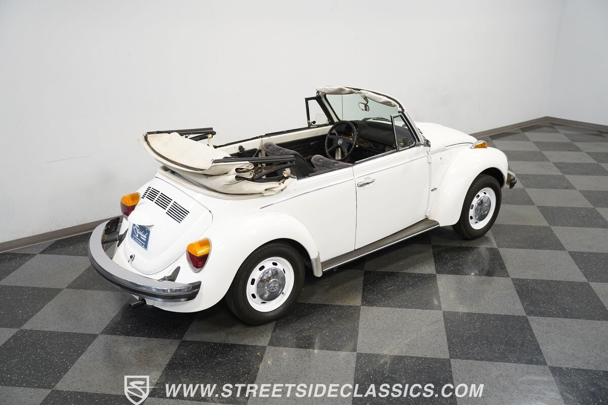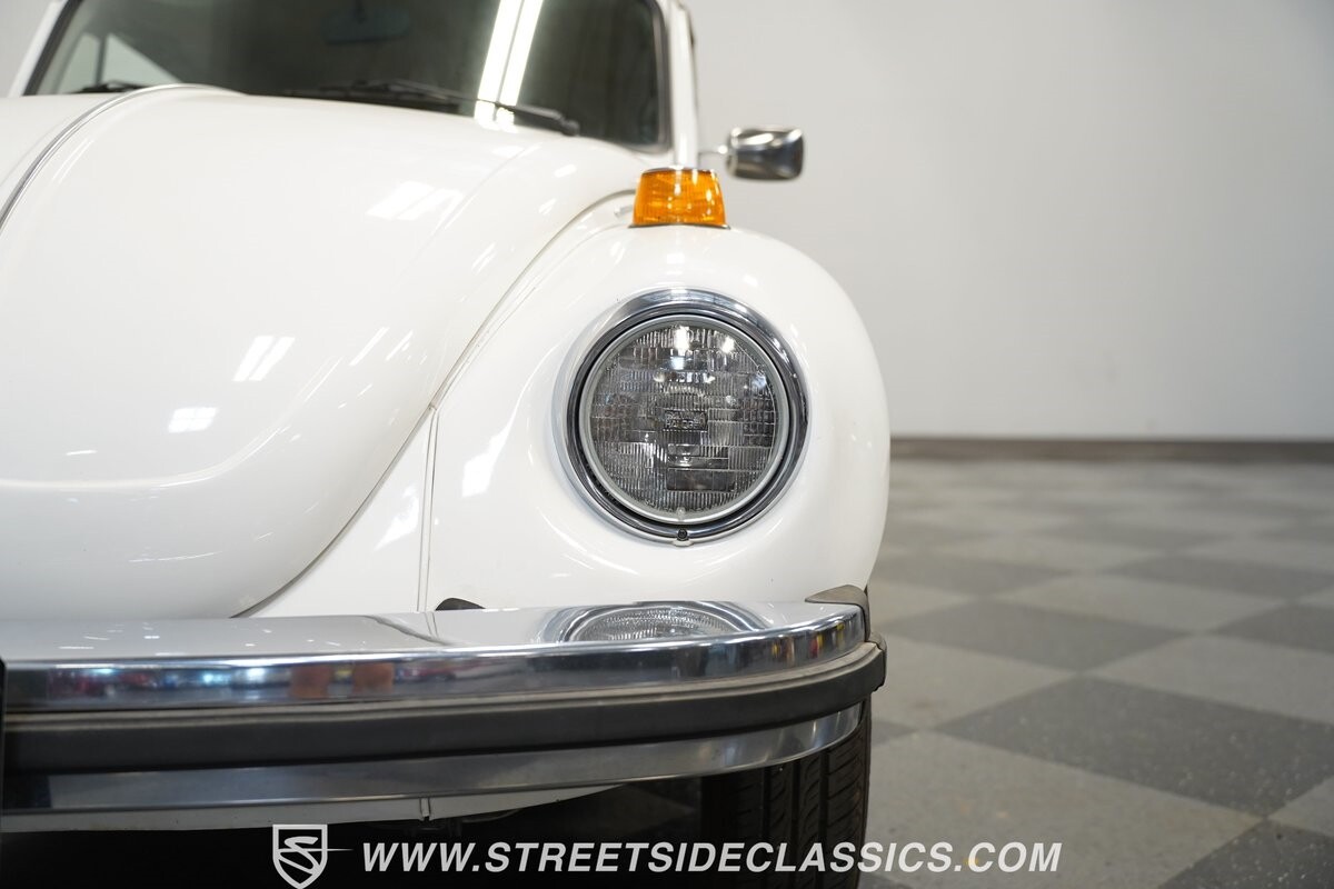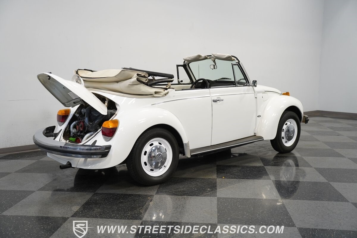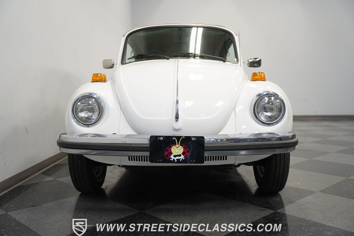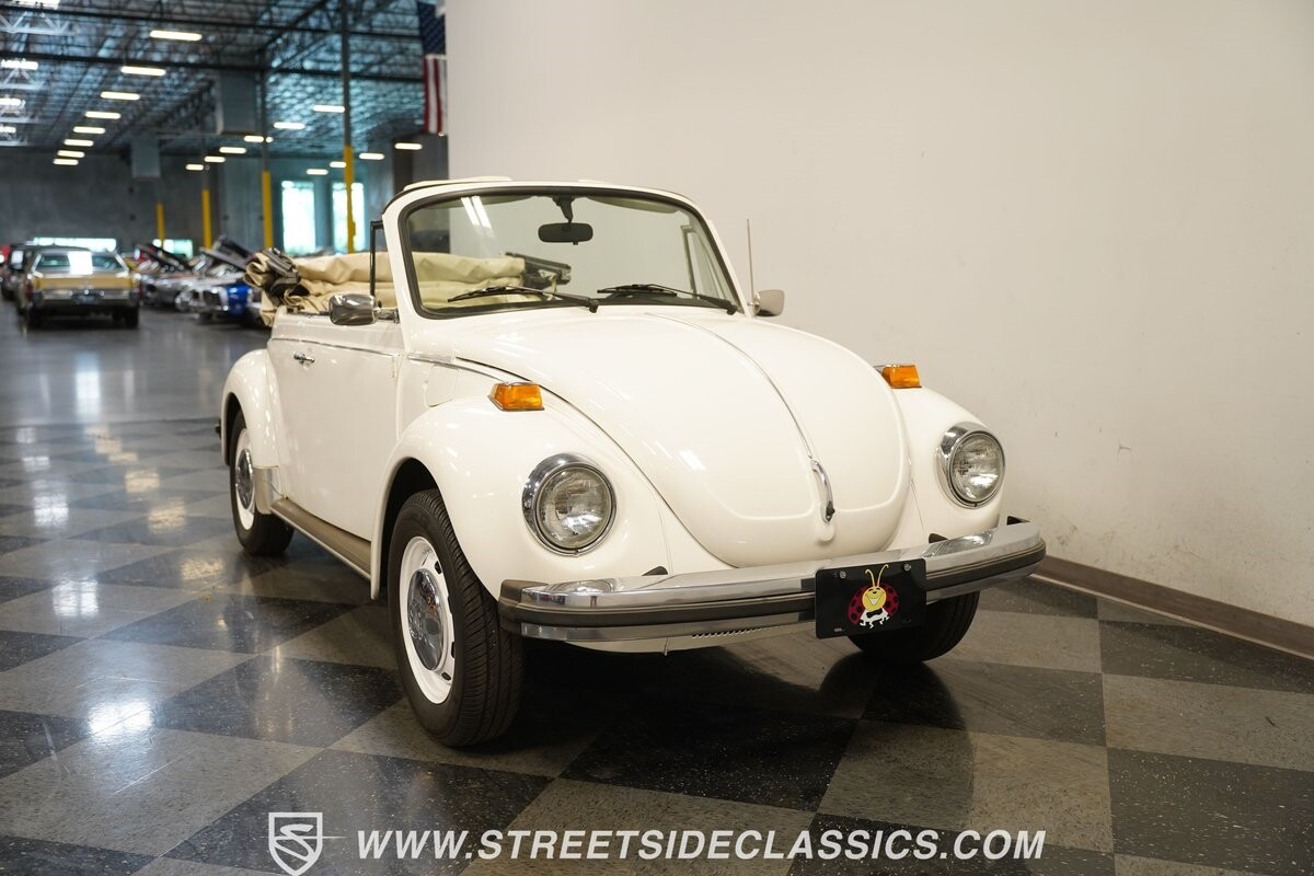 In a world where conformity reigns supreme, this 1977 Volkswagen Super Beetle Convertible dares to break the mold. Draped in a coat of white that gleams like a pearl, this classic drop-top is ready to make every sunny day an adventure. The 15" steel wheels, adorned with chrome caps and wrapped in 165/80R15 Kumho Powerstar tires, add a touch of sophistication to the iconic Bug silhouette. And when the urge to feel the wind in your hair strikes, the white vinyl top folds down effortlessly, revealing a cabin that's as inviting as it is stylish.
