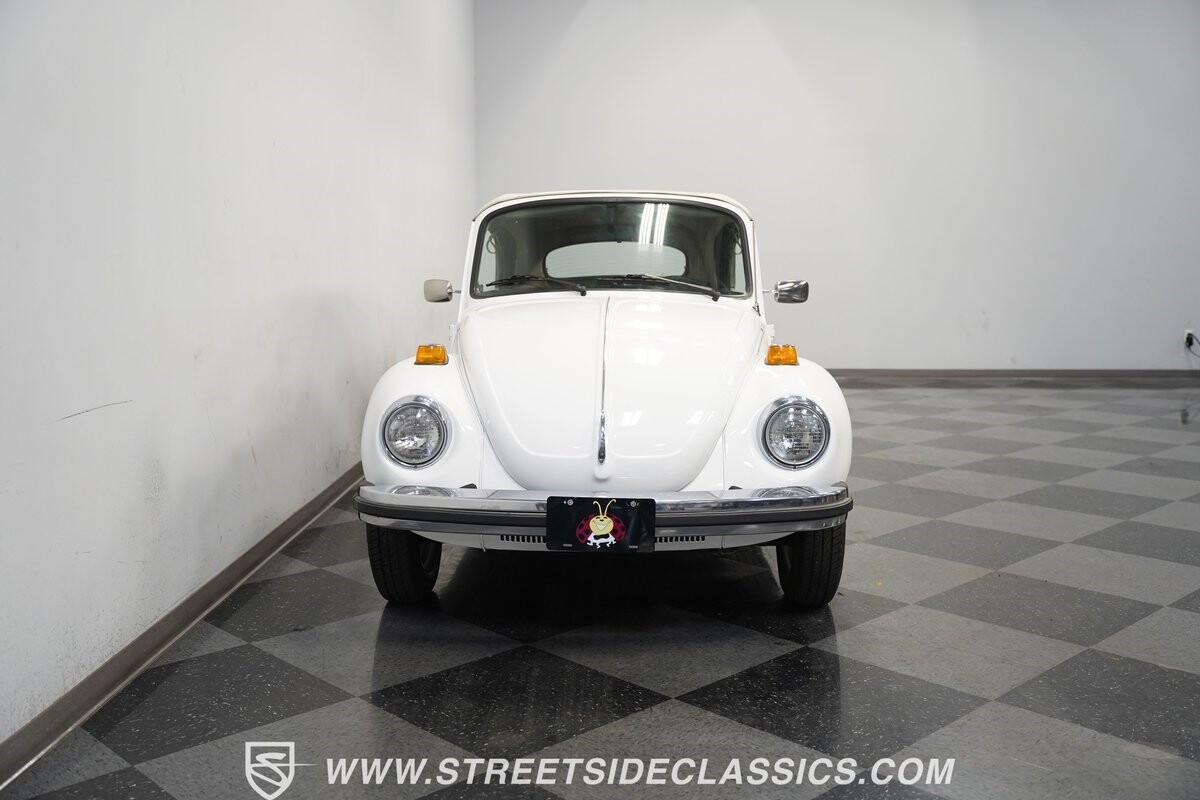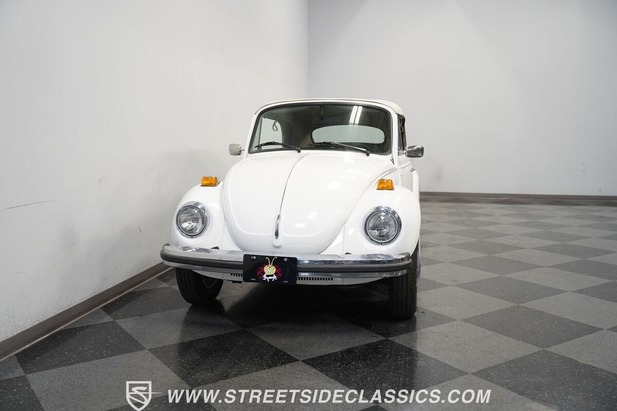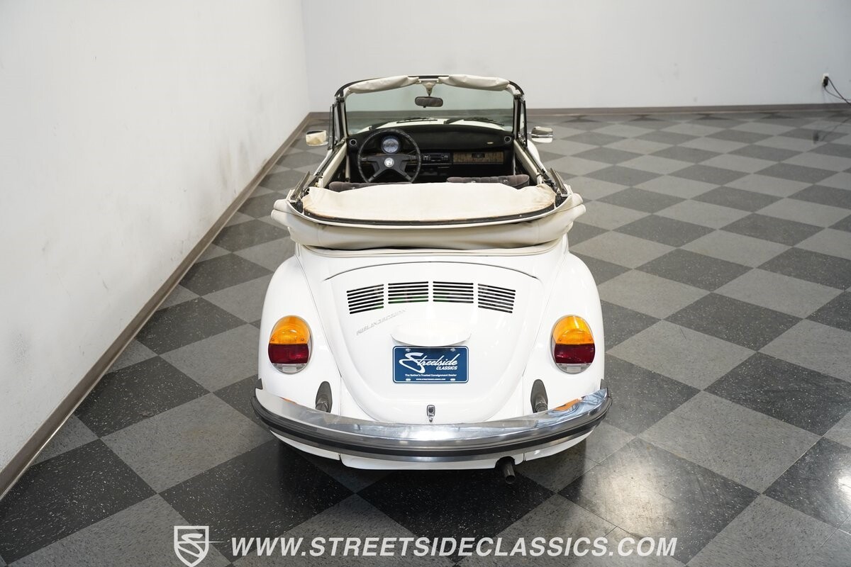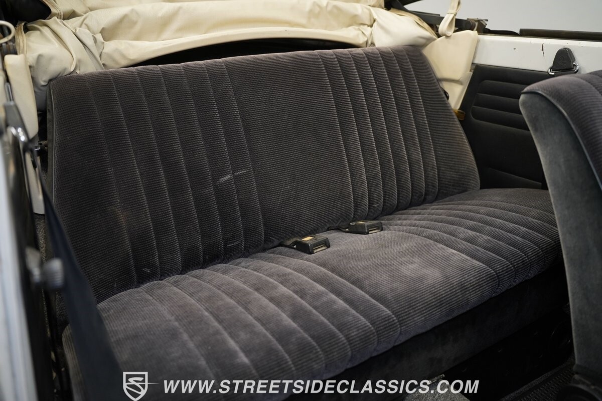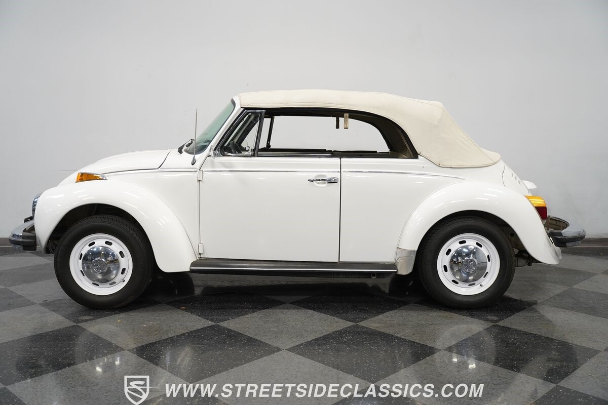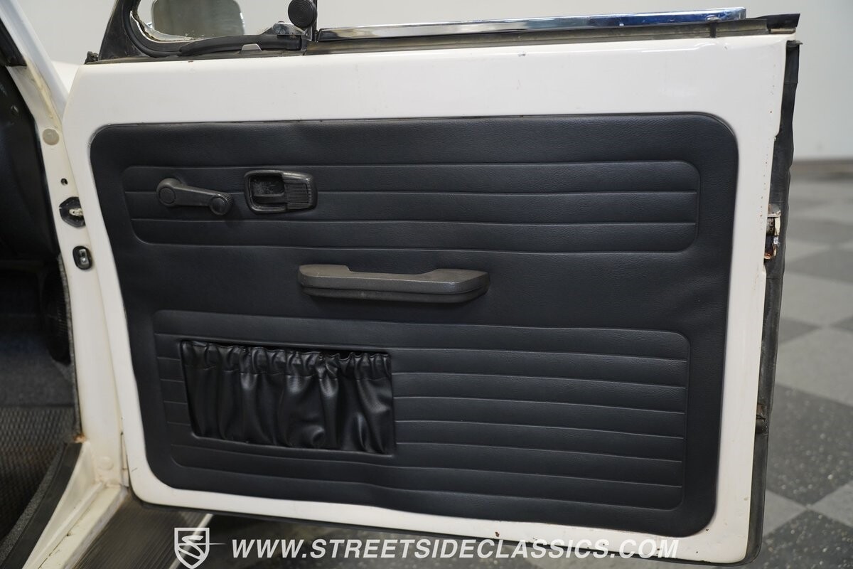 In a world where conformity reigns supreme, this 1977 Volkswagen Super Beetle Convertible dares to break the mold. Draped in a coat of white that gleams like a pearl, this classic drop-top is ready to make every sunny day an adventure. The 15" steel wheels, adorned with chrome caps and wrapped in 165/80R15 Kumho Powerstar tires, add a touch of sophistication to the iconic Bug silhouette. And when the urge to feel the wind in your hair strikes, the white vinyl top folds down effortlessly, revealing a cabin that's as inviting as it is stylish.