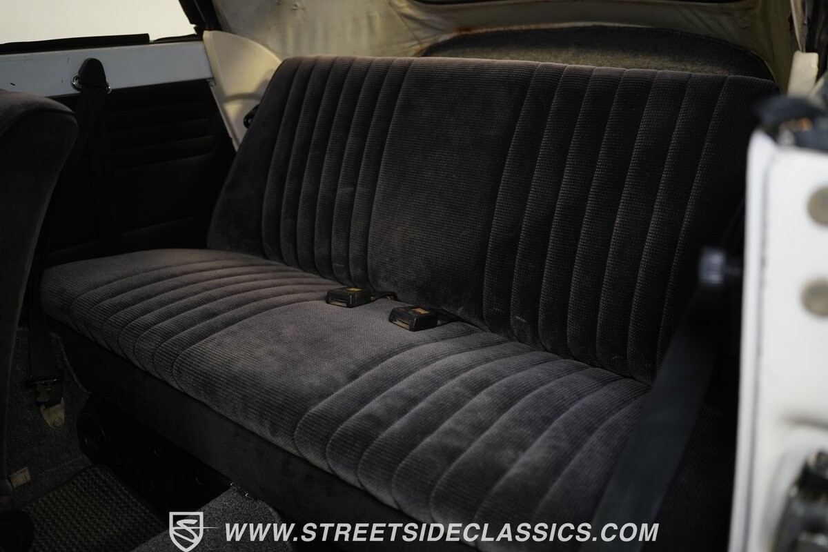 Slip into the gray velour bucket seats, and you'll find yourself enveloped in a world of comfort. The cloth upholstery, a rare treat in a '77 Beetle, ensures that even on the hottest days, you'll stay cool and collected. The rear bench, also wrapped in matching velour, offers ample space for friends to join in on the fun. The door panels, with their simple yet elegant design, add to the car's overall charm. The dash with dash mat keeps things looking tidy with the factory gauges, still ticking away like a well-oiled machine, are complemented by a Blaupunkt AM/FM cassette player, ready to provide the perfect soundtrack to your journeys.