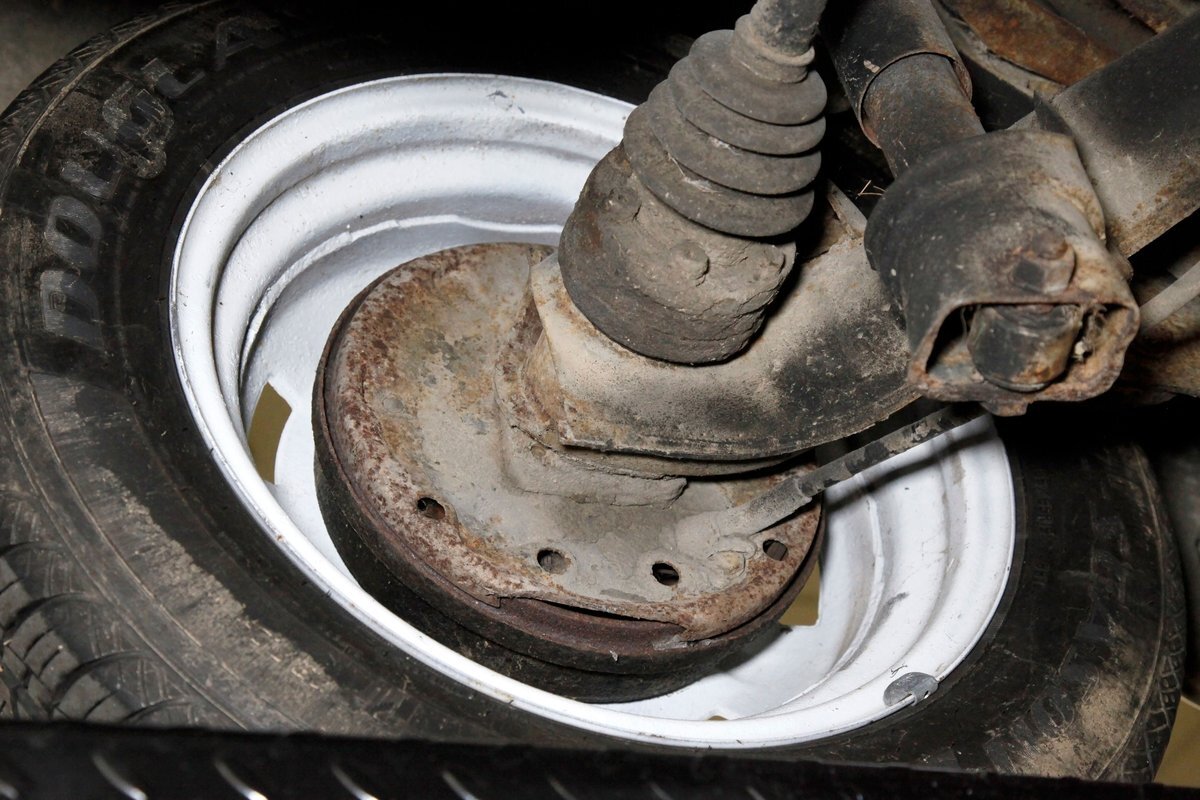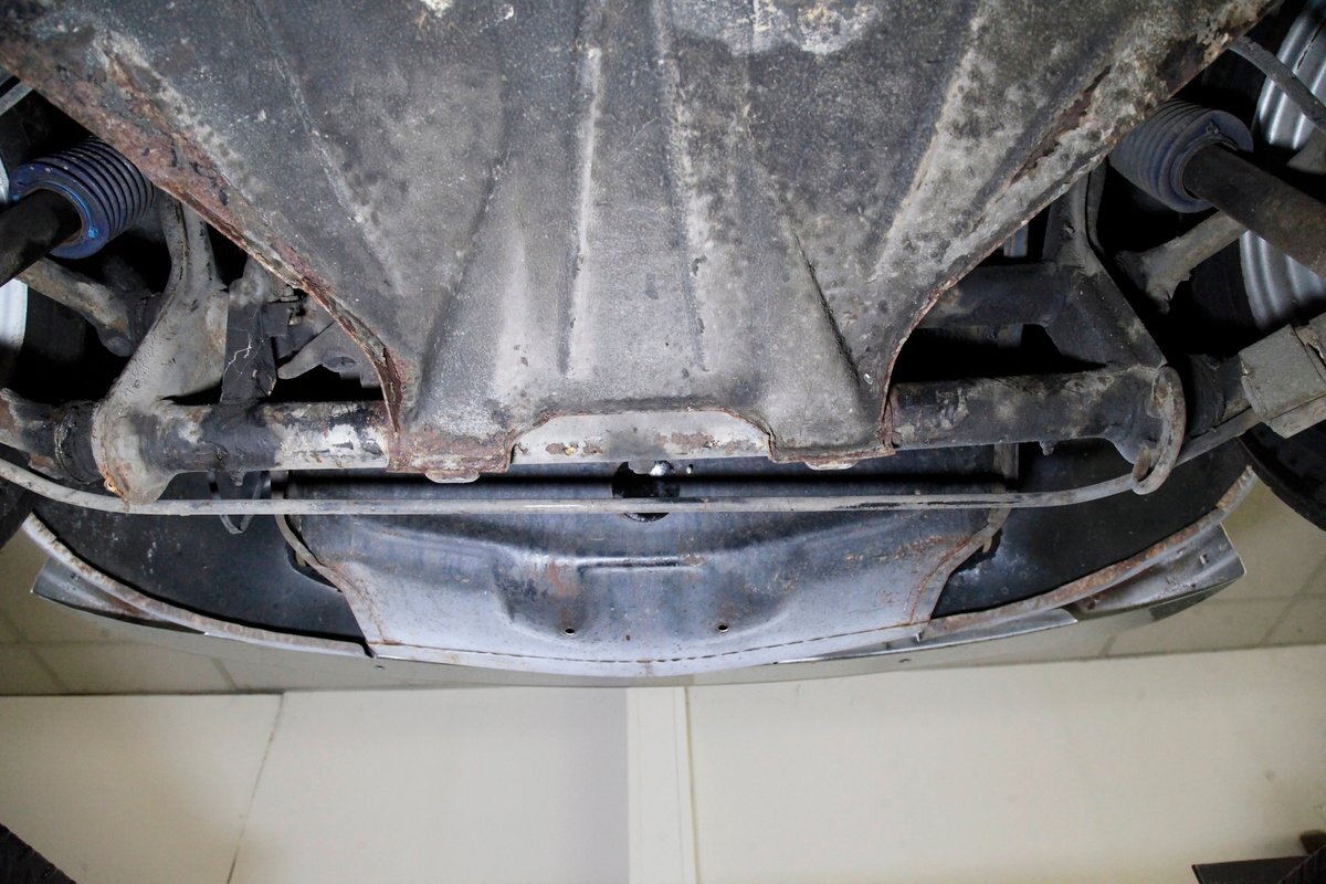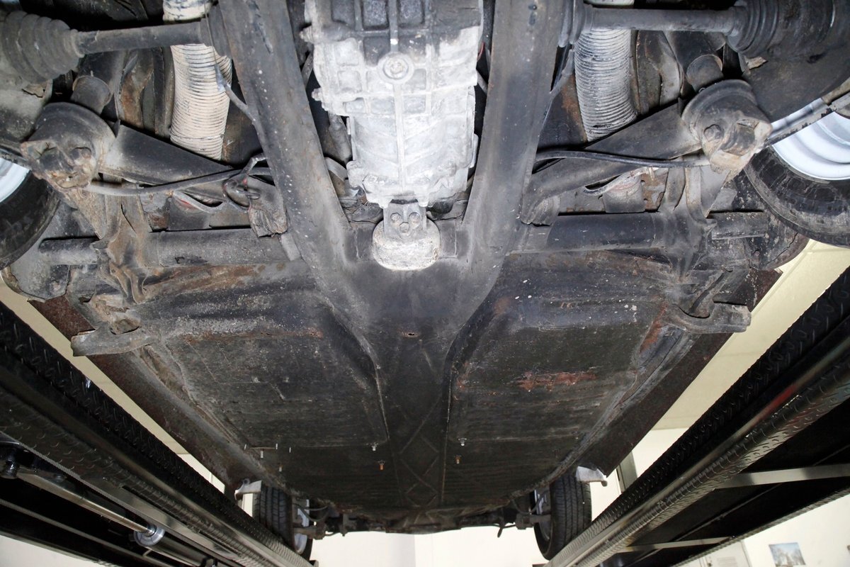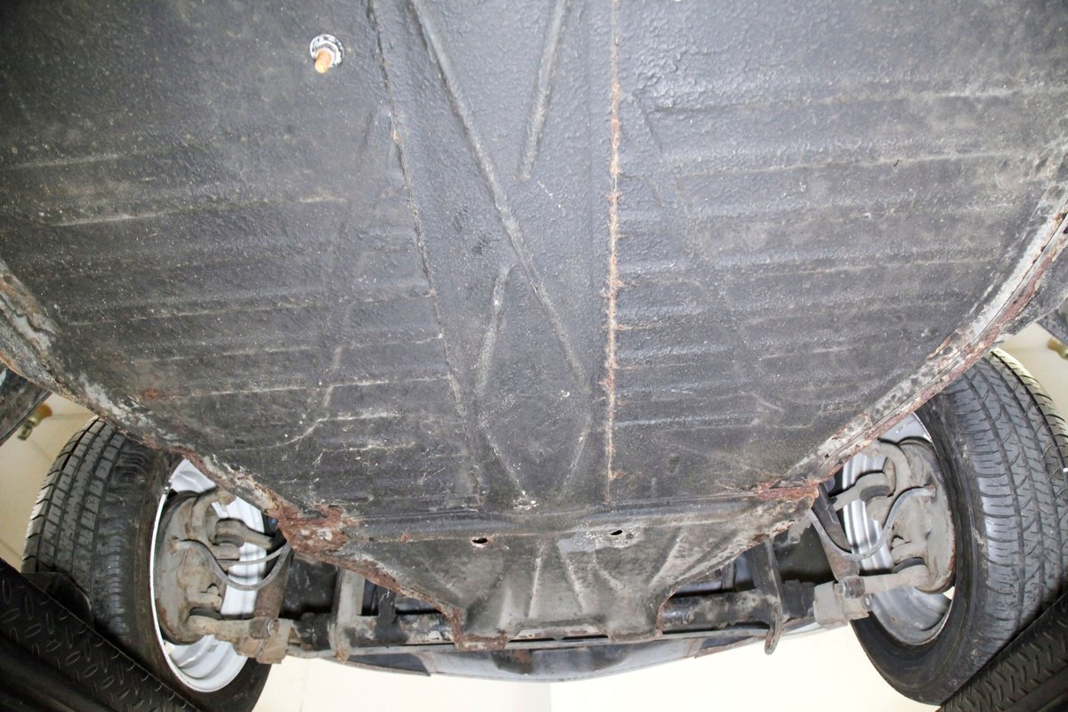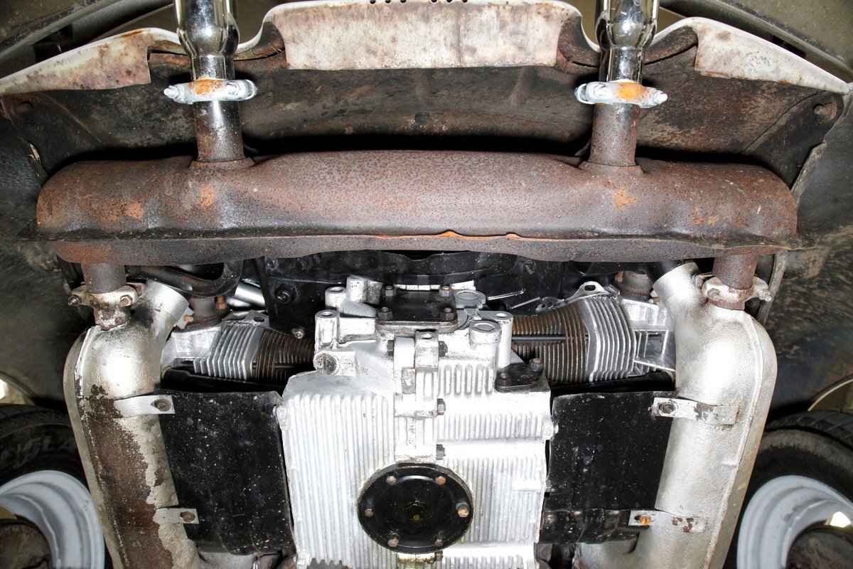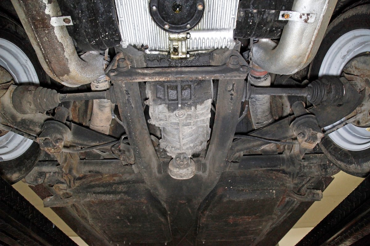 The front and rear suspension are independent. Drum brakes are all around and have new pads and lines. Scanning the underside the viewer can see a light dusting of some surface rust and patina with some light corrosion on aluminum parts scattered about. The floor pans are painted black, and are stamped steel and the consignor states a new steering system has been installed.