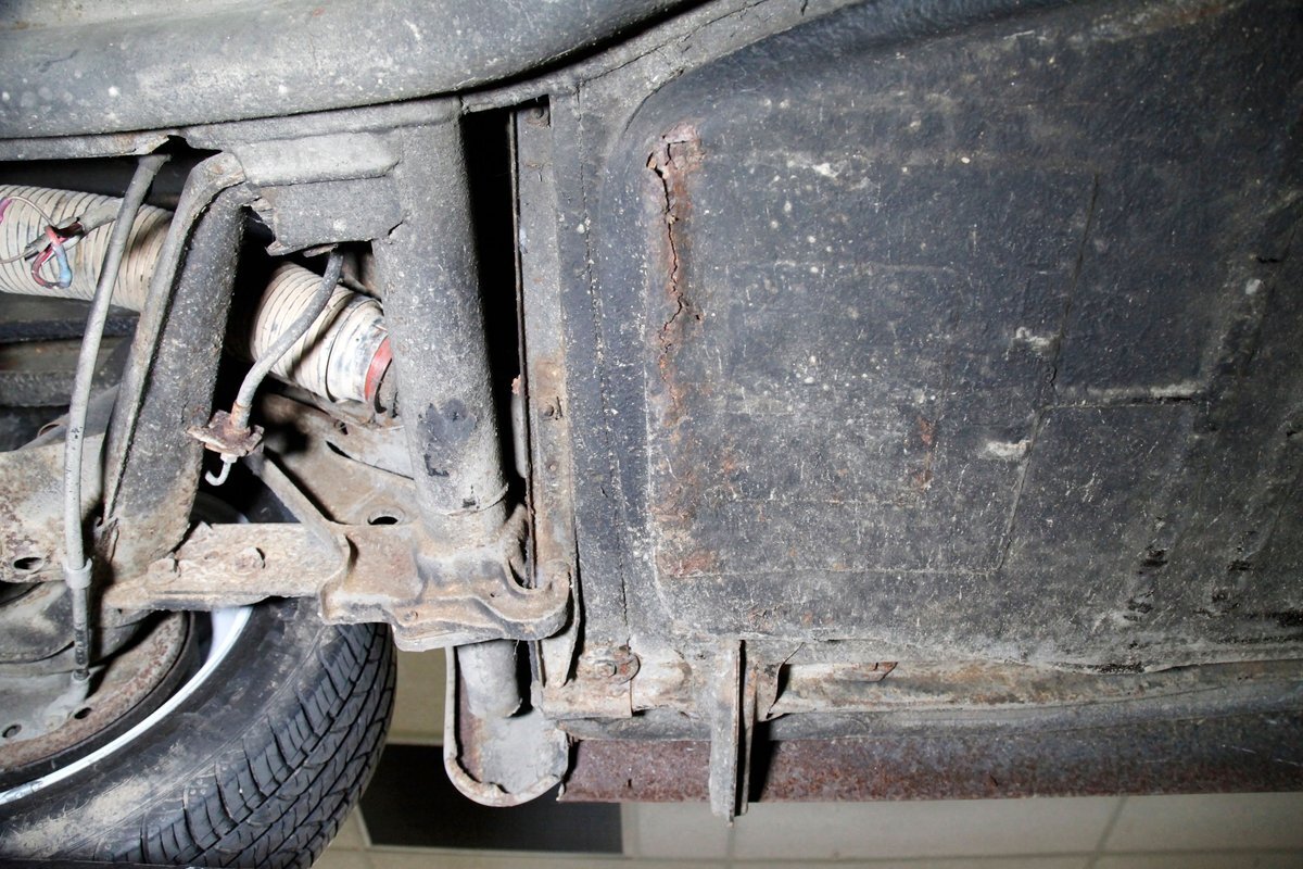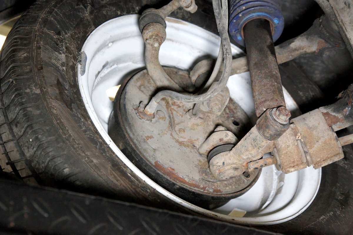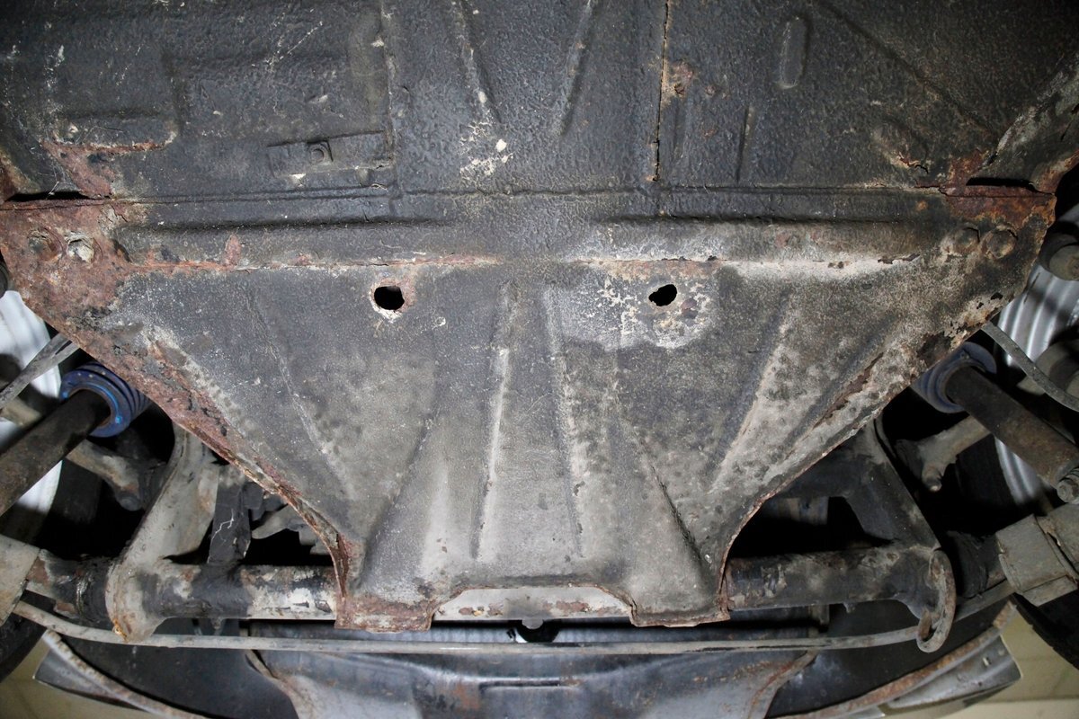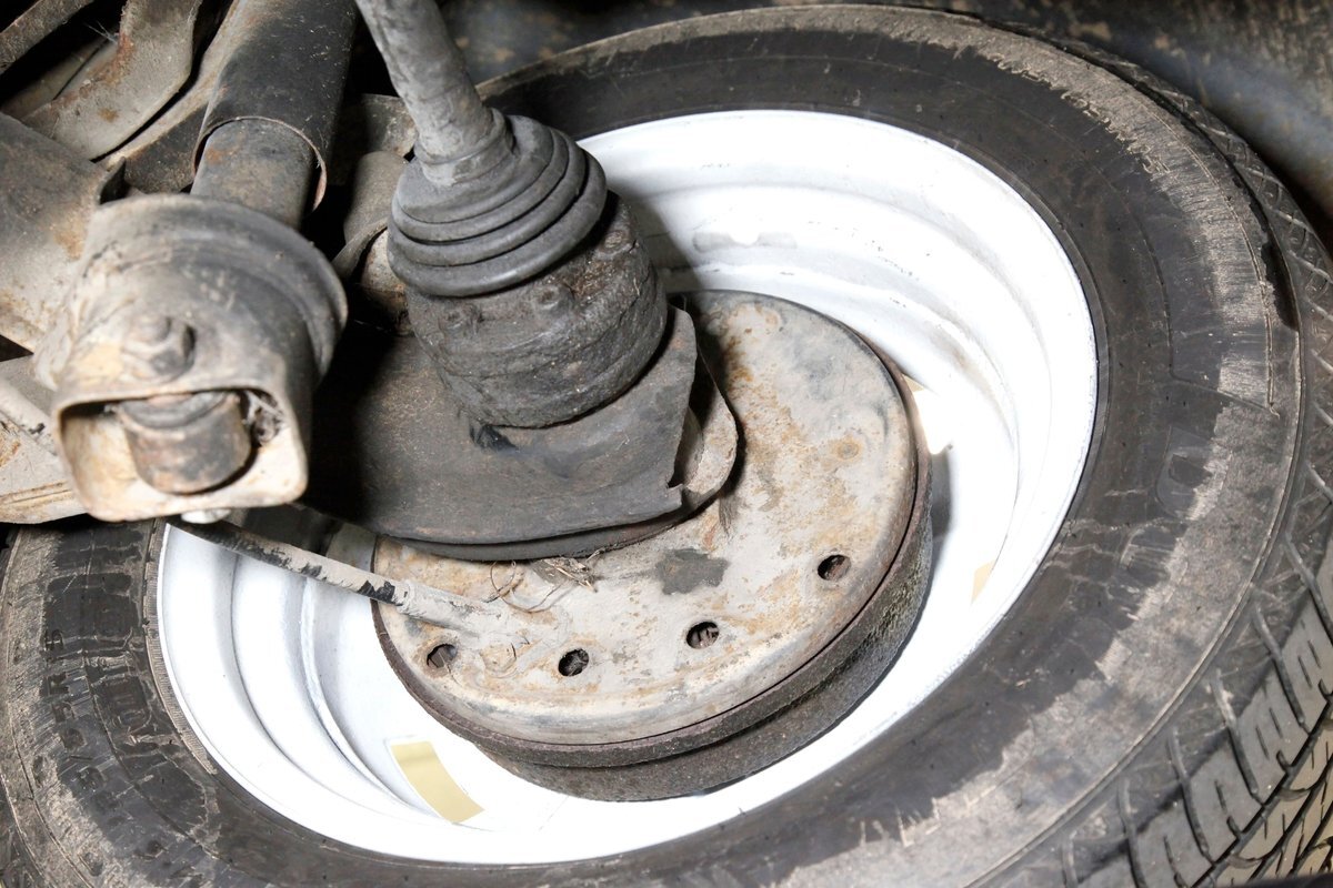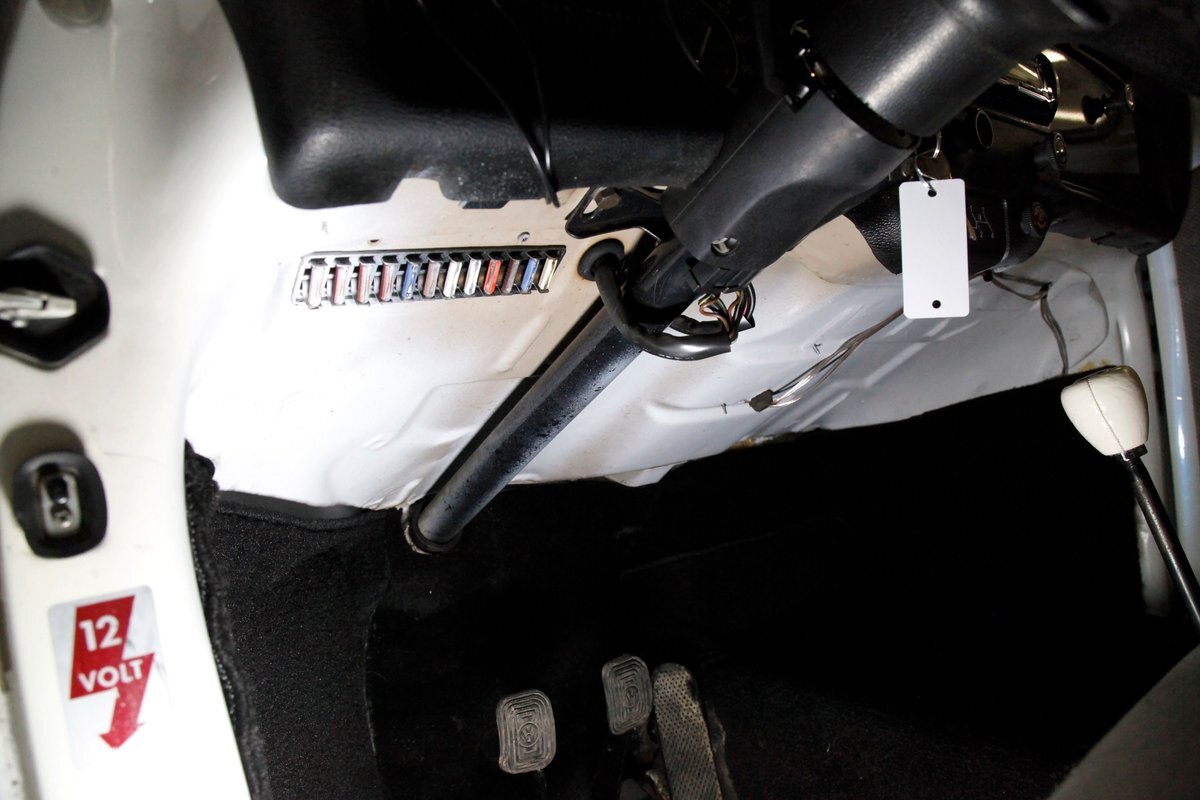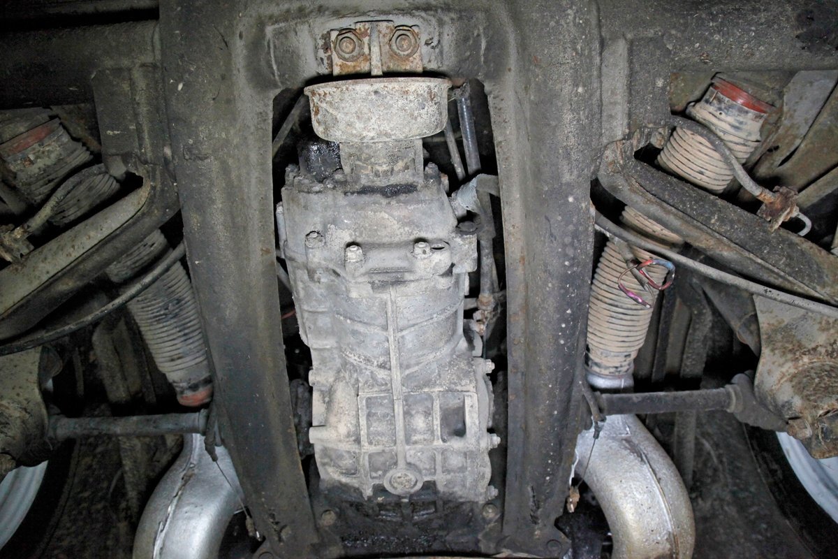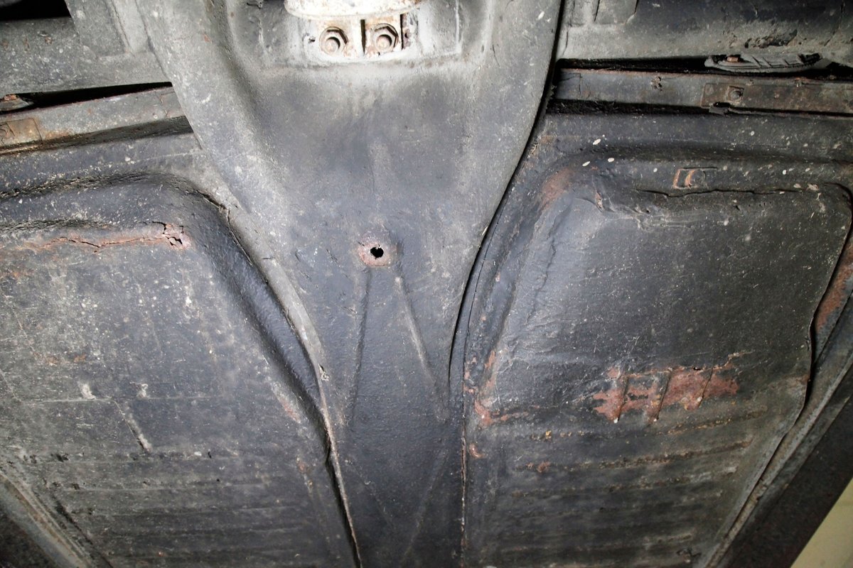 The front and rear suspension are independent. Drum brakes are all around and have new pads and lines. Scanning the underside the viewer can see a light dusting of some surface rust and patina with some light corrosion on aluminum parts scattered about. The floor pans are painted black, and are stamped steel and the consignor states a new steering system has been installed.