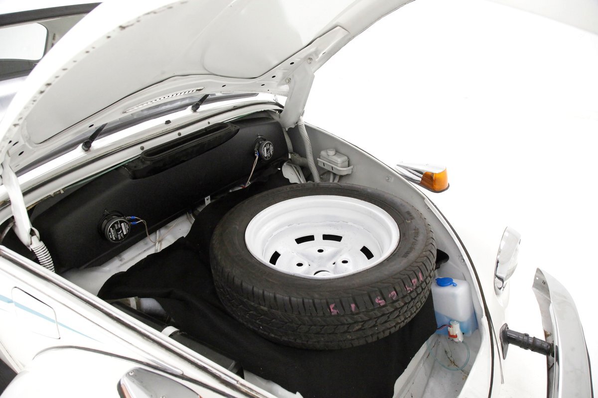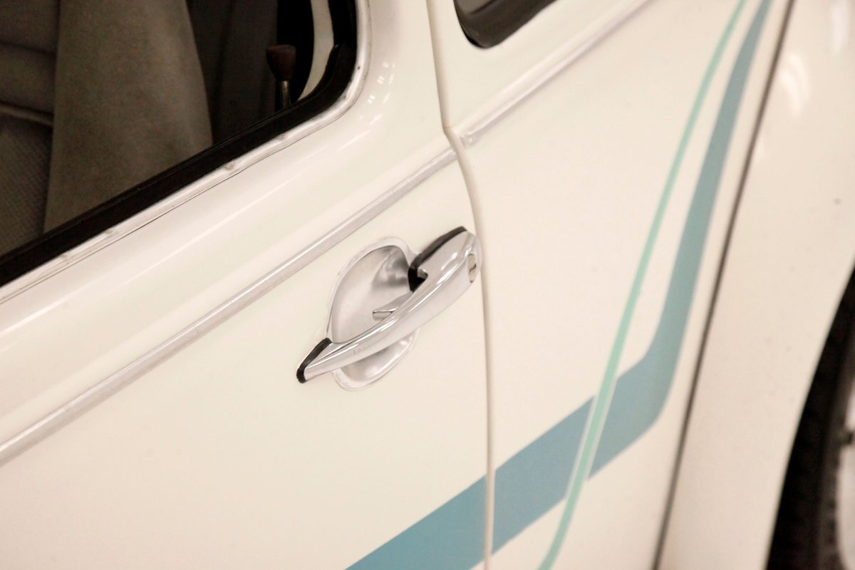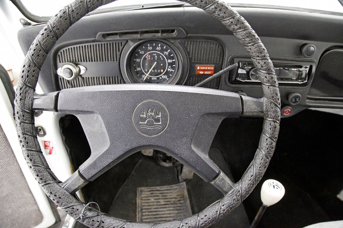 An expertly applied respray of white adorns all the rounded surfaces of this bug. From the hood to the English wheel-esque shaped fenders front and rear, to the rounded roofline and gently sloping rounded rear, which are all presenting in good condition. Gaps are well minded and just like the advertisements did, you could submerge this car in water and remain safe inside! (although we did not submerge it in our local lake Lackanookie due to cold water conditions). Running boards connect the fenders, which show 1974 turn signals attached to the front fenders and thin elephant print brake/backup/turn signal cluster lights attached to the back. The headlights have shiny bezels, making the car seem like it is looking at you. All badging, window surrounds and glass are in good condition. Standard 4 pointed star center steel wheels in white are wrapped in black wall 185/65R15 rubber all around. I need to mention the spiffy retro graphic dual overlapping check marks if you will, adding some interest to the sides of the car painted on in turquoise.