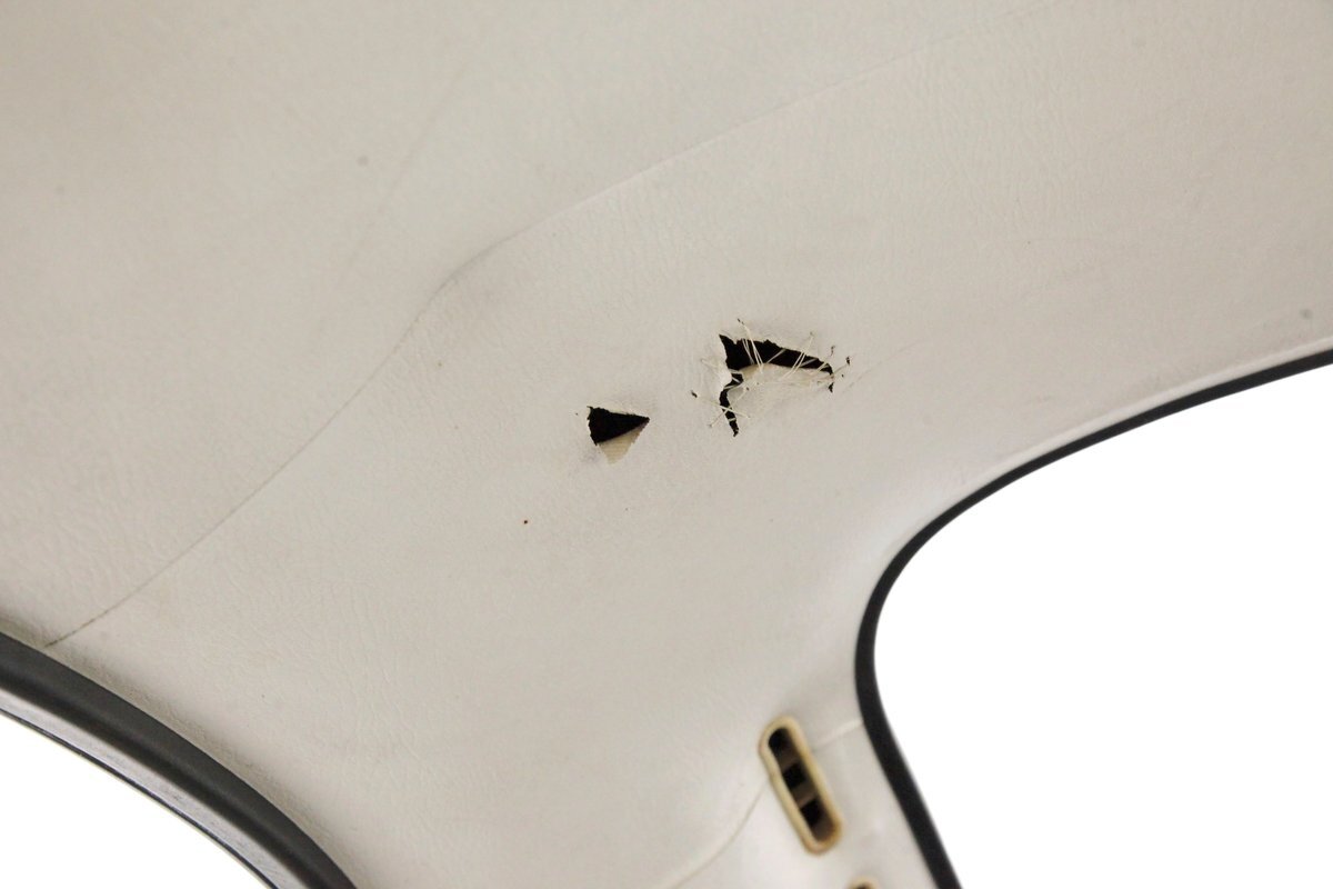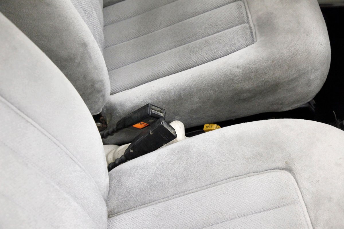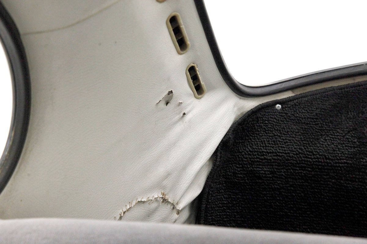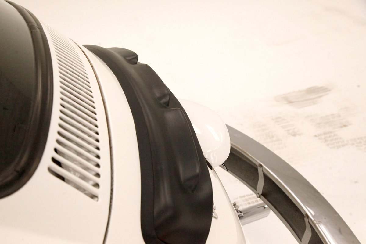 An expertly applied respray of white adorns all the rounded surfaces of this bug. From the hood to the English wheel-esque shaped fenders front and rear, to the rounded roofline and gently sloping rounded rear, which are all presenting in good condition. Gaps are well minded and just like the advertisements did, you could submerge this car in water and remain safe inside! (although we did not submerge it in our local lake Lackanookie due to cold water conditions). Running boards connect the fenders, which show 1974 turn signals attached to the front fenders and thin elephant print brake/backup/turn signal cluster lights attached to the back. The headlights have shiny bezels, making the car seem like it is looking at you. All badging, window surrounds and glass are in good condition. Standard 4 pointed star center steel wheels in white are wrapped in black wall 185/65R15 rubber all around. I need to mention the spiffy retro graphic dual overlapping check marks if you will, adding some interest to the sides of the car painted on in turquoise.