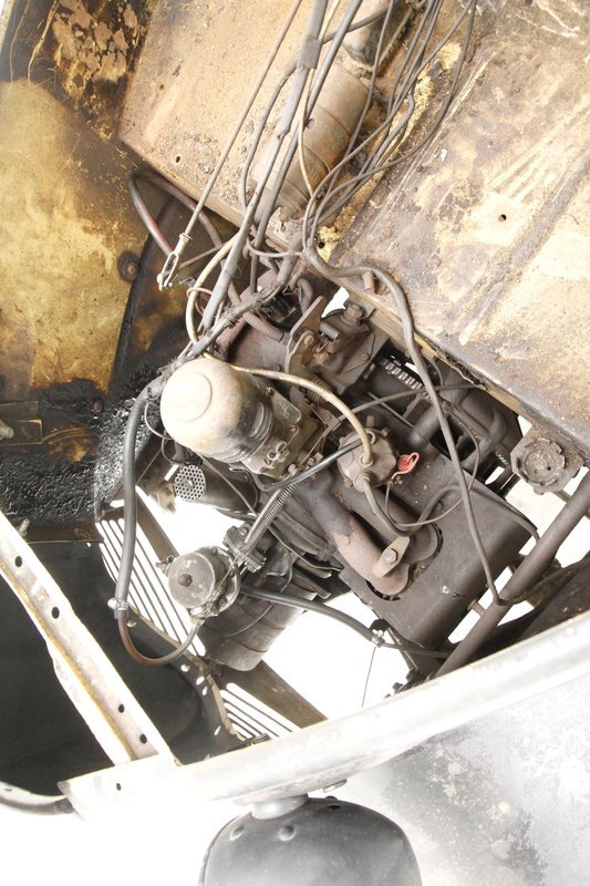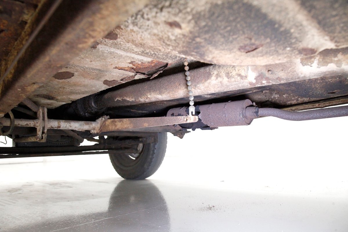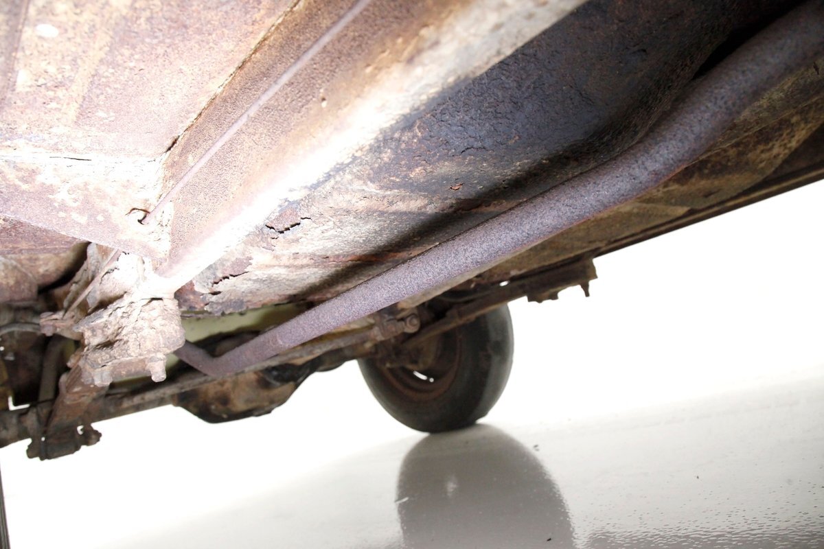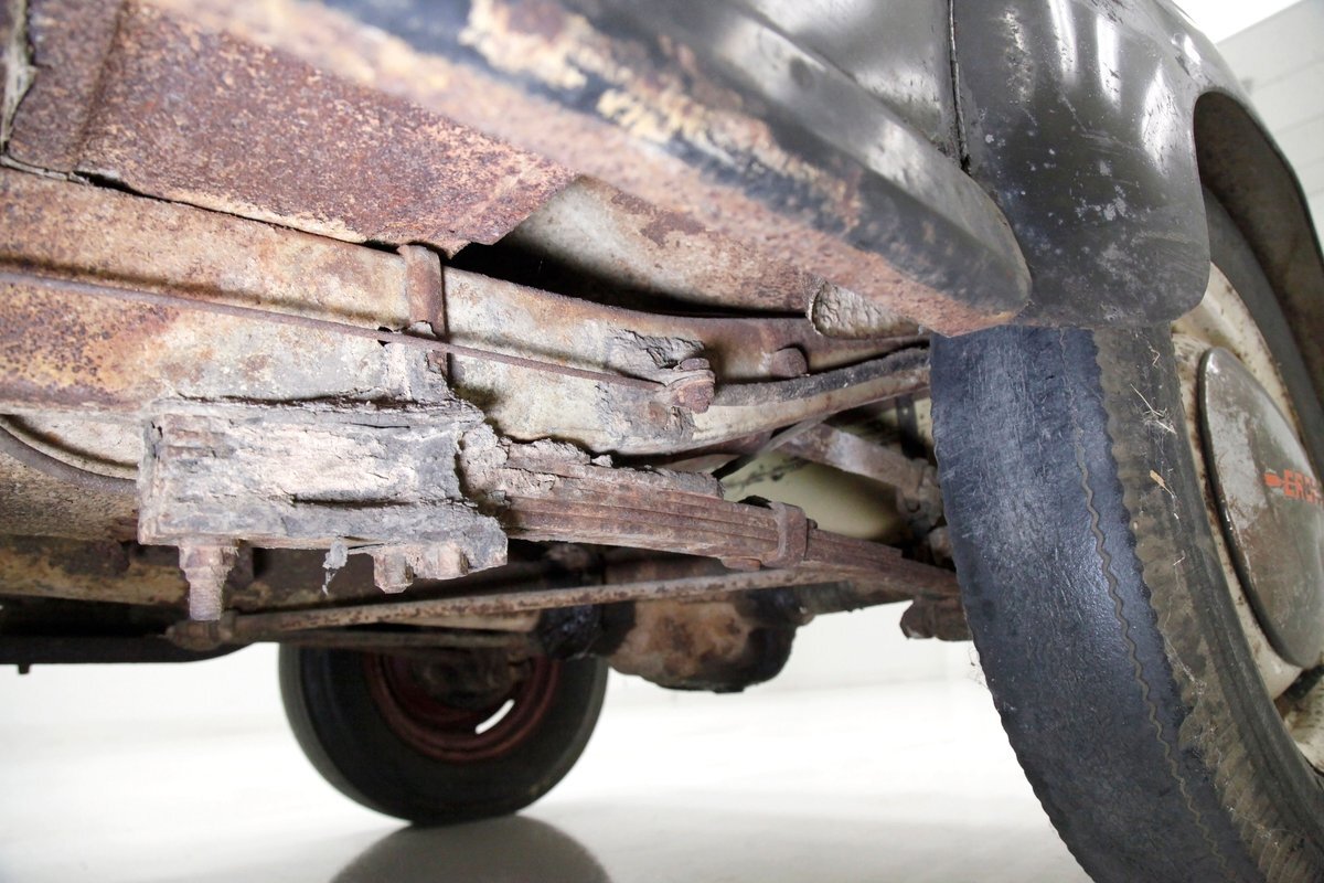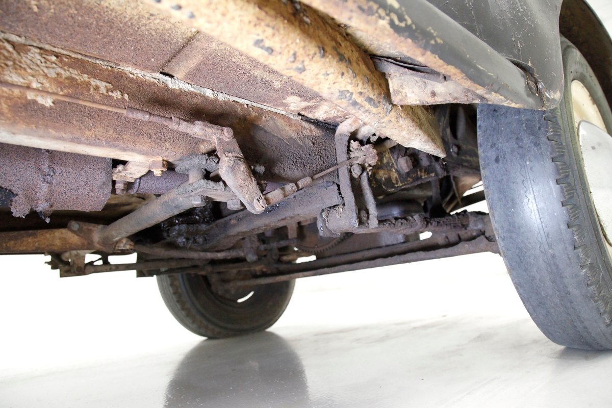 A healthy dose of patina, surface rust and some invasive rust on the flooring greets us with a look underneath. The frame structure appears solid, but a serious amount of investigation should be performed to verify everything is intact. Leaf spring suspension is seen up front and in the rear are quarter elliptical leaf springs. Drum brakes are noted on all 4's.