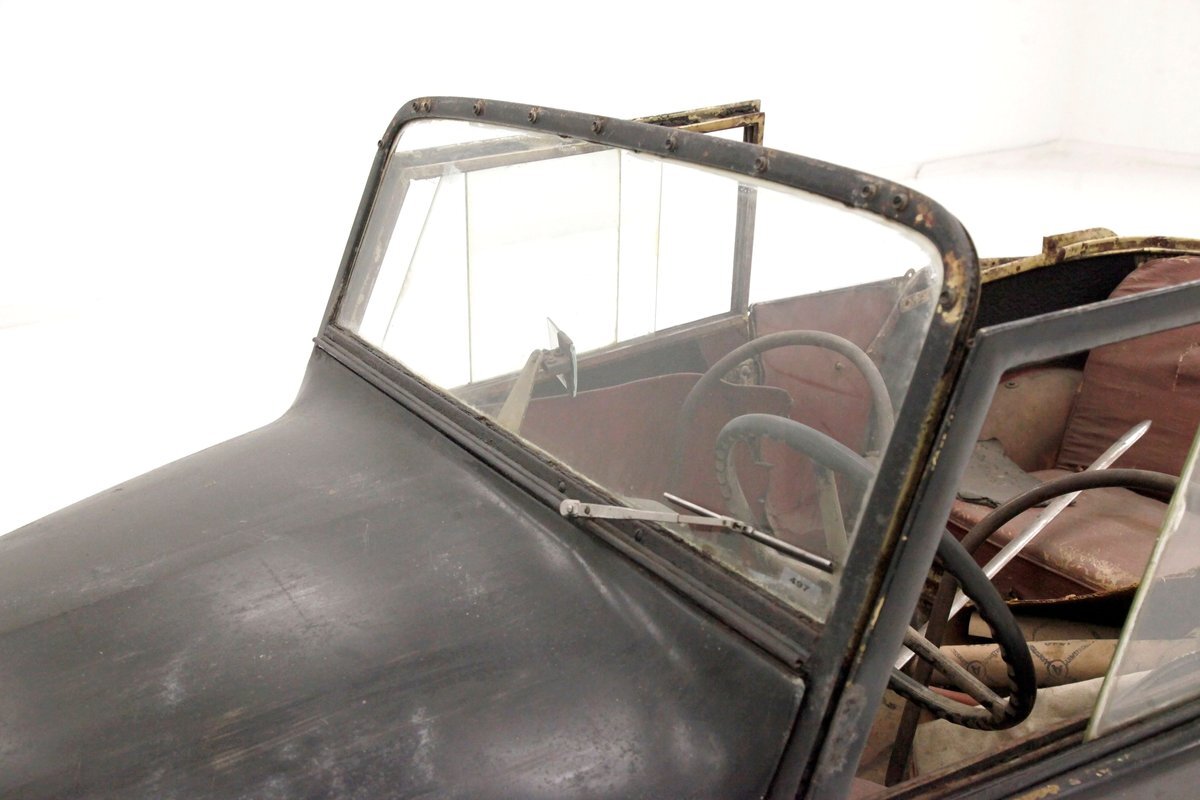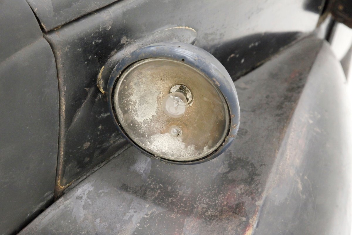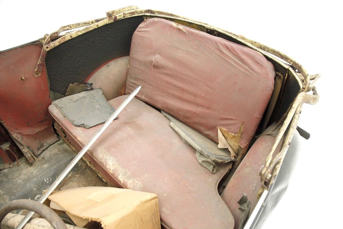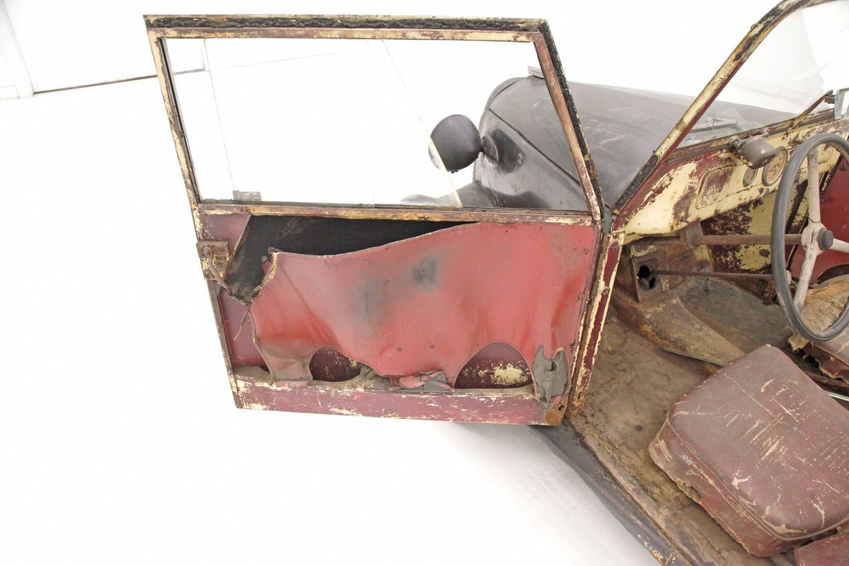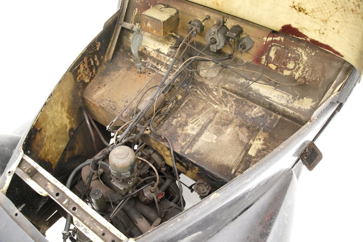 Small and quirky would best describe this pint sized drop top. This example shows as unrestored in a patina riddled black finish overtop the factory Sequoia Cream. Dents and dings abound with evidence of body filler in a few areas but no invasive rust is seen. Much smaller scale than other cars of the day, but still using similar styling with pontoon fenders with horizontal grille bars cut in down low on the front and an overall beaked appearance to the leading edge of the car and V-shaped hood. Brackets for the front bumper are seen but the bumper itself is long gone. The fenders slowly thin as they dip down and melt into the pint sized running boards under the cabriolet style framed doors. These running boards thin out as they run rearward and meet up with the arched rear fenders. Chrome is kept to a minimum with only the door handles and rear passenger compartment surround being bedecked as such. The framework for the manually folding top is present but the canvas covering is gone. Moving around back we note a stylish body tub, reminiscent of the Ford convertible sedans of a few years earlier, with a single tail light on the left hand side and a mustache thin bumper in black below. A mix of red and cream painted 12-inch wheels with chrome Crosley moon capped centers are on all 4 corners to finish things off.
