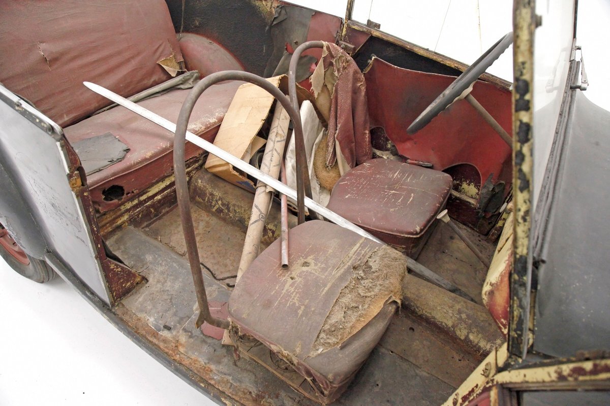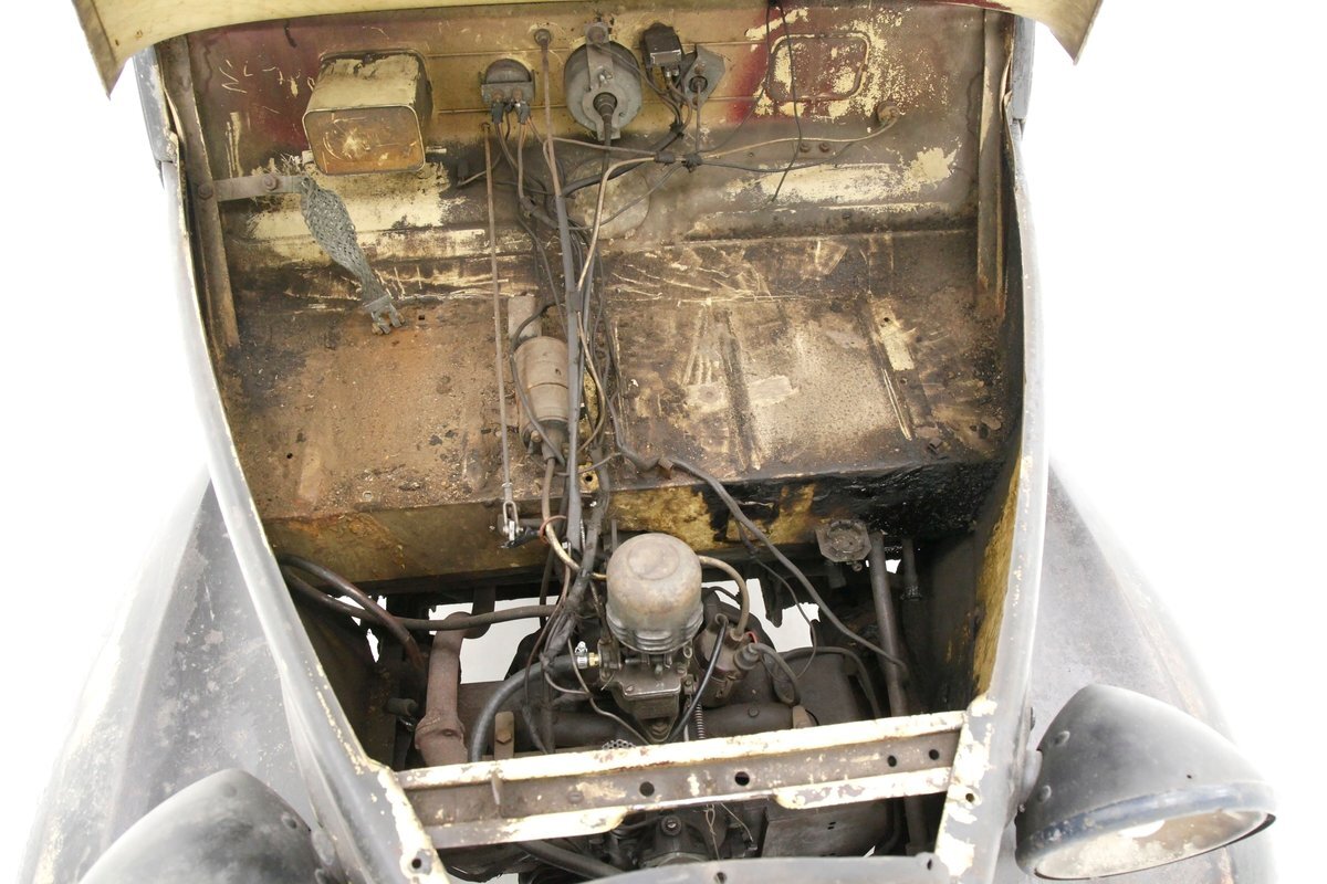 A lift of the mini hood reveals an unrestored engine bay that holds a 35.3ci air cooled flat 2 cylinder engine. This tiny mill is capable of producing 12hp and is fed by a 1-barrel carburetor. A bit of trivia for those out of the know...the flywheel design, while not only coupling the engine to the transmission also works to help keep the engine cool. Think of it as a fan of sorts. The engine is backed up by a three-speed transmission which sends power to a 5.40 geared rear axle.