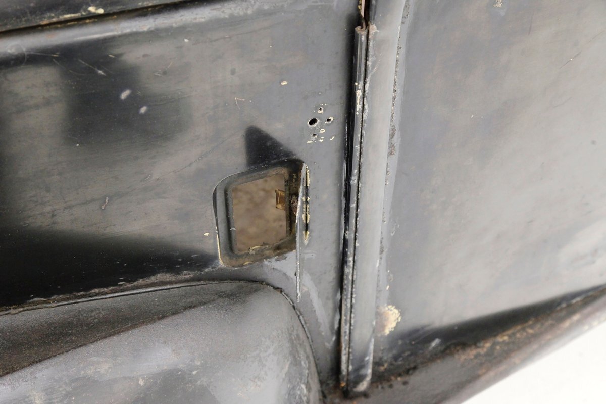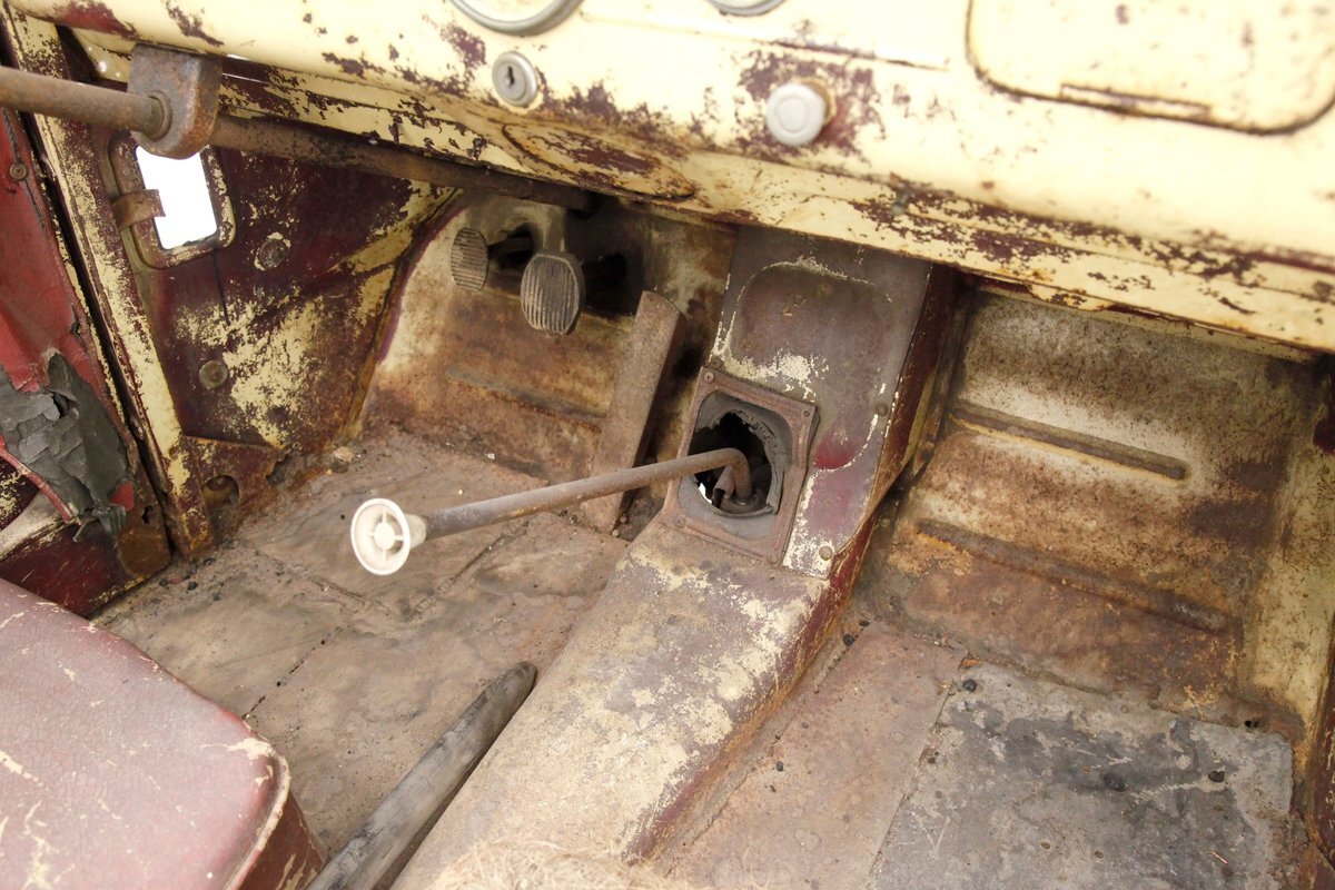 Swinging open the light but long doors we see the remnants of 2 low back buckets covered with red vinyl and in the back we see a simple red bench. The seats are in need of recovering with the front buckets missing their upper padding and vinyl covers. These are fronted by a Sequoia Cream metal dash with tri of aged white faced Crosley gauges in dash central. A few knobs and pulls surround the gauges as well as the ignition switch. Facing the passenger is a small metal glovebox door. Surface rust and steel patches make up the flooring and from under the dash rises the long arm black shifter. Rounding out our tour are worn and tattered red vinyl door panels and rear side panels, all in need of replacing.