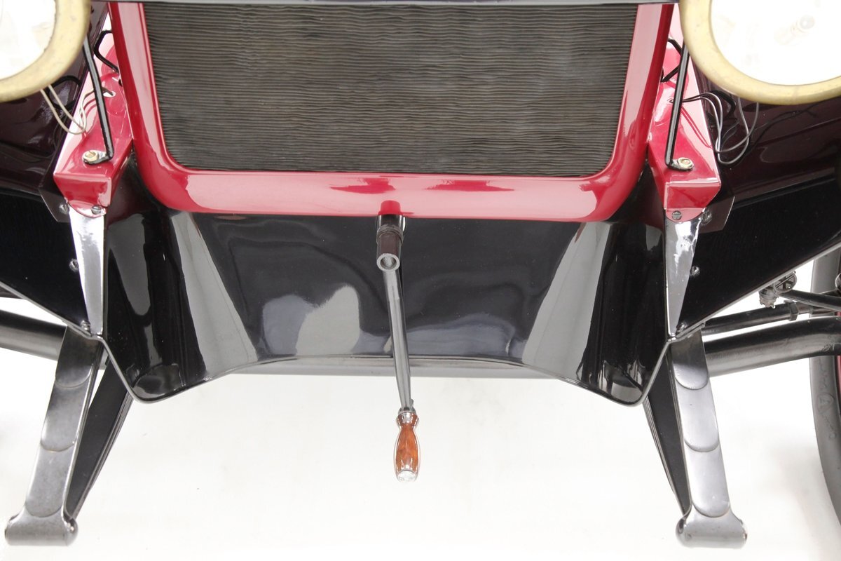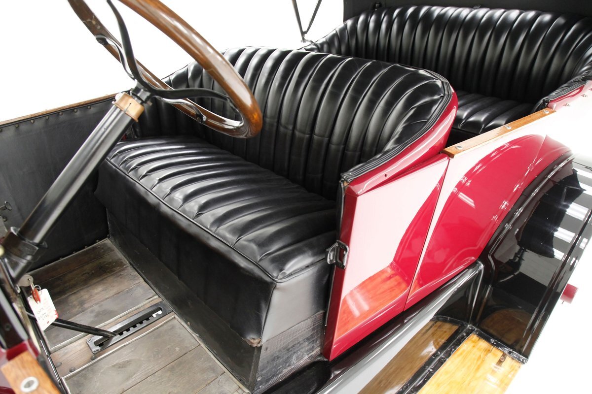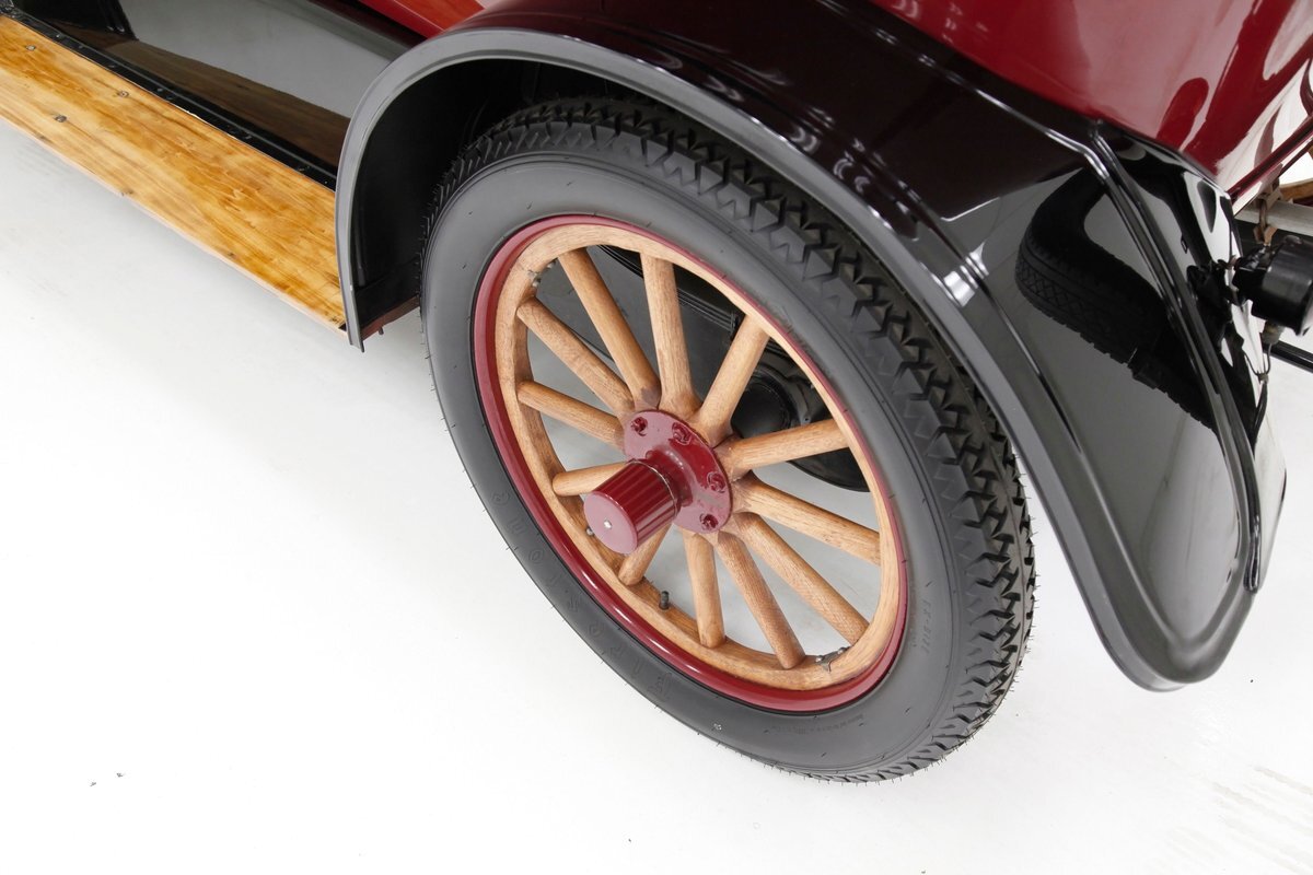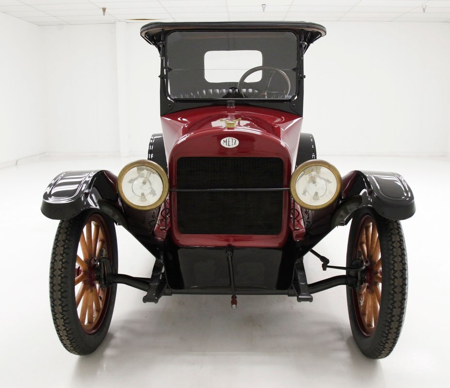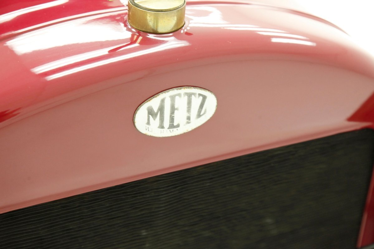 Automobiling was in its growth spurt in the 19-teens with over 485,000 of the world's 606,000 cars having been produced in the good old US of A. With its simply designed "tub" this 4-door convertible touring sedan is straight, and the paint is maroon on the body which presents nicely. Curvaceous fenders attached to long running boards adorn each side of this tub and are sprayed in black. These running boards have highly lacquered wood inlays for the steps which highlight the black steel perfectly. The long hood in its cowling style is fronted by a maroon radiator surround, Metz badging, and brass radiator cap. 2 simple large brass trimmed can headlights flank the grille, and float above the front fenders. Black canvas makes up the foldable roof over the passengers and shows without any flaws. In the back attached to the body tub is a single spare tire and a small round taillight decorates the driver's rear fender. 30" glossy wood spoke wheels adorn the 4 corners and are shod in 30x3.5" blackwall rubber.