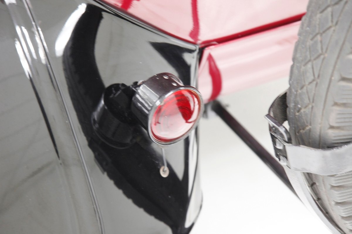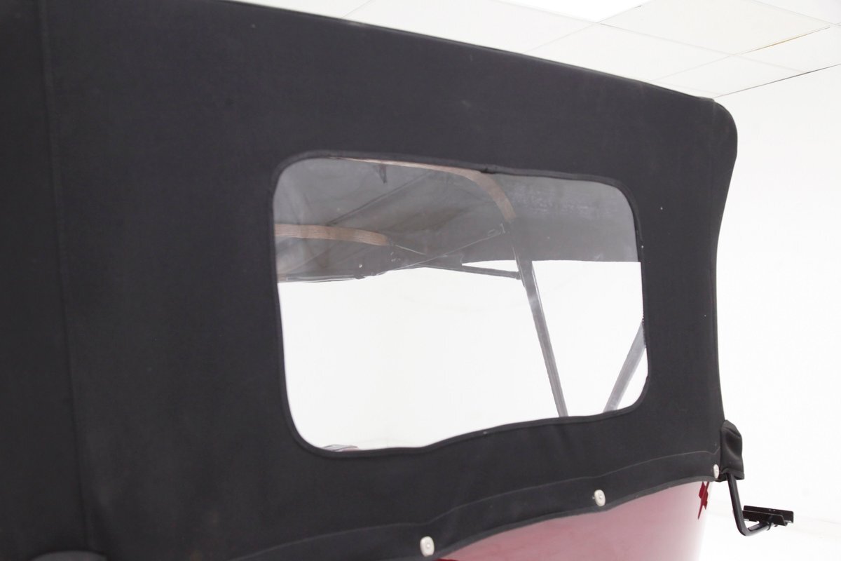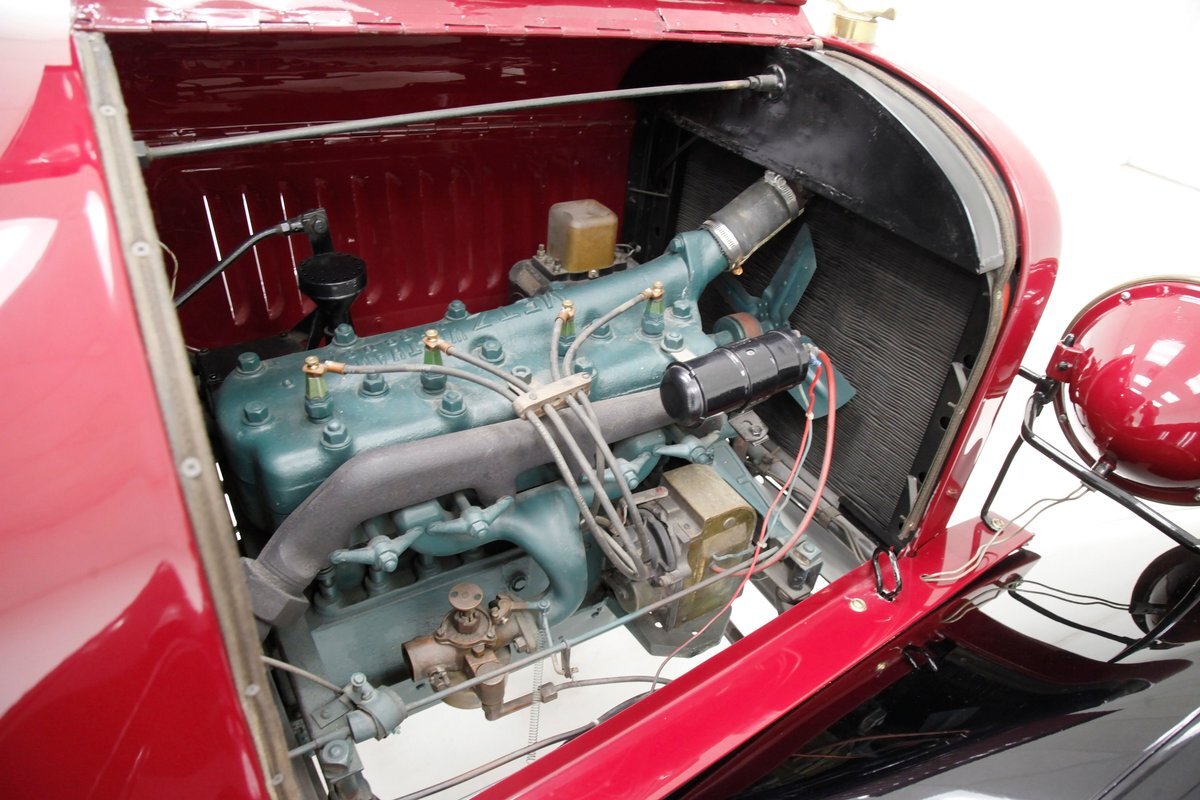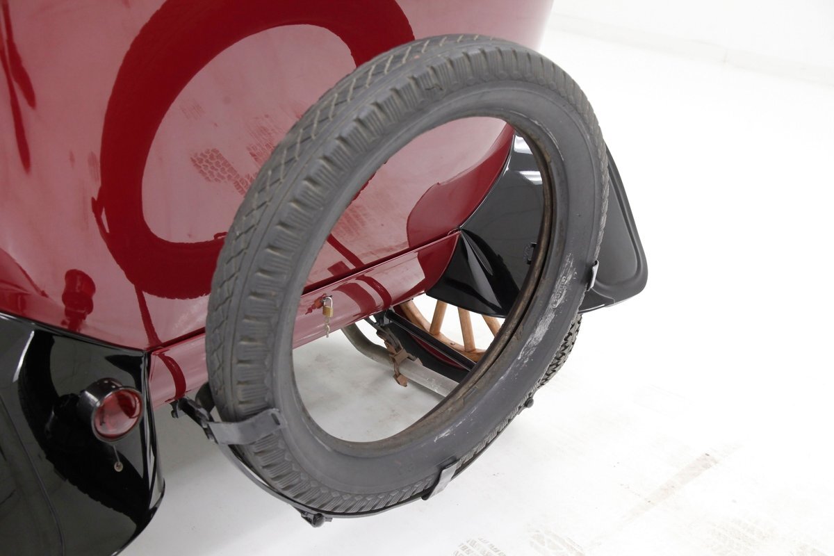 Automobiling was in its growth spurt in the 19-teens with over 485,000 of the world's 606,000 cars having been produced in the good old US of A. With its simply designed "tub" this 4-door convertible touring sedan is straight, and the paint is maroon on the body which presents nicely. Curvaceous fenders attached to long running boards adorn each side of this tub and are sprayed in black. These running boards have highly lacquered wood inlays for the steps which highlight the black steel perfectly. The long hood in its cowling style is fronted by a maroon radiator surround, Metz badging, and brass radiator cap. 2 simple large brass trimmed can headlights flank the grille, and float above the front fenders. Black canvas makes up the foldable roof over the passengers and shows without any flaws. In the back attached to the body tub is a single spare tire and a small round taillight decorates the driver's rear fender. 30" glossy wood spoke wheels adorn the 4 corners and are shod in 30x3.5" blackwall rubber.