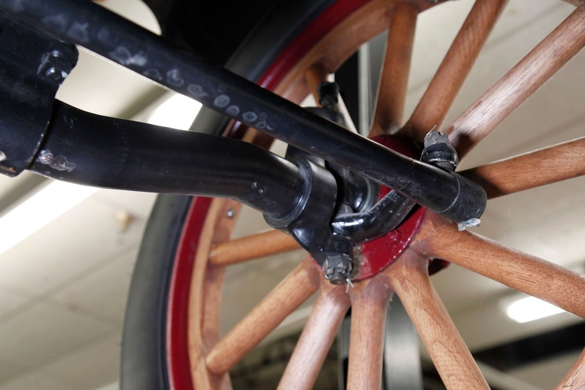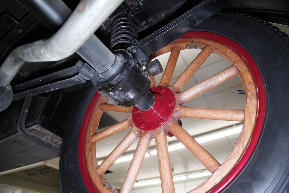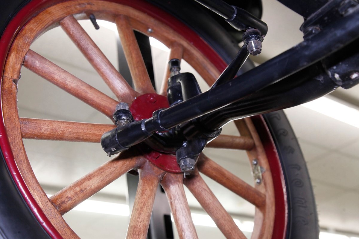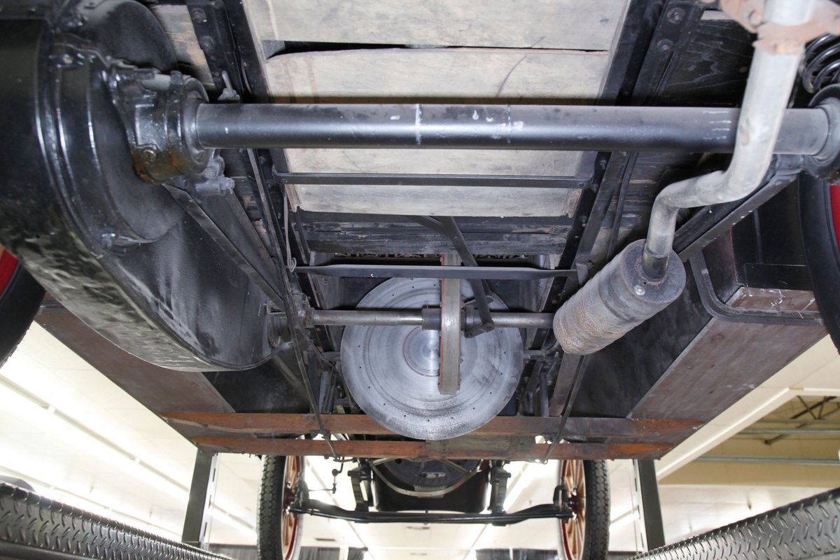 This is where things get interesting, featuring a 188.7ci L-head 4 cylinder. This aqua painted mill is fed by a 1bbl carburetor, and a direct-drive shaft leads rearward. New ideas were in vogue during the early days of motoring and Metz was far ahead of its time. In place of a traditional transmission, or even a planetary style transmission we see a simple steel disc. A drive wheel, actuated by the shift lever above is designed to move inward and outward on the steel disc thus increasing rotational speeds sent to the 4.00 geared rear axle via the single drive chain. A precursor to the CVT transmissions of today if you will. Absolutely one of the nicest drivetrain restorations I've seen come through the doors here at Classic Auto Mall. With supple hoses and wires this engine is in near Concours condition.