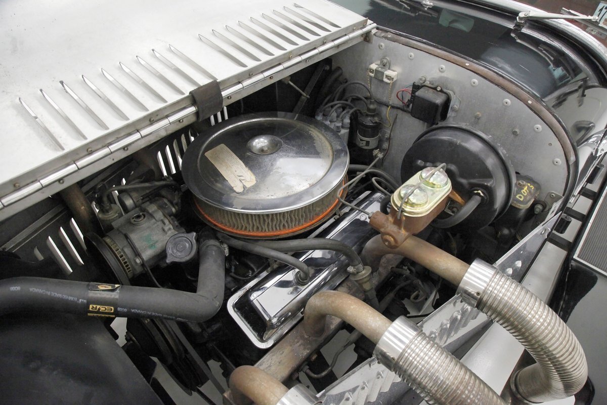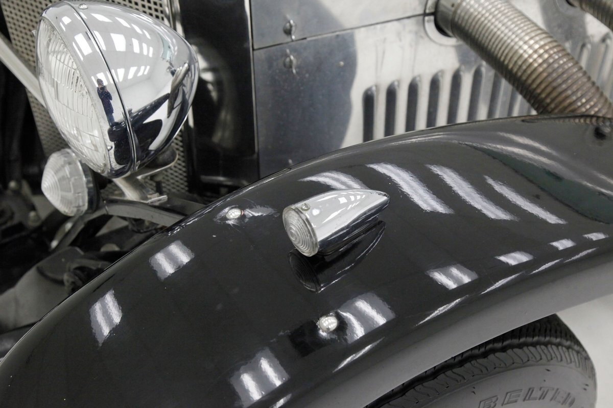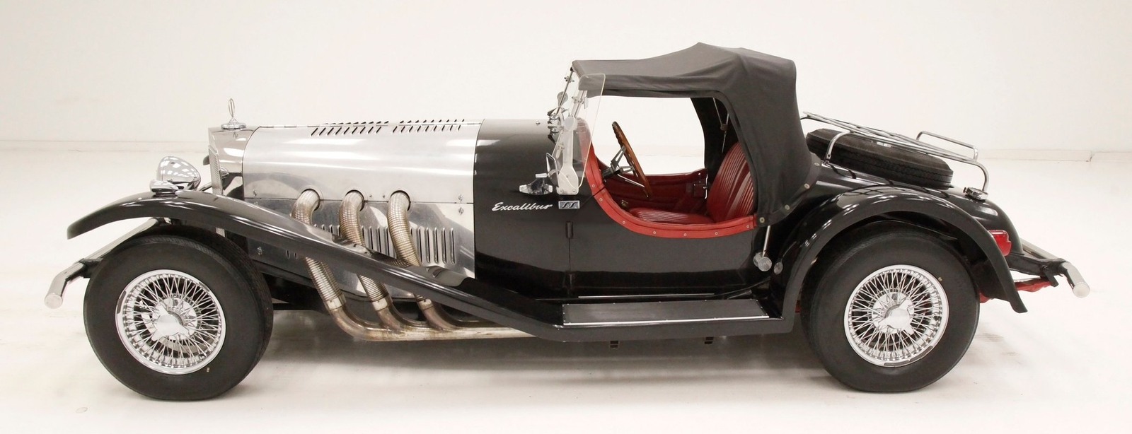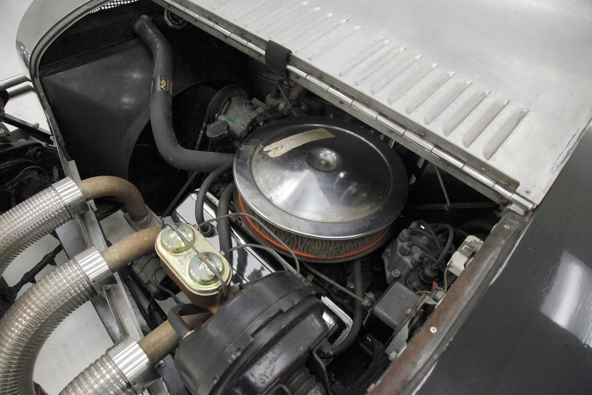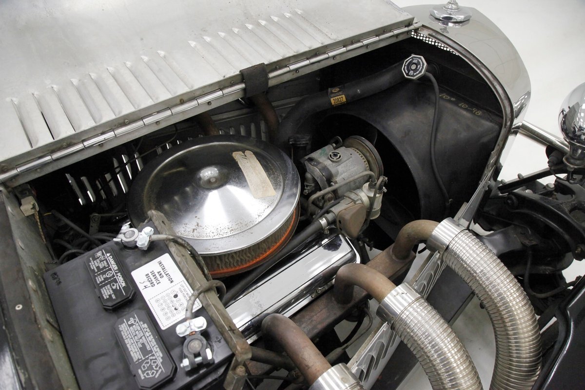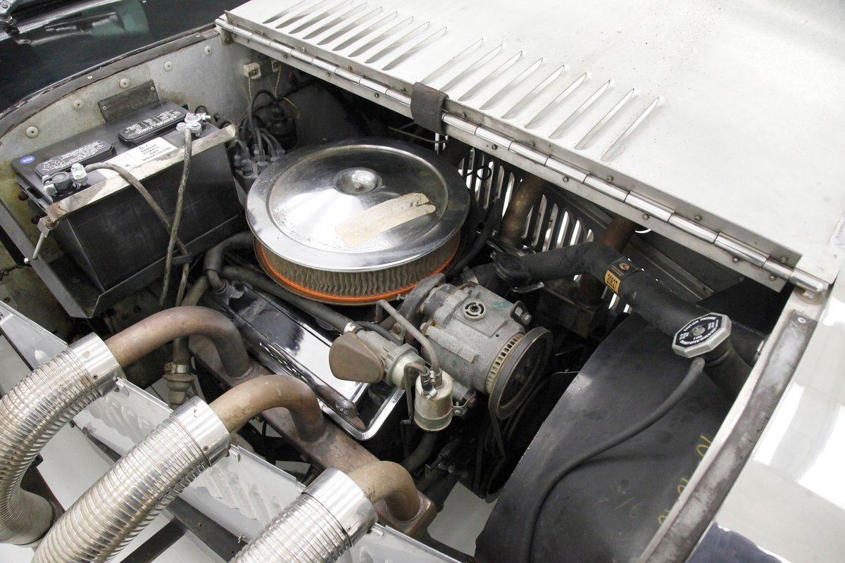 A long cowl makes its way rearward from the chromed grille and radiator surround with vertical ribs. Cord-esque exhaust pipes emanate from either side of the cowl and go exterior to eventually work their way horizontally through the running boards to the back of the car. The hood and cowl are polished aluminum and the exterior mounted fenders are painted black. Also the passenger compartment and trunk area are in black. A black convertible top is on and shiny chrome bumpers protect chromed wire wheels with knock off hubs. A chrome luggage rack is on the back.