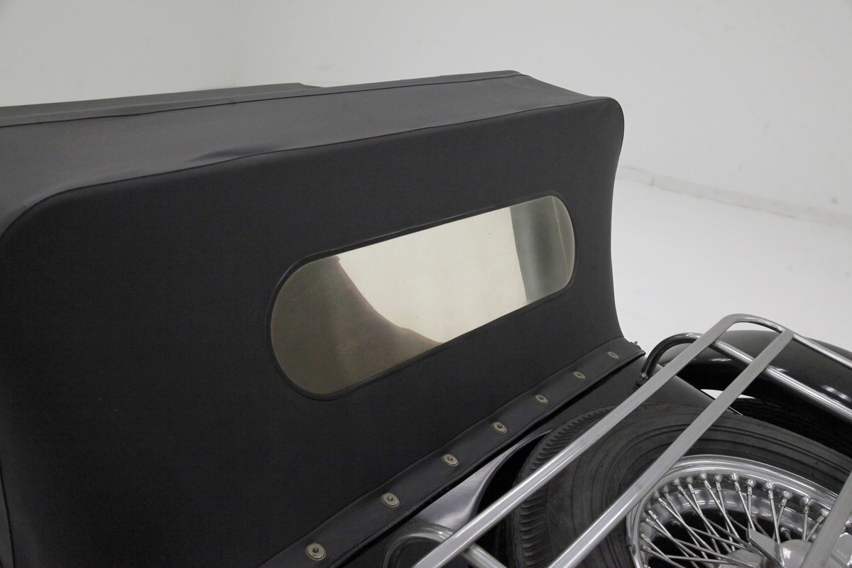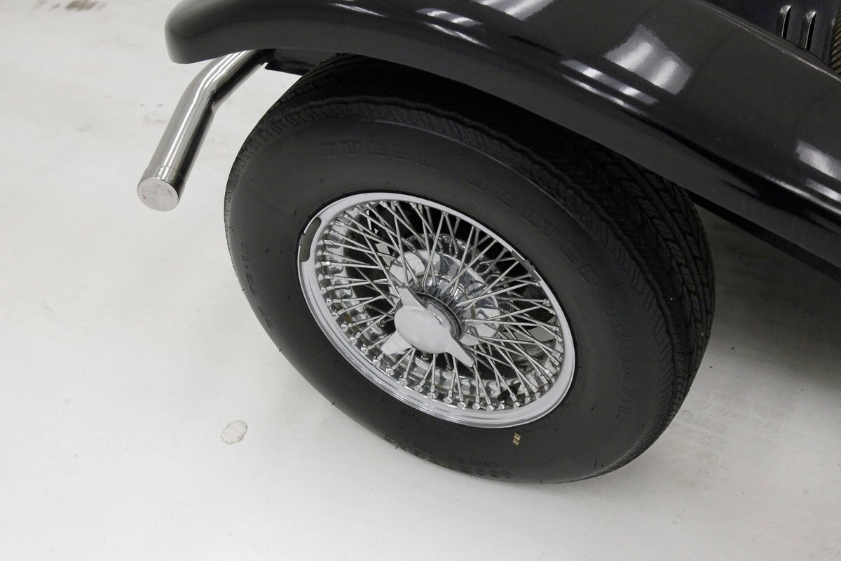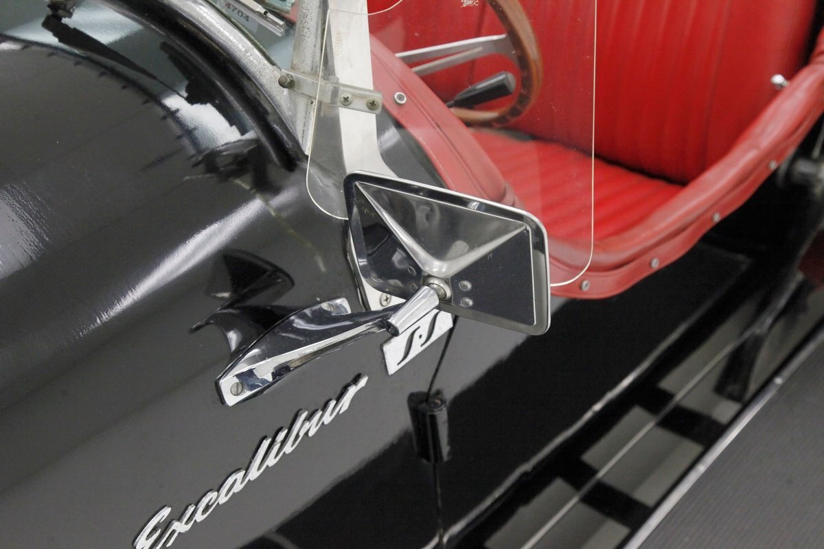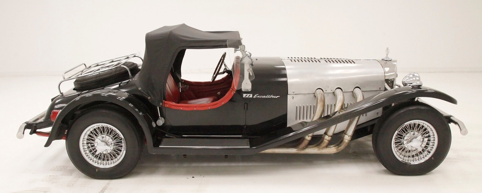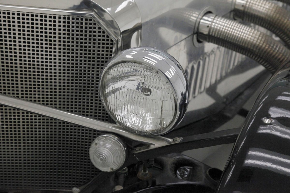 A long cowl makes its way rearward from the chromed grille and radiator surround with vertical ribs. Cord-esque exhaust pipes emanate from either side of the cowl and go exterior to eventually work their way horizontally through the running boards to the back of the car. The hood and cowl are polished aluminum and the exterior mounted fenders are painted black. Also the passenger compartment and trunk area are in black. A black convertible top is on and shiny chrome bumpers protect chromed wire wheels with knock off hubs. A chrome luggage rack is on the back.