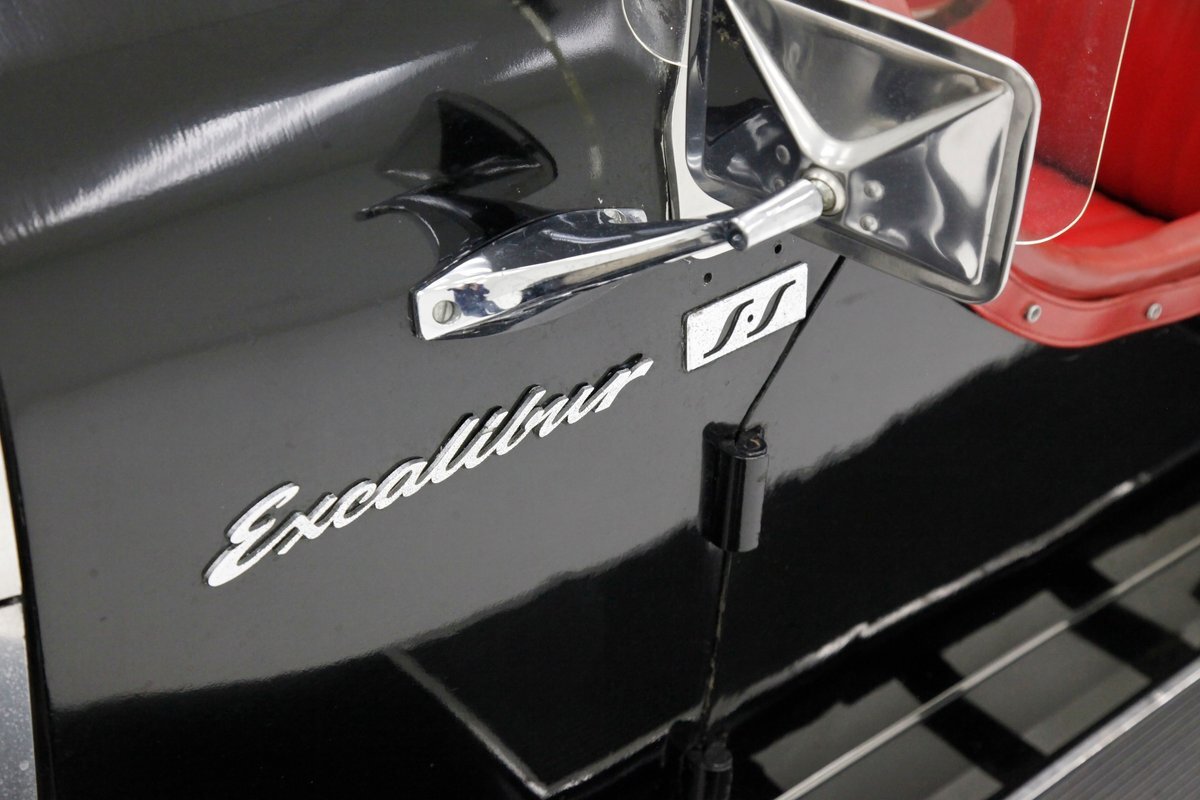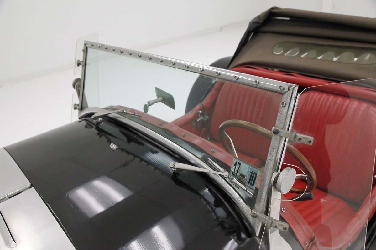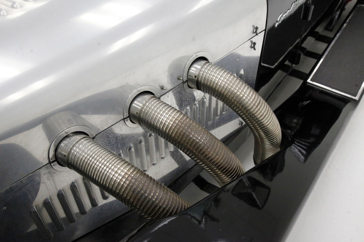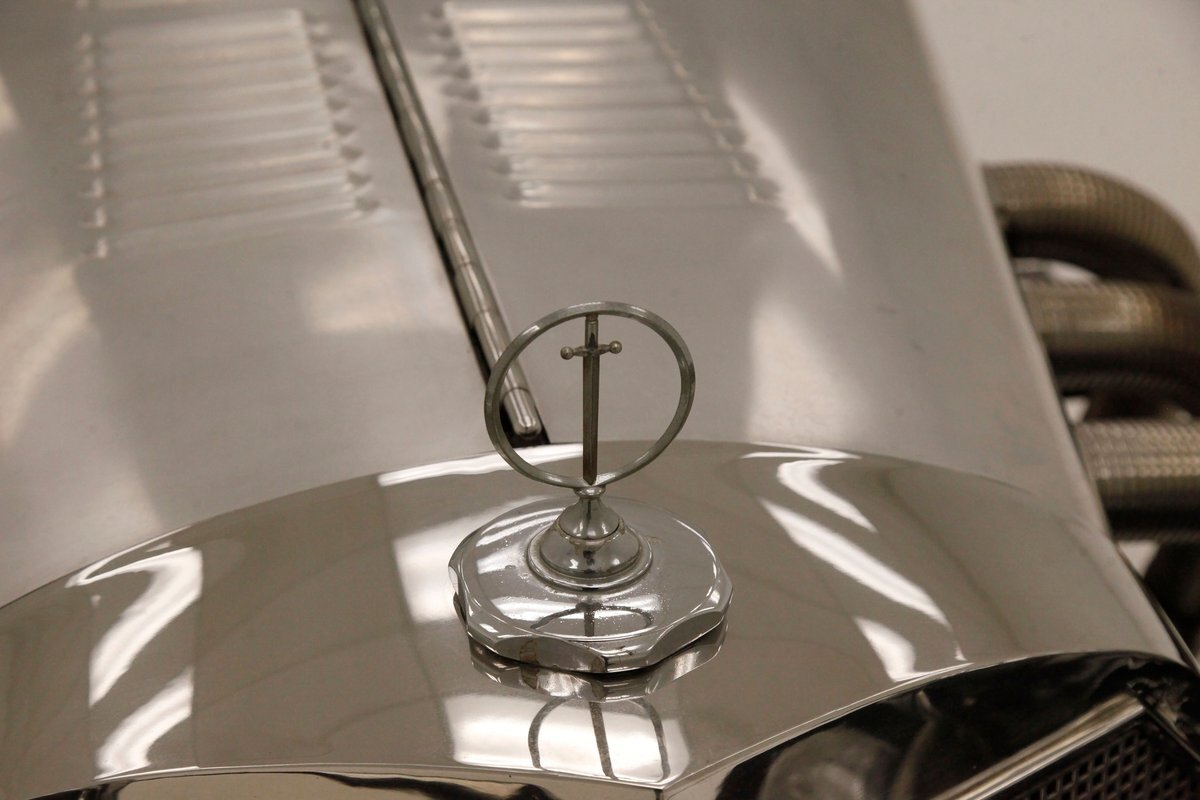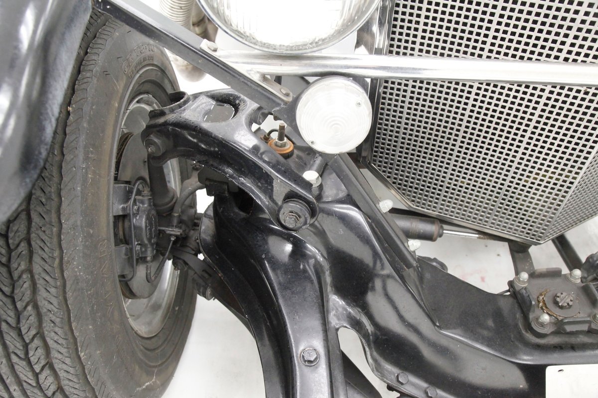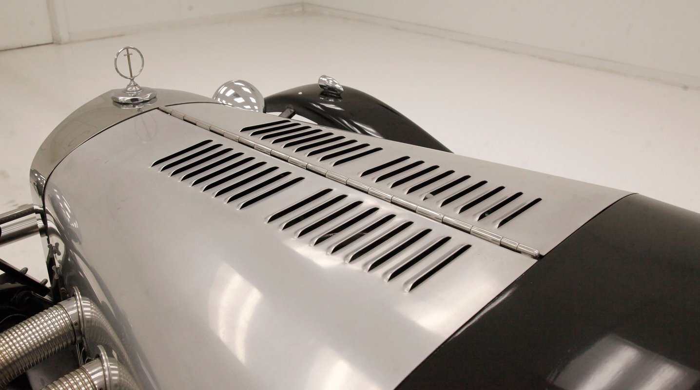 A long cowl makes its way rearward from the chromed grille and radiator surround with vertical ribs. Cord-esque exhaust pipes emanate from either side of the cowl and go exterior to eventually work their way horizontally through the running boards to the back of the car. The hood and cowl are polished aluminum and the exterior mounted fenders are painted black. Also the passenger compartment and trunk area are in black. A black convertible top is on and shiny chrome bumpers protect chromed wire wheels with knock off hubs. A chrome luggage rack is on the back.